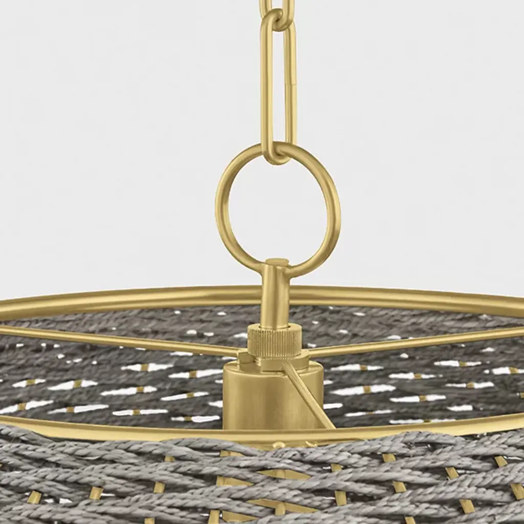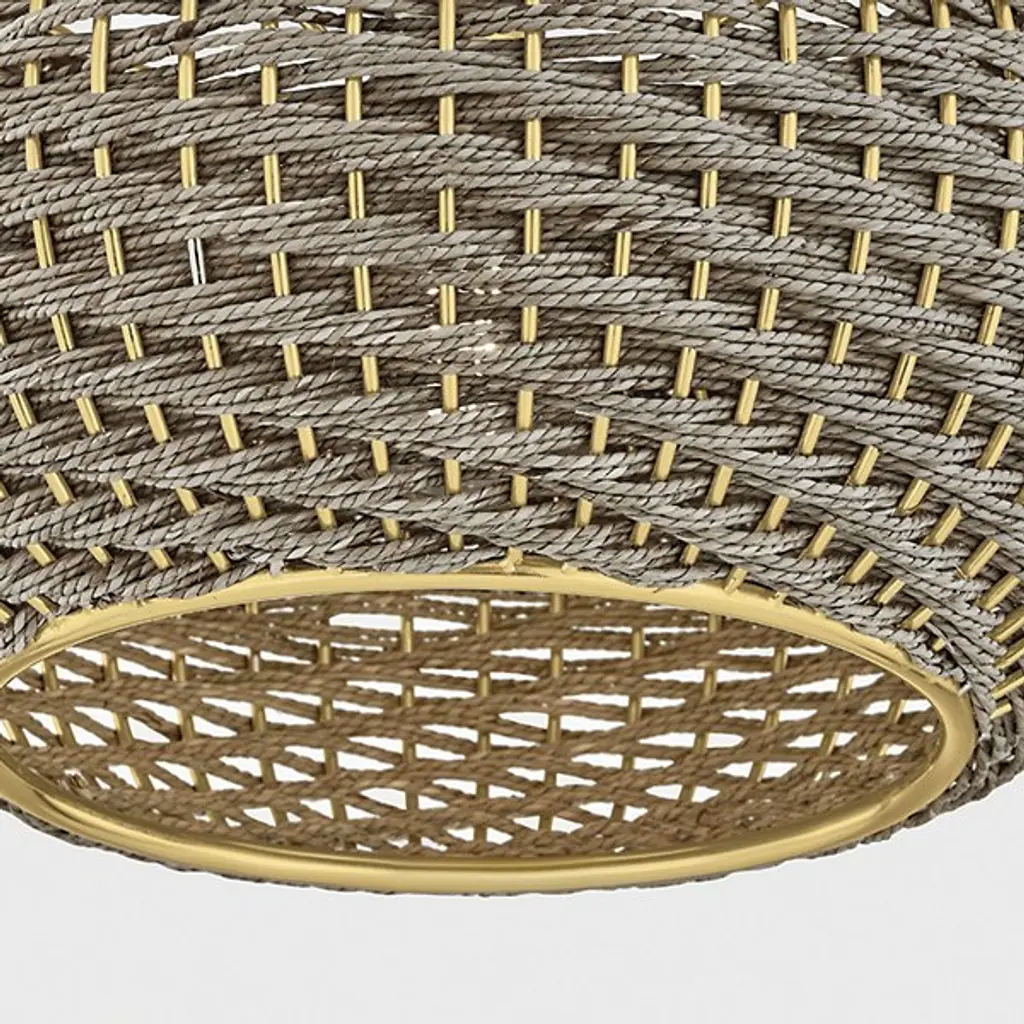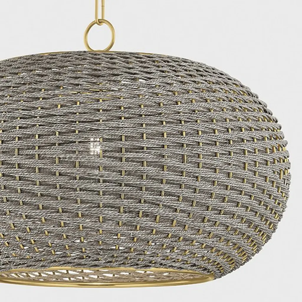 The Penarth Pendant from Hudson Valley Lighting showcases finely woven seagrass string arranged in a diagonal pattern that creates a captivating spiral movement throughout the shade. This geometric weaving turns a natural material into a structured form that feels both organic and ordered. Suspended from a chain with a round canopy, the dome-shaped pendant allows light to peek through the woven texture, creating a warm, patterned glow. The bottom rim provides structural support while adding a finishing touch to the natural material. Each handwoven shade contains subtle variations that make every piece unique while maintaining the collection's sophisticated character.