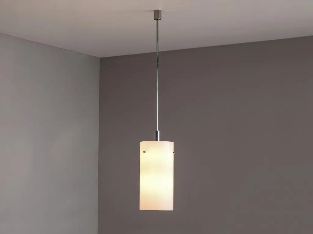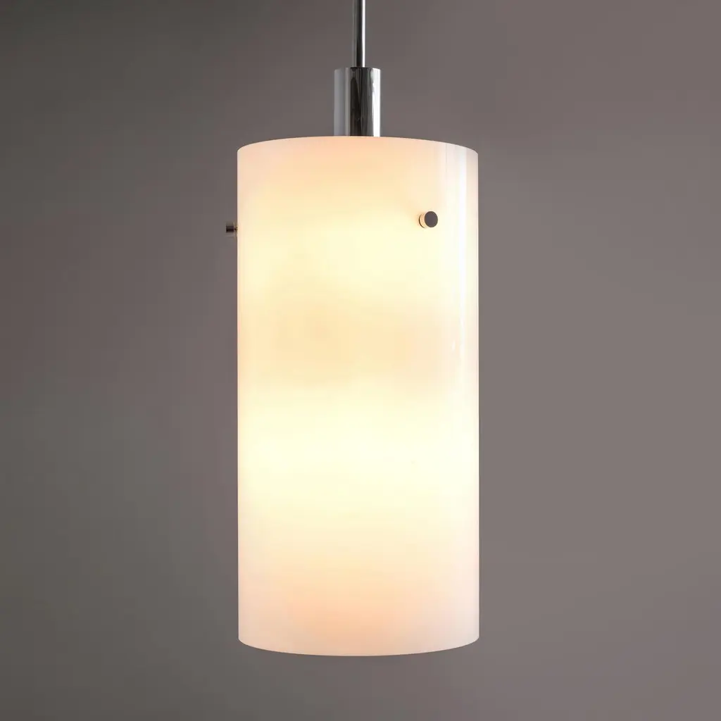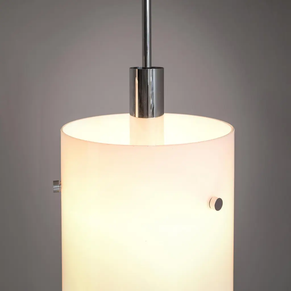 Pendant, metal, glass, Europe, 1970sThis atmospheric pendant is cylindrically shaped and executed in white glass, which results in a nice soft light-tone creating a lively ambience in the room. The fixture is based on a minimalist design made of chromed steel that contributes to the pendant’s clear and subtle appearance. The lamps can be hung in an entranceway in order to make an impression or serve as a way to enlighten any interior in a fine manner. Please note that we have more items of this model in stock. Therefore, this lamp is an excellent option to illuminate a large space. The listed price, is the price per item.