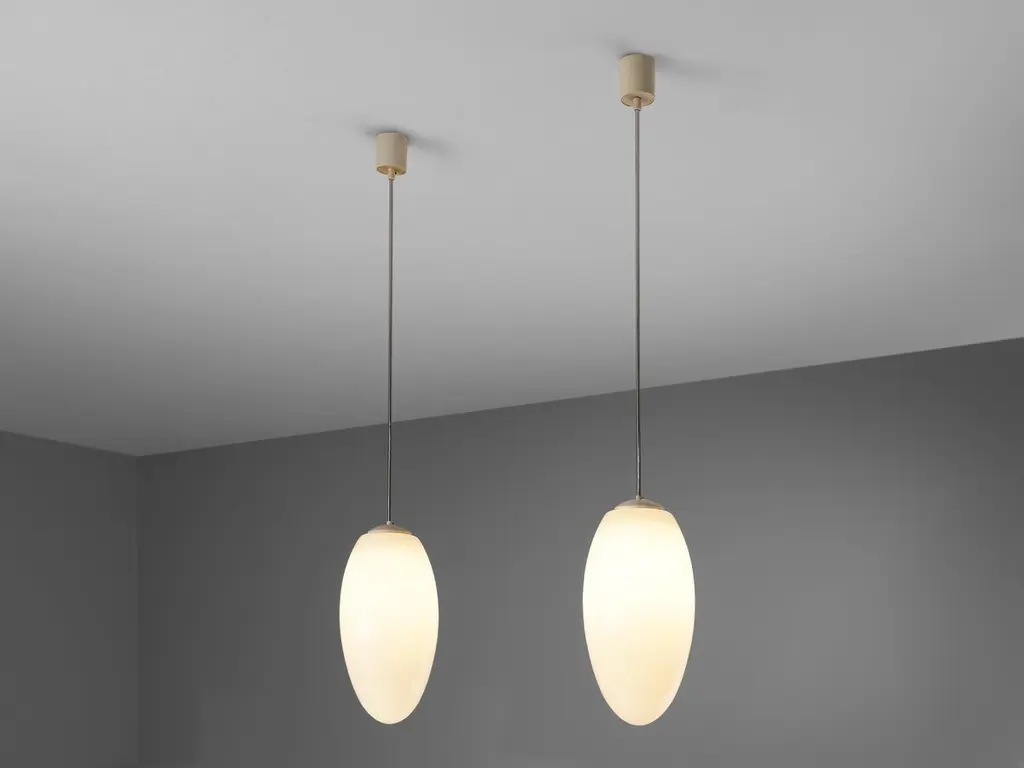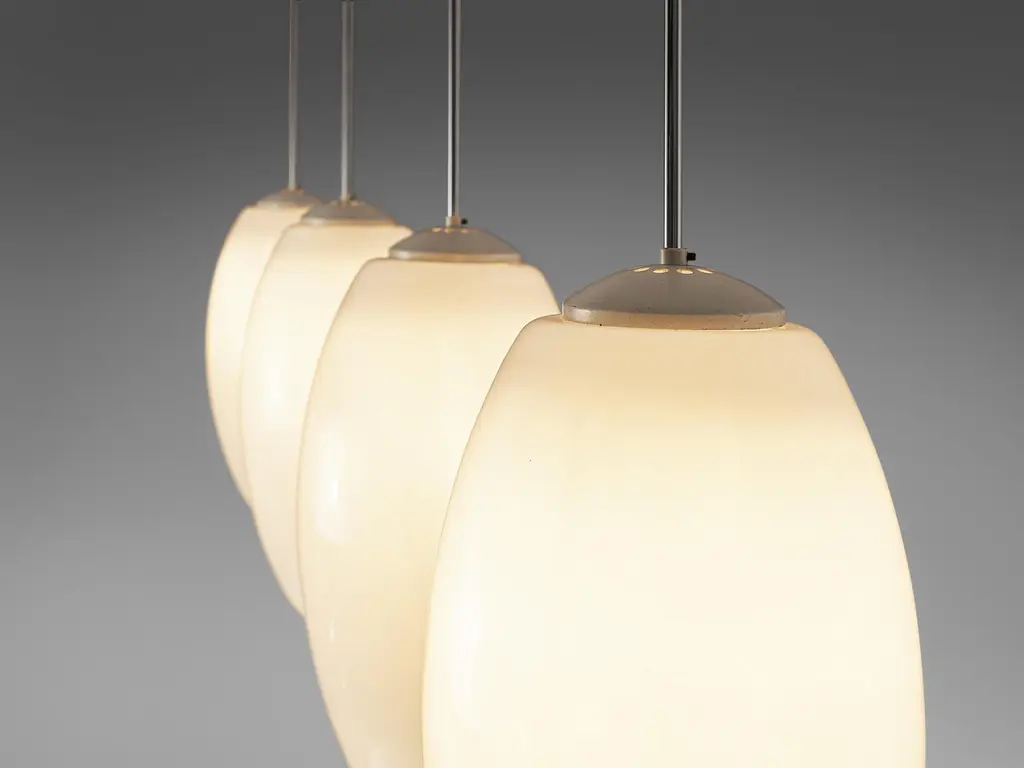 Pendant lamps, metal, opaline glass, plastic, Europe, 1970sBeautiful in their design and displaying an understated elegance: minimalist pendant lamps adorned with drop-shaped glass shades. Suspended delicately from metal stems culminating in cylindrical ceiling fixtures, these lamps exude an air of sophistication and refinement. With each luminous glow, these pendant lamps cast a timeless allure and inviting charm.Please note that we have a large amount of these lamps in our current collection, perfect for a larger space or project. The price listed is the price per item. Kindly be aware that these pieces are in good, used condition.
