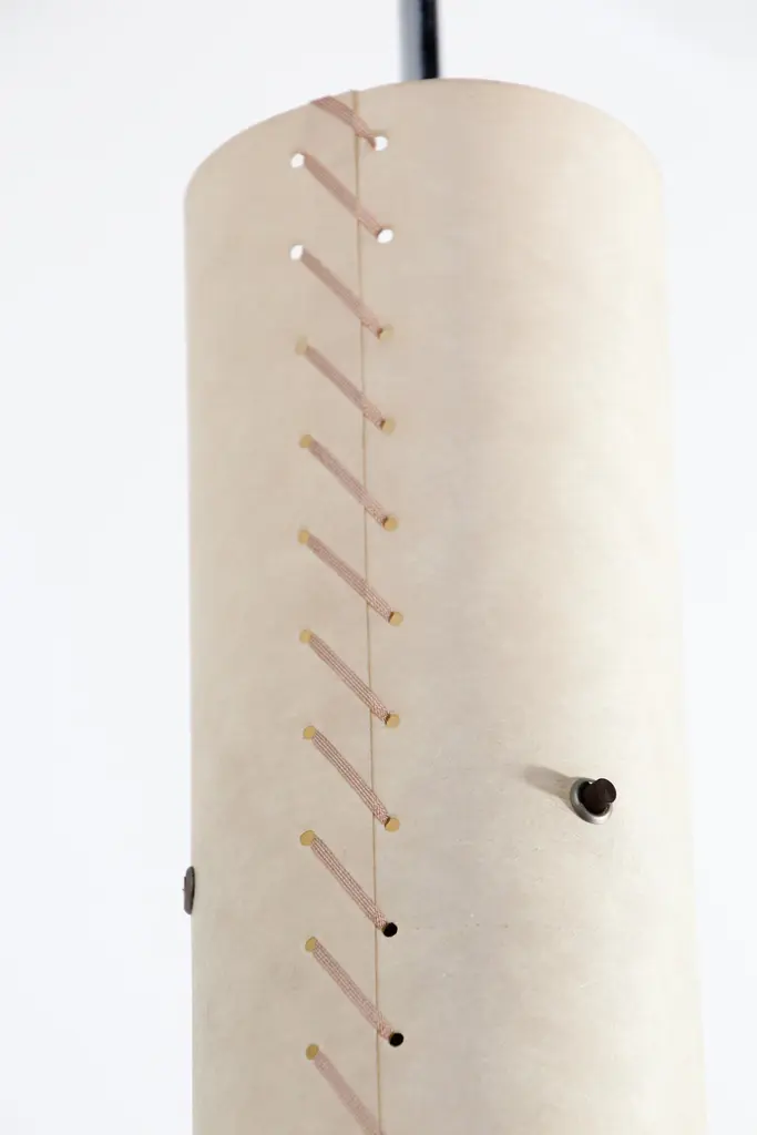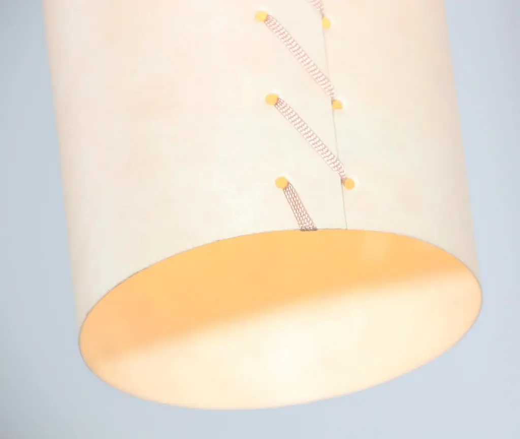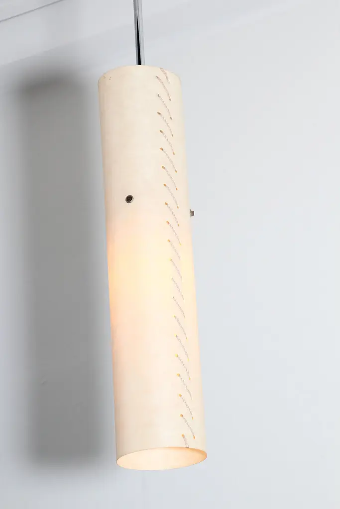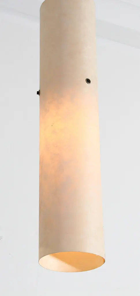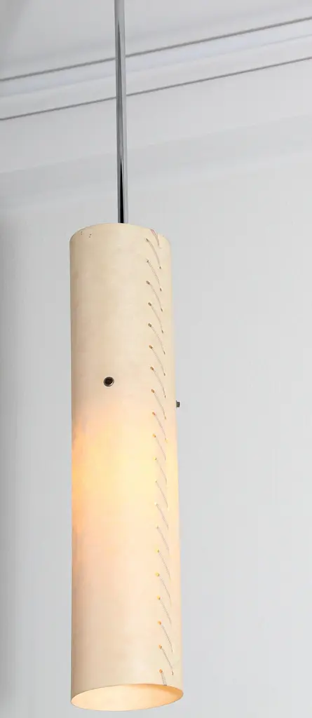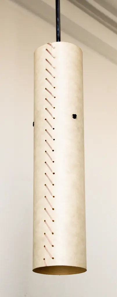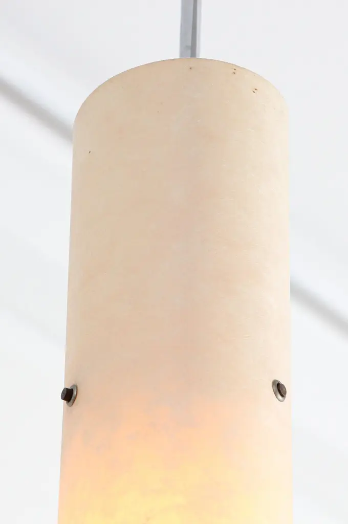 Pendant lamp in the style of Gabriel Ordeig Cole for Santa and ColeIts shade made of stitched parchment with visible seams.Originally designed for a famous haunt of Barcelona night-life in the 1980s, the fondness for this lamp has lasted down the years.In the style of the Sistema Sisisi MT2 pendant light with lampshade stitched parchment.The pendant features a minimalist design that can tie into a multitude of spaces. Ever since the early 1970s, Santa & Cole has championed the use of ribbon shades to embellish all manner of light sources.4 pendants available, price is for 1.Shade is 17" height x 4" diameterlength with cord: up to 46".Canopy is 6" H.