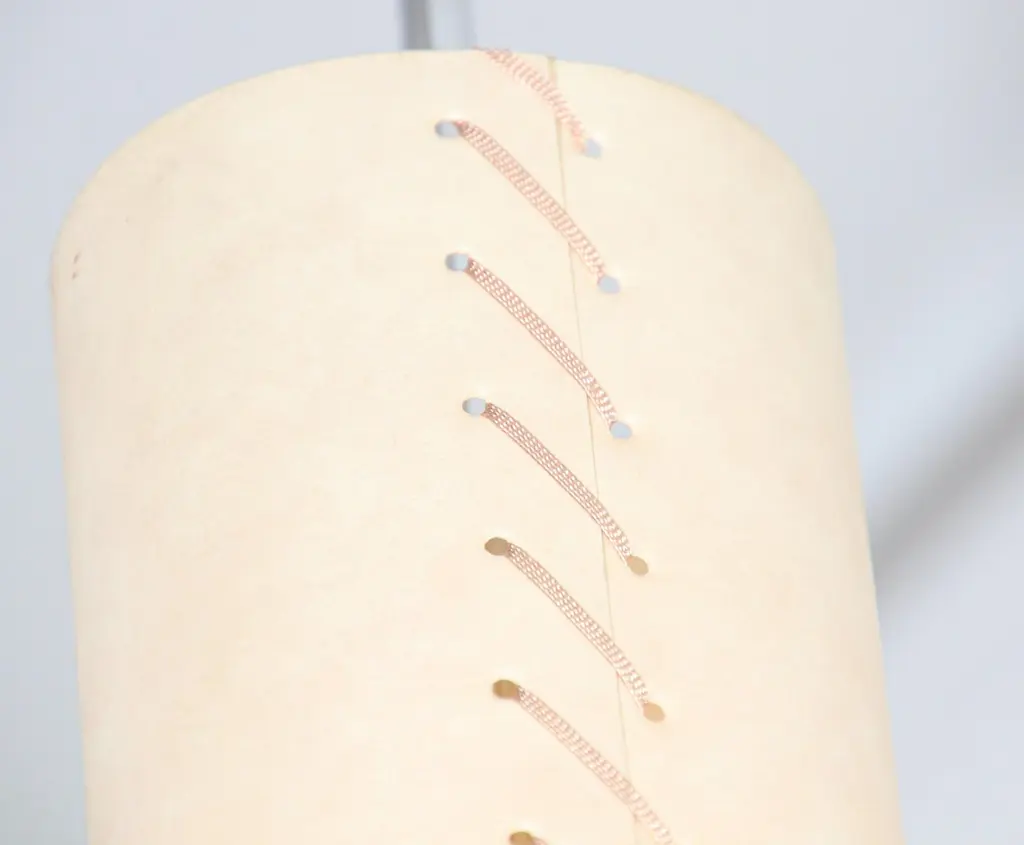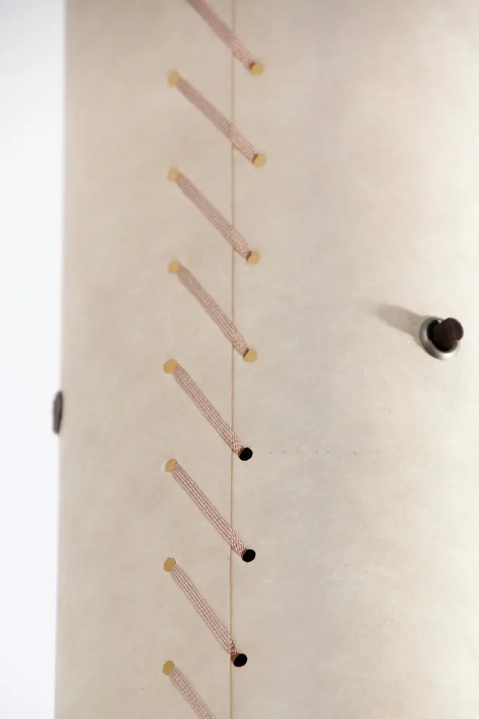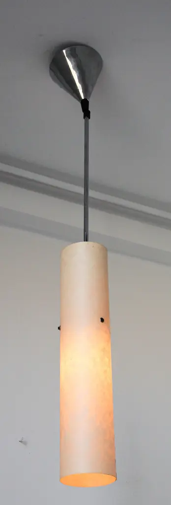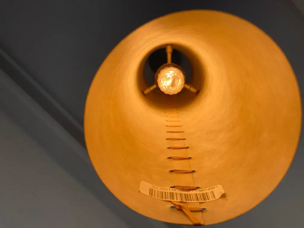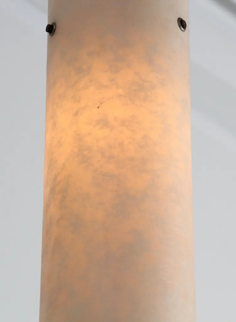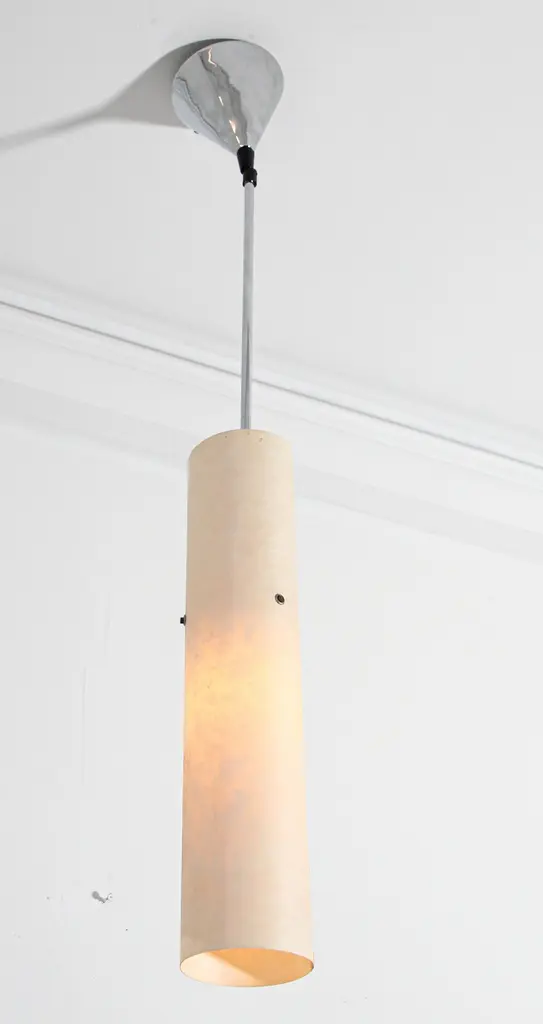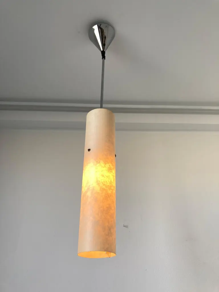 Pendant lamp in the style of Gabriel Ordeig Cole for Santa and ColeIts shade made of stitched parchment with visible seams.Originally designed for a famous haunt of Barcelona night-life in the 1980s, the fondness for this lamp has lasted down the years.In the style of the Sistema Sisisi MT2 pendant light with lampshade stitched parchment.The pendant features a minimalist design that can tie into a multitude of spaces. Ever since the early 1970s, Santa & Cole has championed the use of ribbon shades to embellish all manner of light sources.4 pendants available, price is for 1.Shade is 17" height x 4" diameterlength with cord: up to 46".Canopy is 6" H.