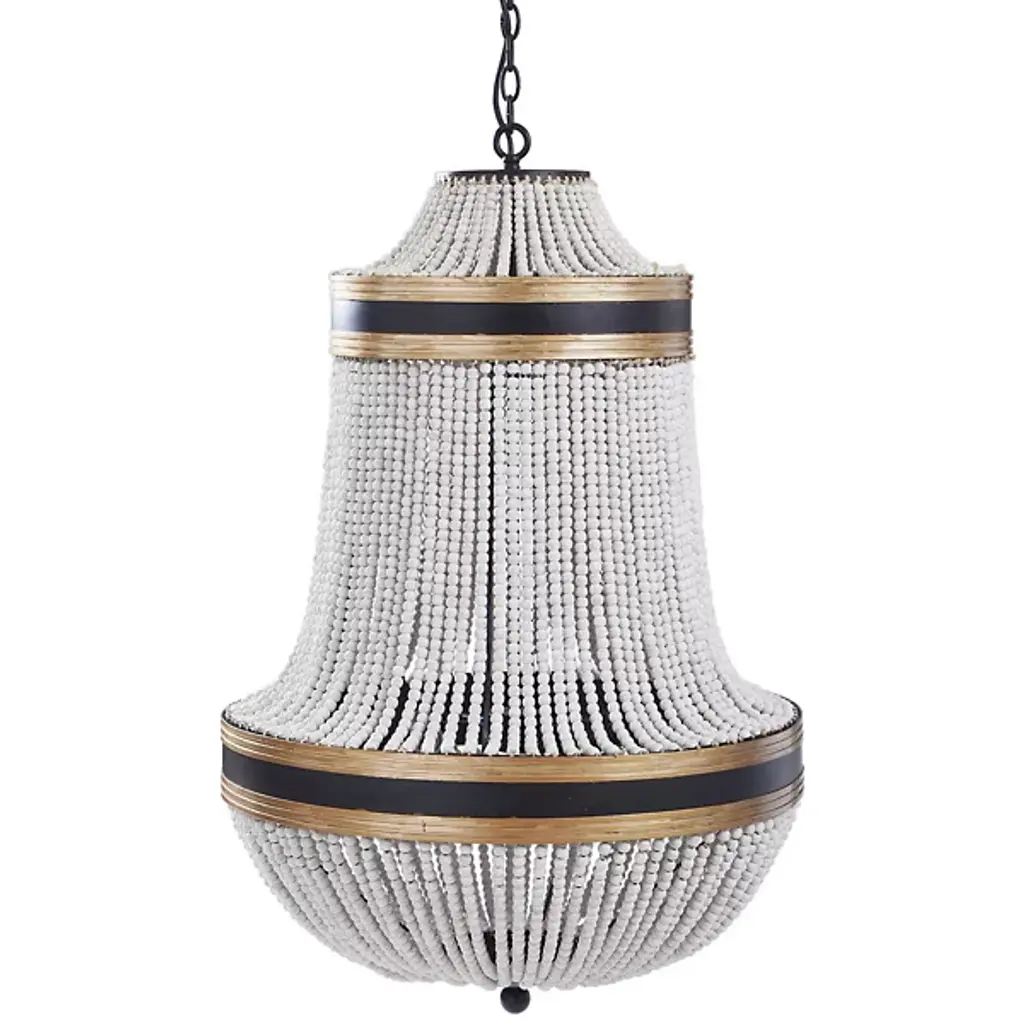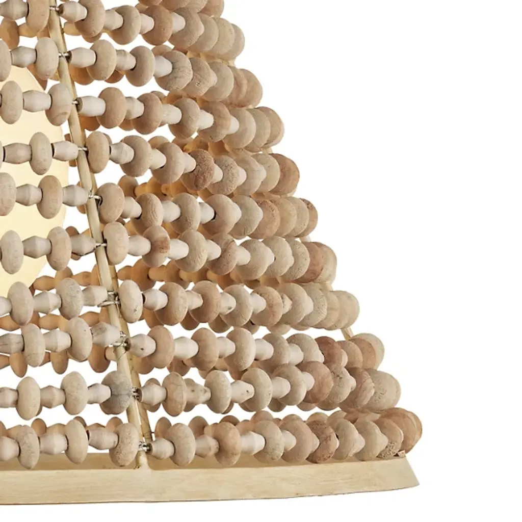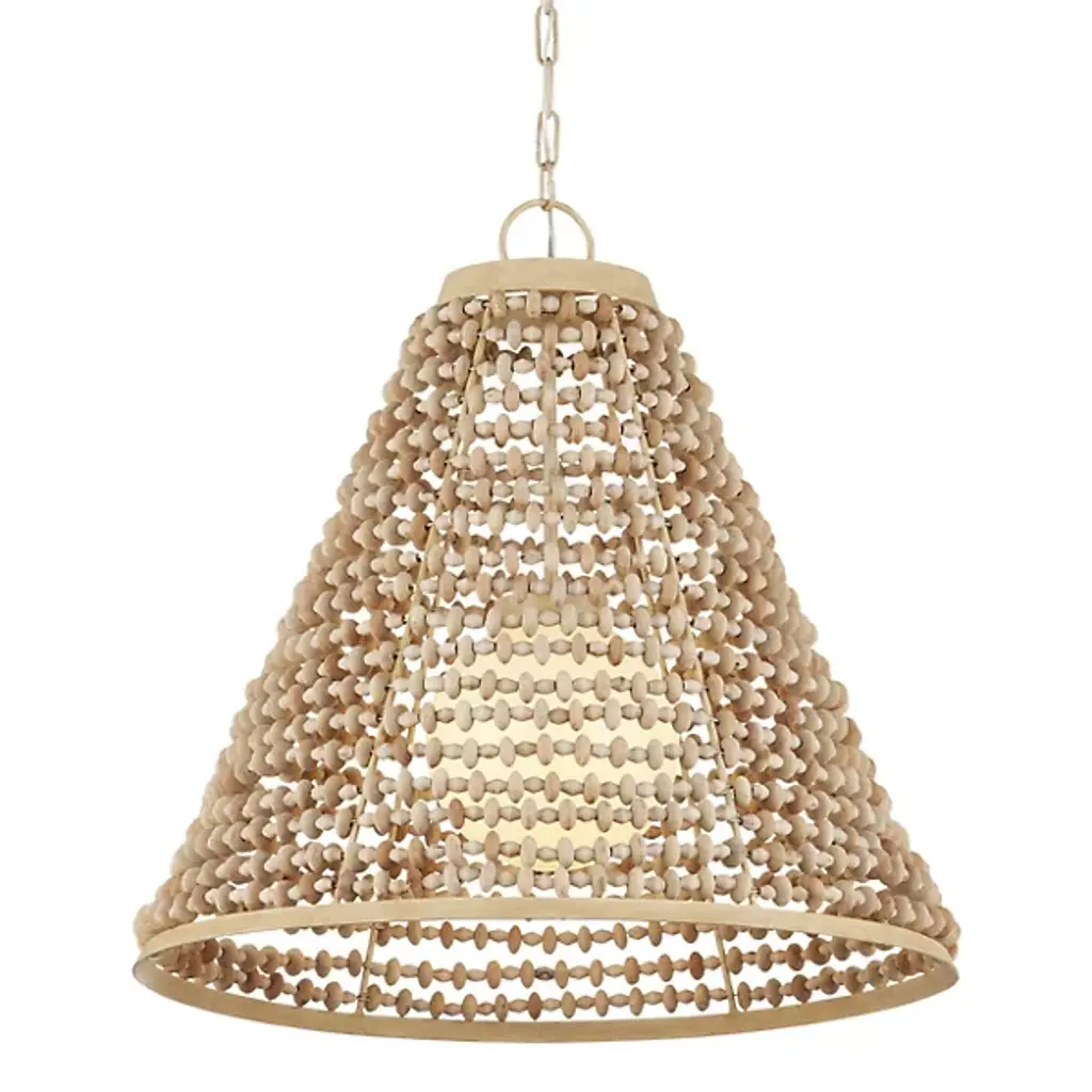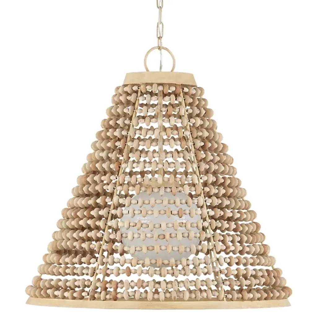 The Pendulum Pendant from Currey & Company boasts a striking design detail—the meticulous arrangement of wood beads in diverse sizes and shapes forming an artful composition. Elongated round beads intertwine with rhombus-shaped counterparts, creating a visually captivating pendant. The bohemian-inspired piece is enhanced by a Coco Cream finish on the metal, harmonizing seamlessly with the natural tones of the wood. Elevate your space with this pendant, where craftsmanship and boho elegance converge uniquely and delightfully.
