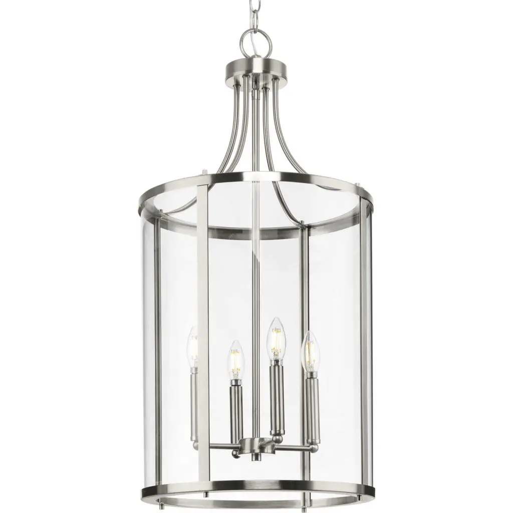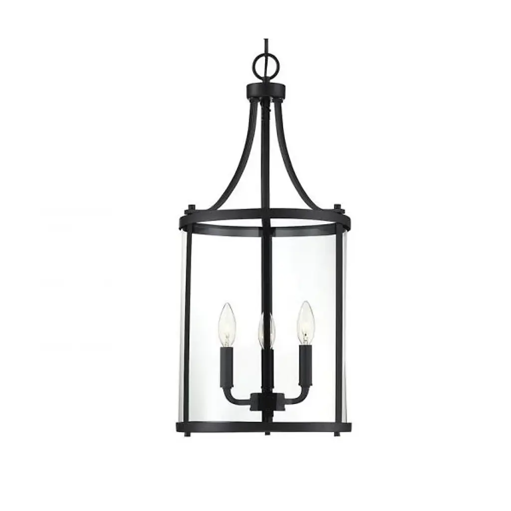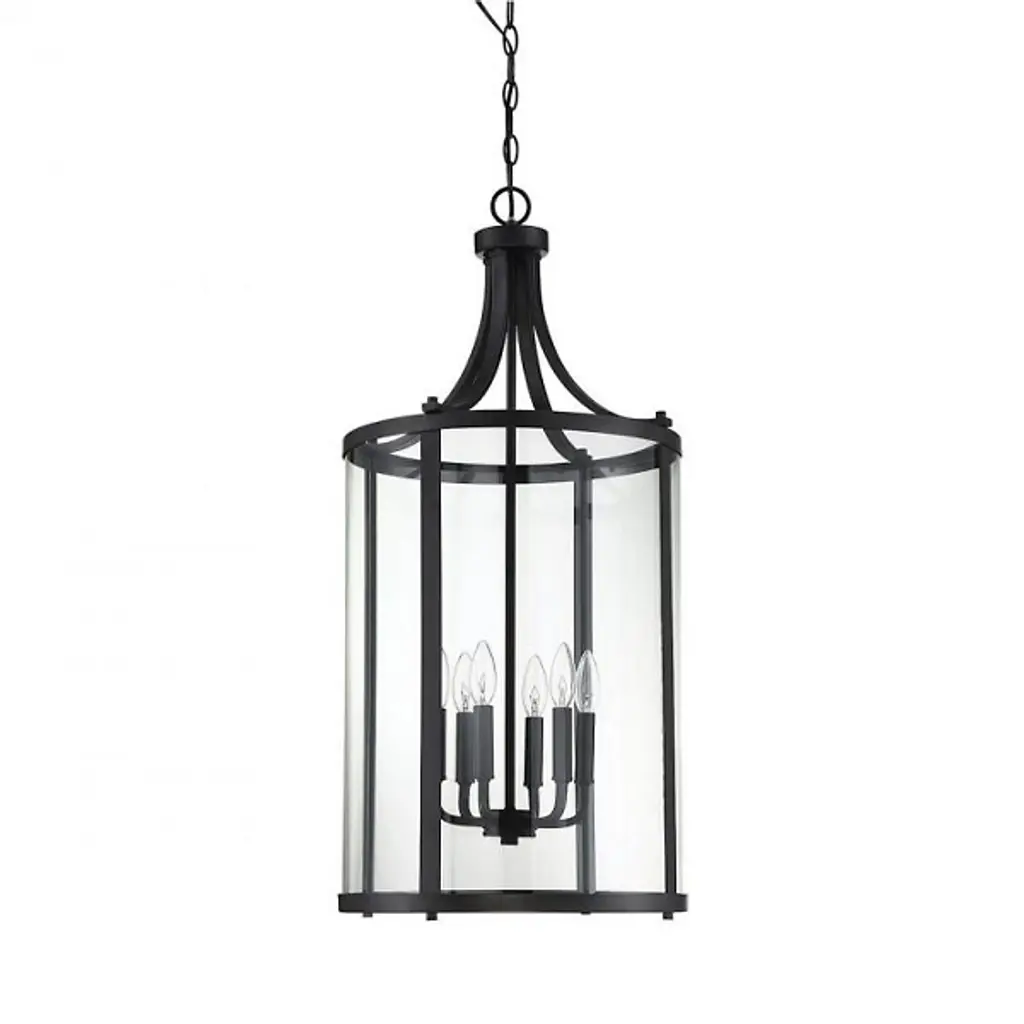 Classic elements with modern appeal. The Penrose Foyer Pendant by Savoy House is perfect whether you're building a new dream home or updating existing light fixtures. For transitional style, its cylindrical metal frame combines clean lines and gentle curves. The clear glass shade allows ambient lighting to shine throughout an area. Completed with a suspension chain, candelabra bulb sockets and a handsome finish, this hanging ceiling fixture brings timeless chic and illumination to an entryway.