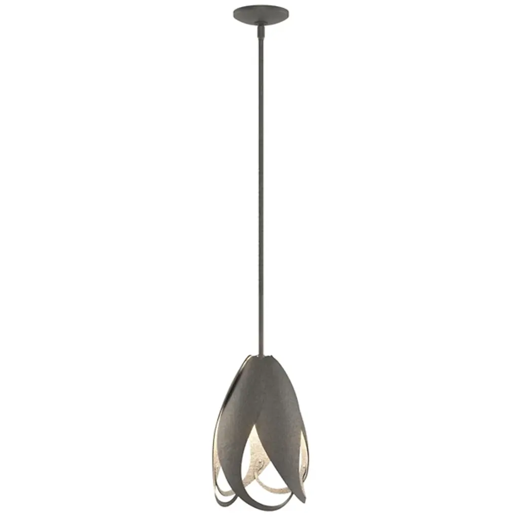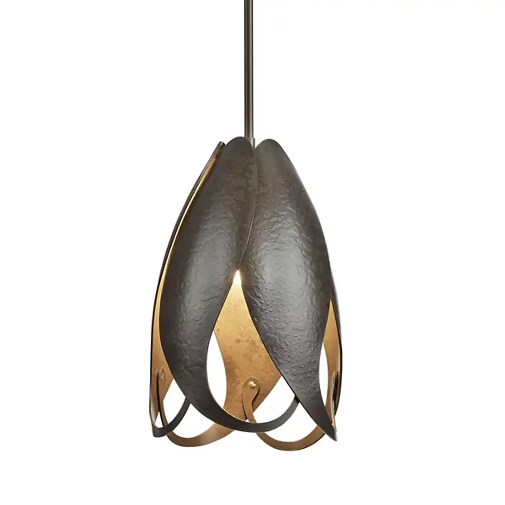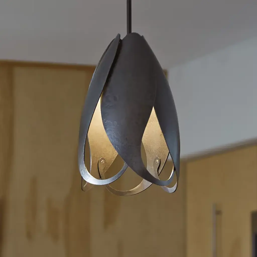 There is no mistake that the Hubbardton Forge Pental Pendant's name sounds like the word "petal". Wrought Iron petals form a flower shape, the curved iron planes gently wrapping around the illumination. The space is filled with light that is inspired by nature, the harsh metal of course being a very intriguing juxtaposition against the organic shape.