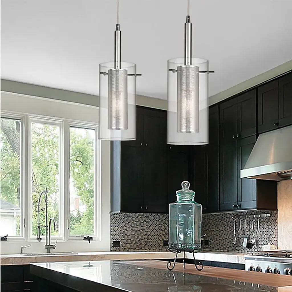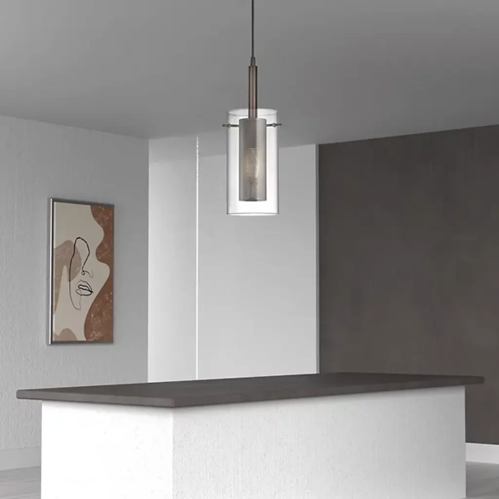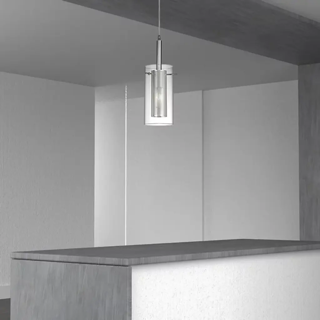 The Percy 1 Light Cylinder Mini Pendant from Dainolite offers a clever contemporary accent to your indoor areas. Suspended from a single slender cord, the downward-facing metal candelabra socket is surrounded by a cylindrical mesh diffuser and ringed by a broader glass shade held up by short metal rods that extend from the socket. This double-shade arrangement blunts excess brightness across two layers, creating a pool of downlight in addition to a warm glow from the sides.