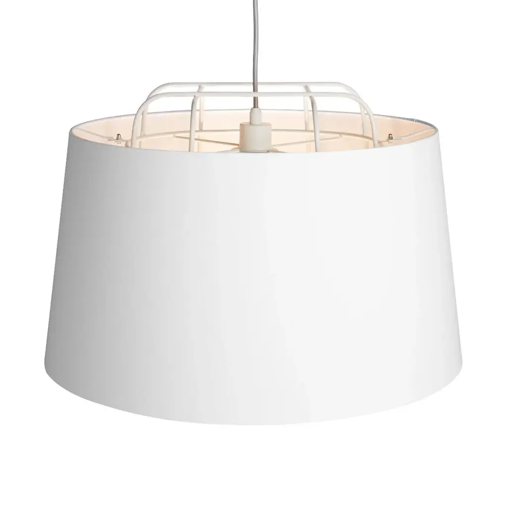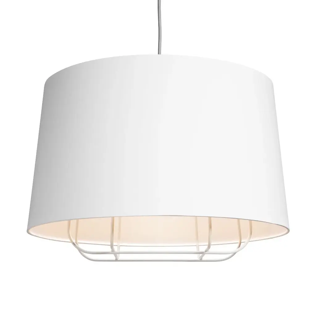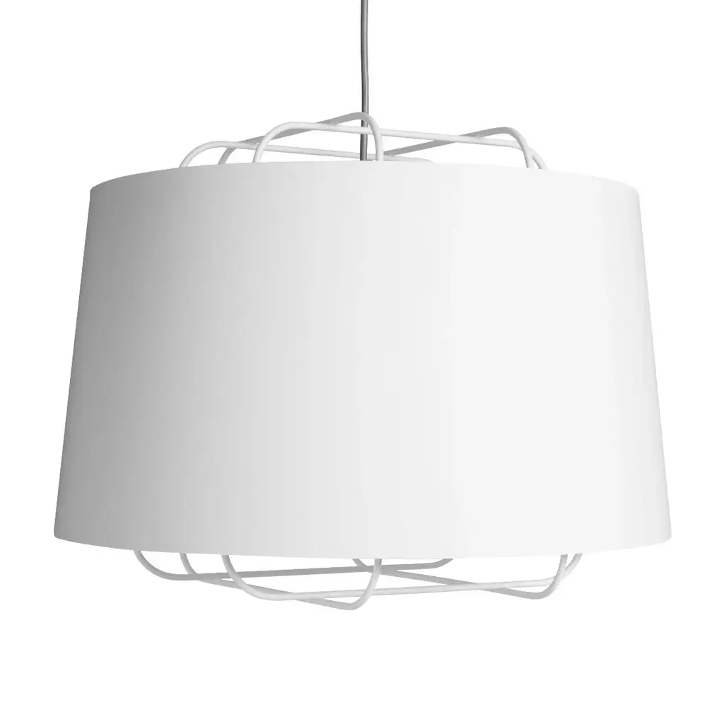 Svelte loops of powder-coated steel hold an oversized cloth-covered shade. Available in a variety of colors to suit your space. Mounts to ceiling. Small pendant light also available.