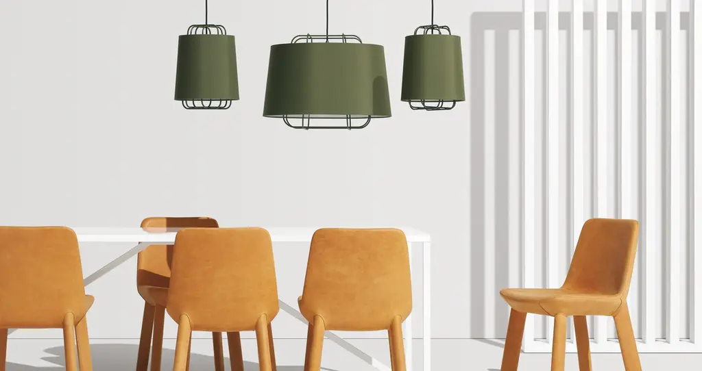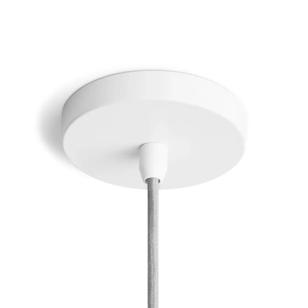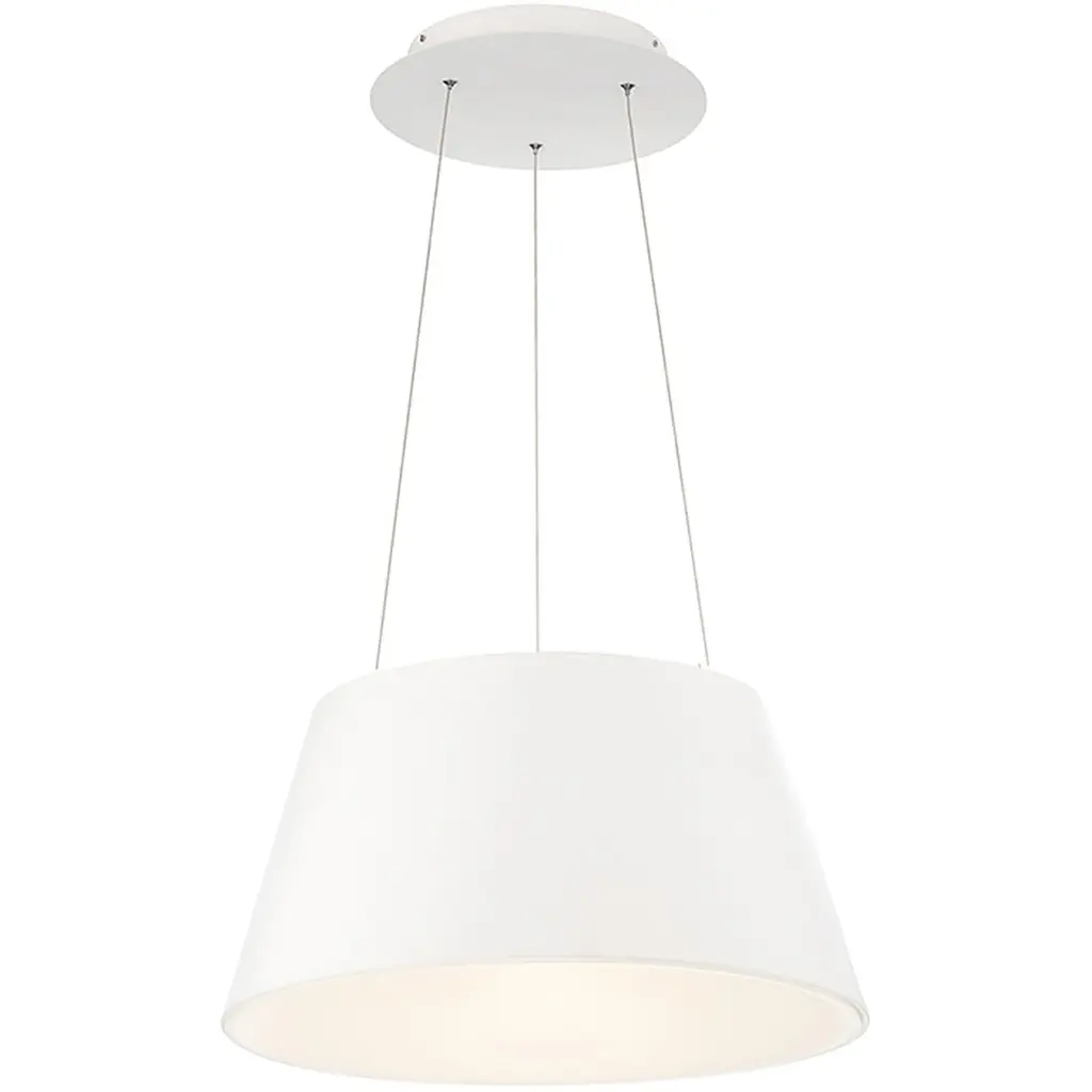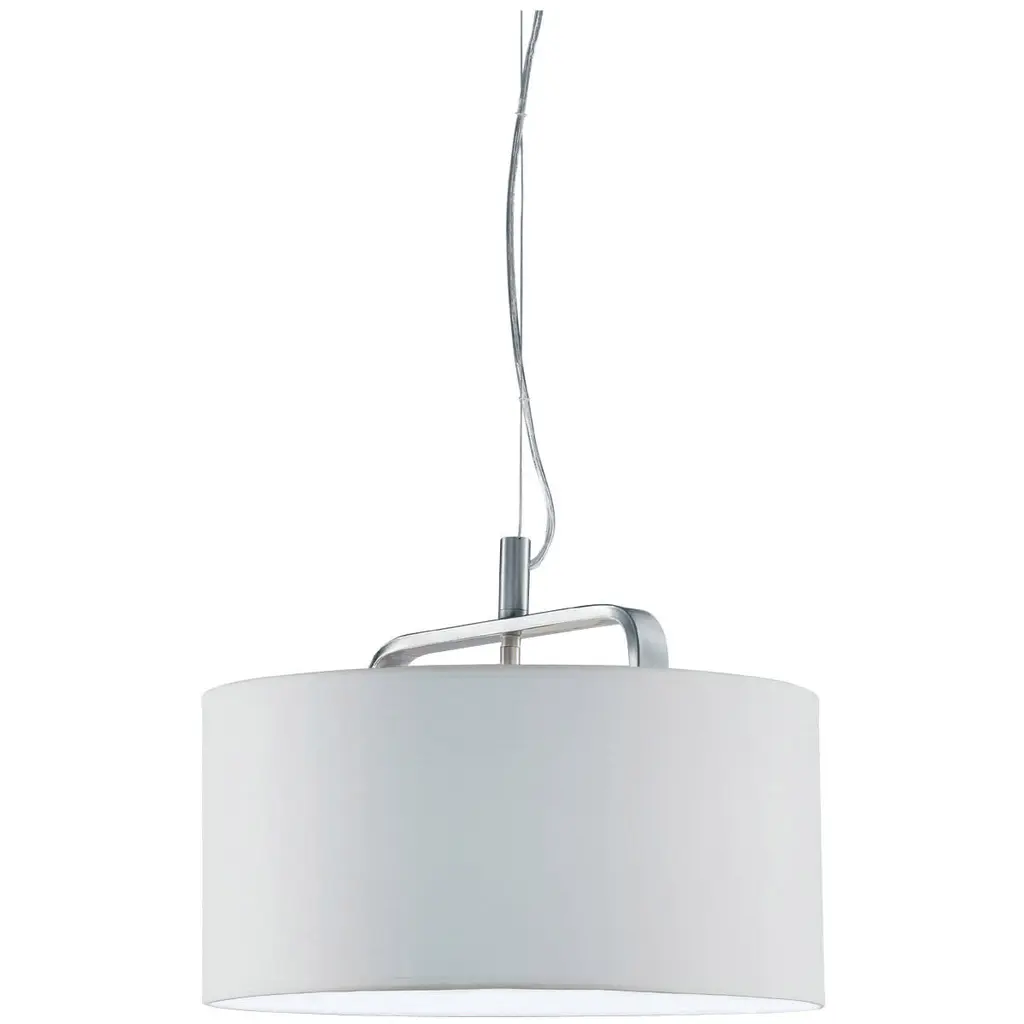 Svelte loops of powder-coated steel hold an oversized cloth-covered shade. Available in a variety of colors to suit your space. Mounts to ceiling. Small pendant light also available.