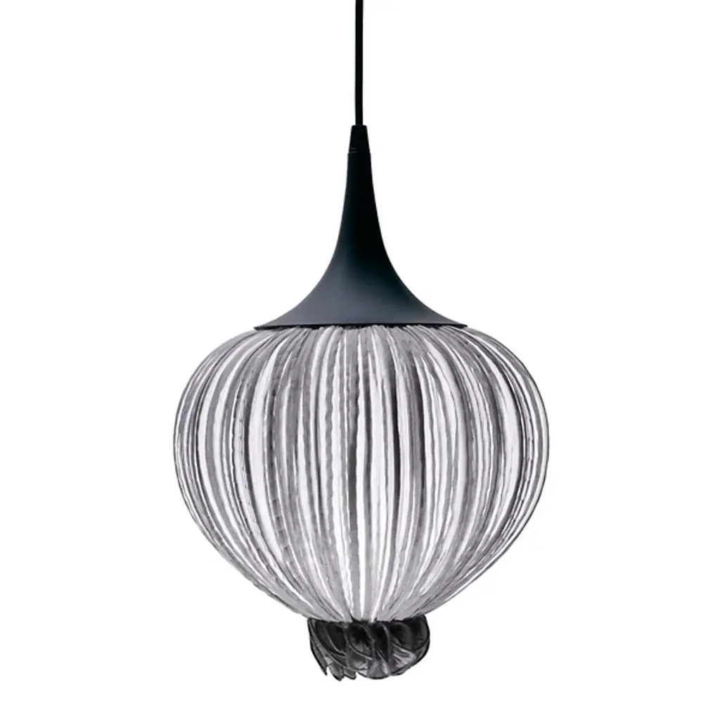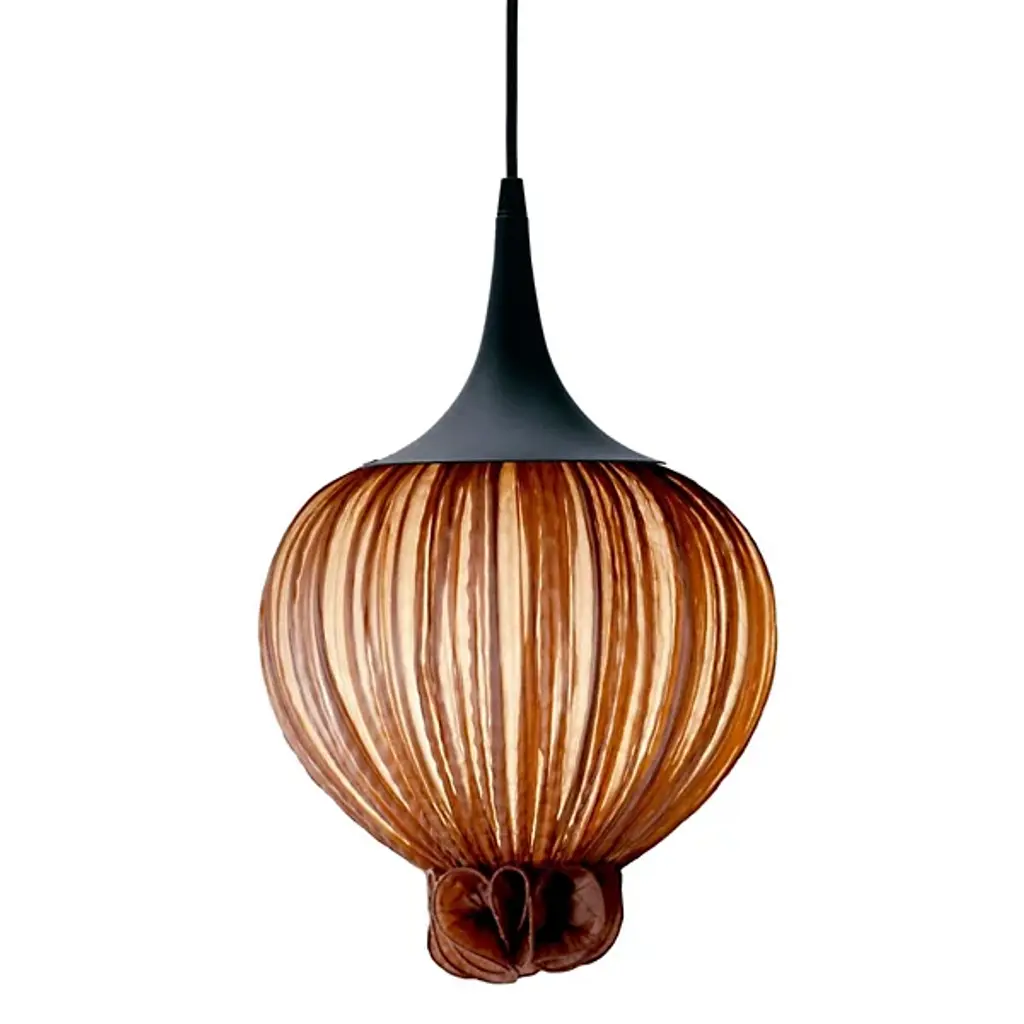 The Perlina Pendant from Aqua Creations provides an organic, orb-style accompaniment to inside ceilings, seeking natural softness, essential designs, and luxurious materials. A key component of the Morning Glory family, it plays well with other members, and draws inspiration from the natural world, citing exotic flowers and animals. The form is simple, but each fixture is handmade in Aqua’s Israeli studio, providing artisan enhancement to each construction. A conical housing suspended via cable secures bright lamping within, accompanied by a bulb-shaped shade of crushed silk, with each fixture featuring unique pleated folds of the softer material, channeling out a gentle ambiance that varies slightly between each fixture.