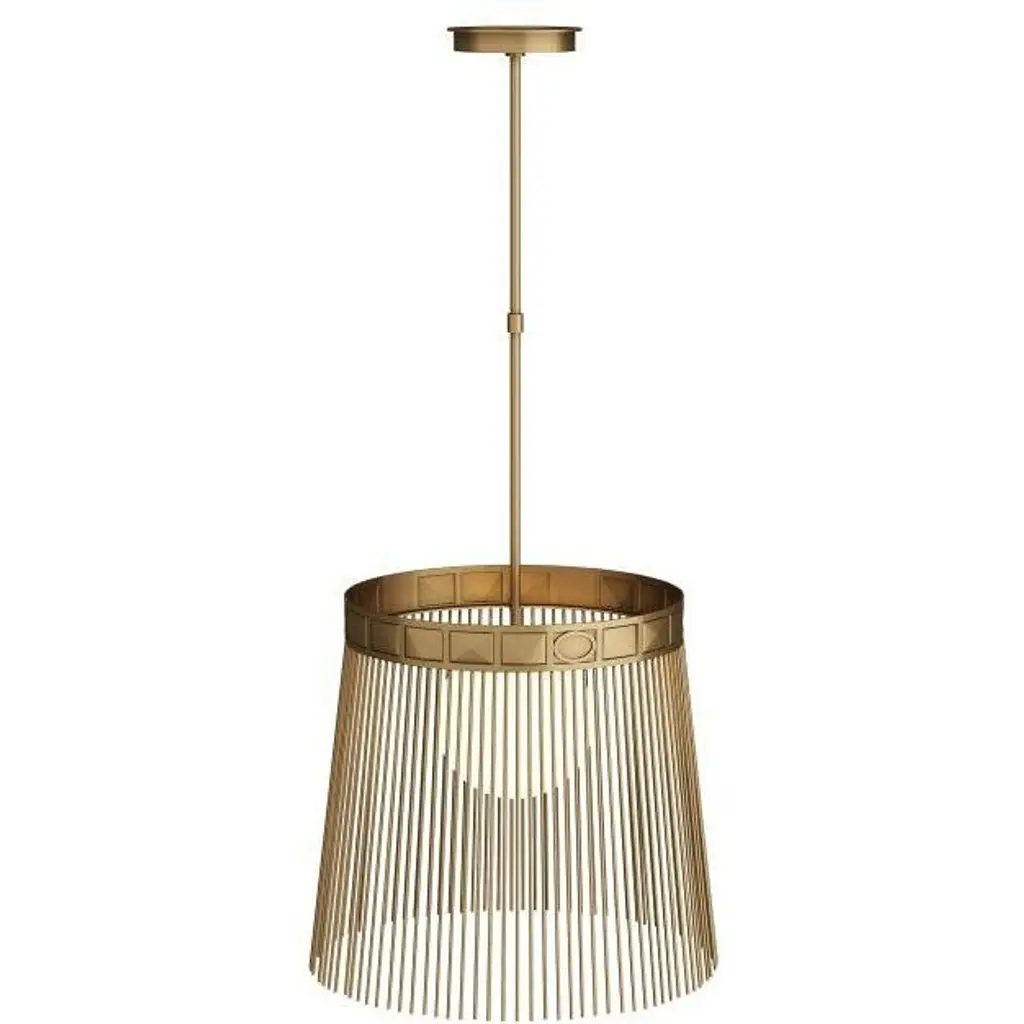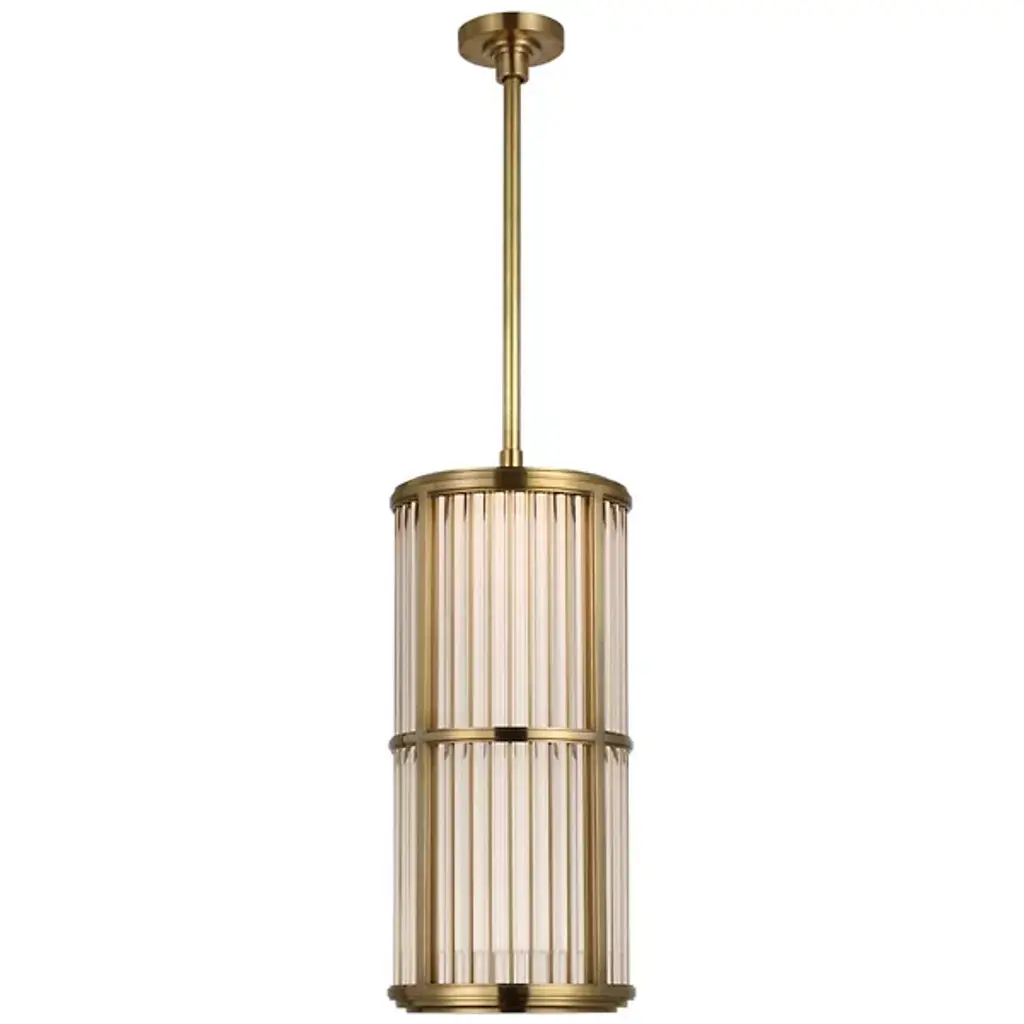 The Perren LED Pendant by Visual Comfort Signature, formerly known as Visual Comfort, has a modern, sophisticated feel that brings a bright touch to spaces. The cylindrical form of this pendant is made up of a series of glass rods set close together for a dynamic, textured surface that playfully filters an even layer of illumination onto surroundings. A sleek metal band accents the waist of this design, and the lovely finish dressing it up matches the neatly capped ends and simple down rod supporting this piece for a tailored look that is at home in a range of locations.