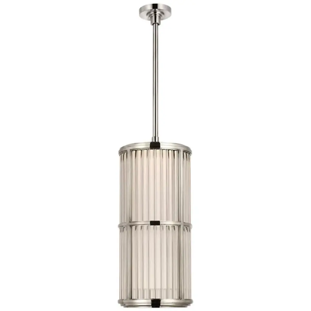 The Perren LED Pendant by Visual Comfort Signature, formerly known as Visual Comfort, has a modern, sophisticated feel that brings a bright touch to spaces. The cylindrical form of this pendant is made up of a series of glass rods set close together for a dynamic, textured surface that playfully filters an even layer of illumination onto surroundings. A sleek metal band accents the waist of this design, and the lovely finish dressing it up matches the neatly capped ends and simple down rod supporting this piece for a tailored look that is at home in a range of locations.
