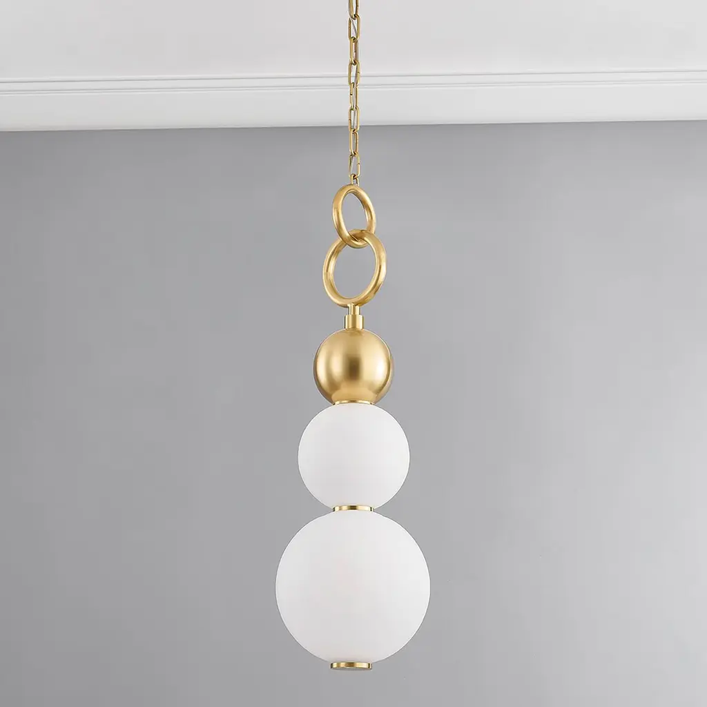Jewelry-inspired Perrin dazzles as it dangles. Coming together in a delicate balance, an orb suspends from rings in a matching metallic finish while holding a pair of opal matte glass globes. This charming design adds elegance to any space.