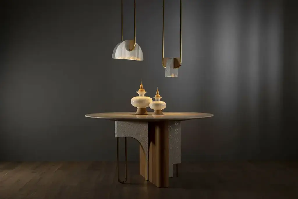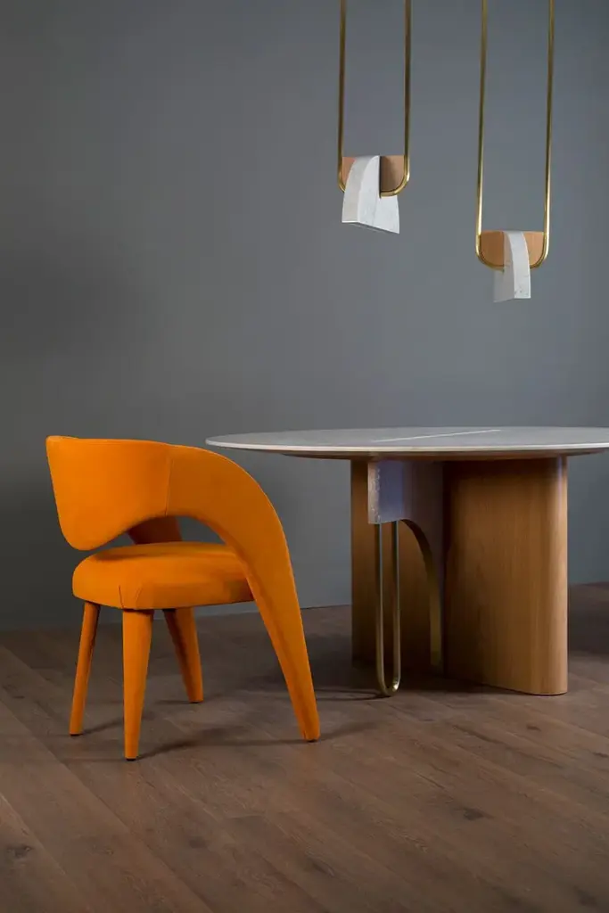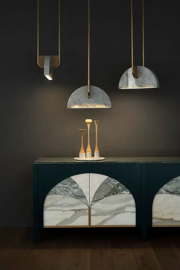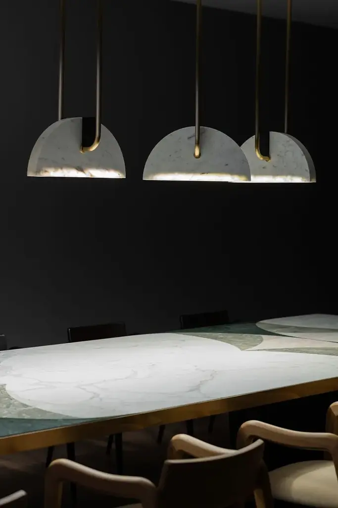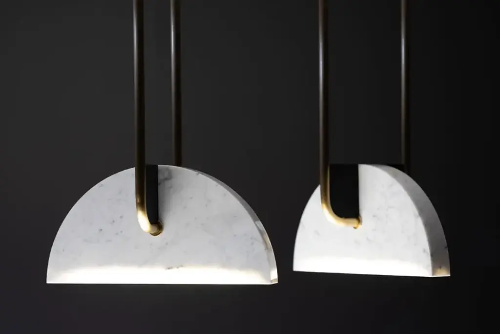Pessoa is a suspension lamp. Fernando Pessoa, the man with the greatest sensitivity, inspired the form and materials of this lamp. Extraordinary like his works and different from all angles, like his heteronyms. The pure arch shape made of Italian Carrara Bianco marble and the hanging metal tube made of brushed brass create an elegant arrangement.Materials & FinishesST045 Carrara Bianco marble; polishedME006 Brushed brass; high-gloss finishWD027 American oak; open-pore natural colour; matt finishFI042 White lacquer; satin finishEL001 LED light stripElectric Components - CE SpecificationsVoltage, frequency: 220V, 50HZEletrical plug type: C, FLed strip: YesLed strip color temperature: 3000 KLed strip brightness: 420Energy CertificationThis luminaire contains built-in LED lamps that cover the following levels of energy certification: A++ to AAverage energy class: A++The lamps cannot be changed in this luminaire: Yes