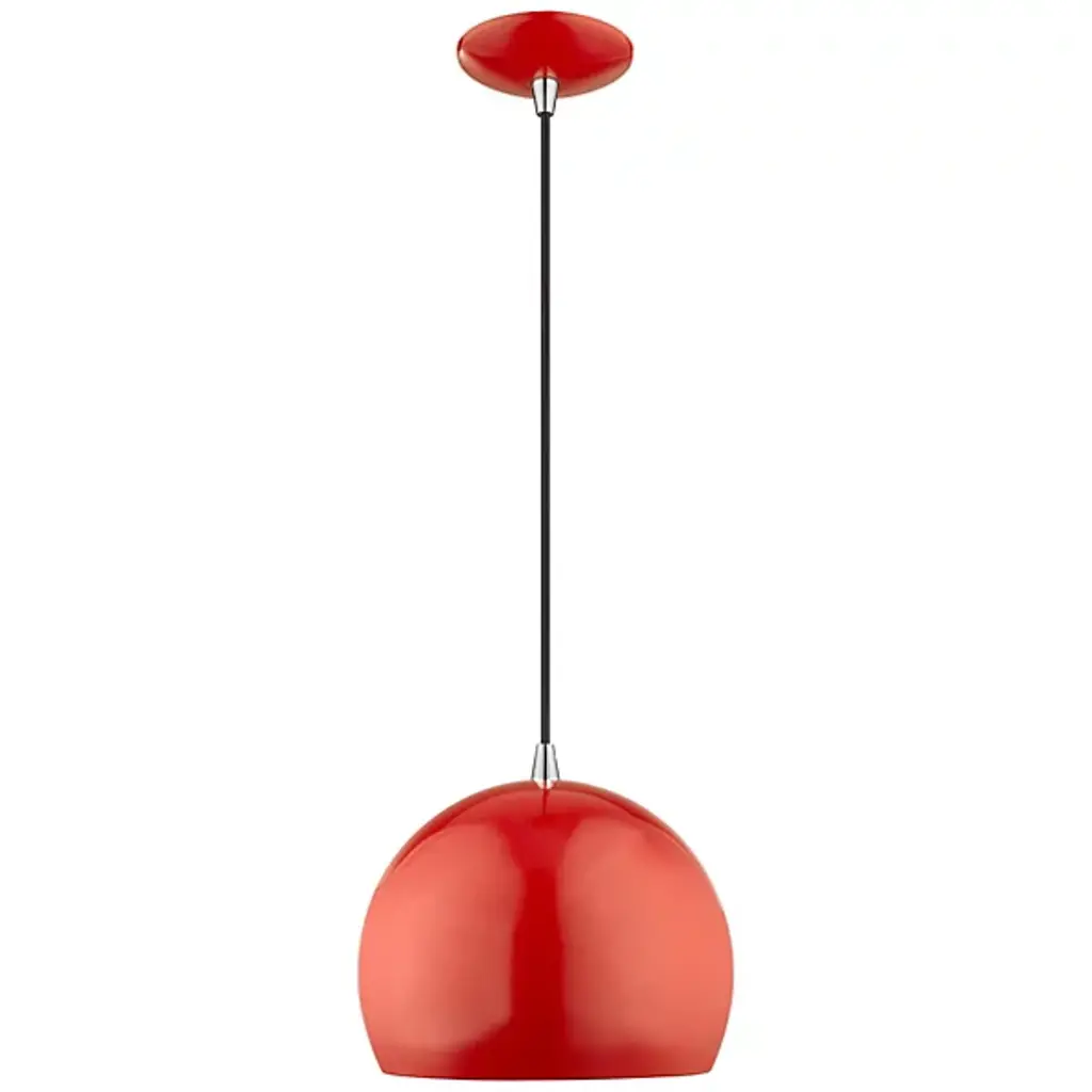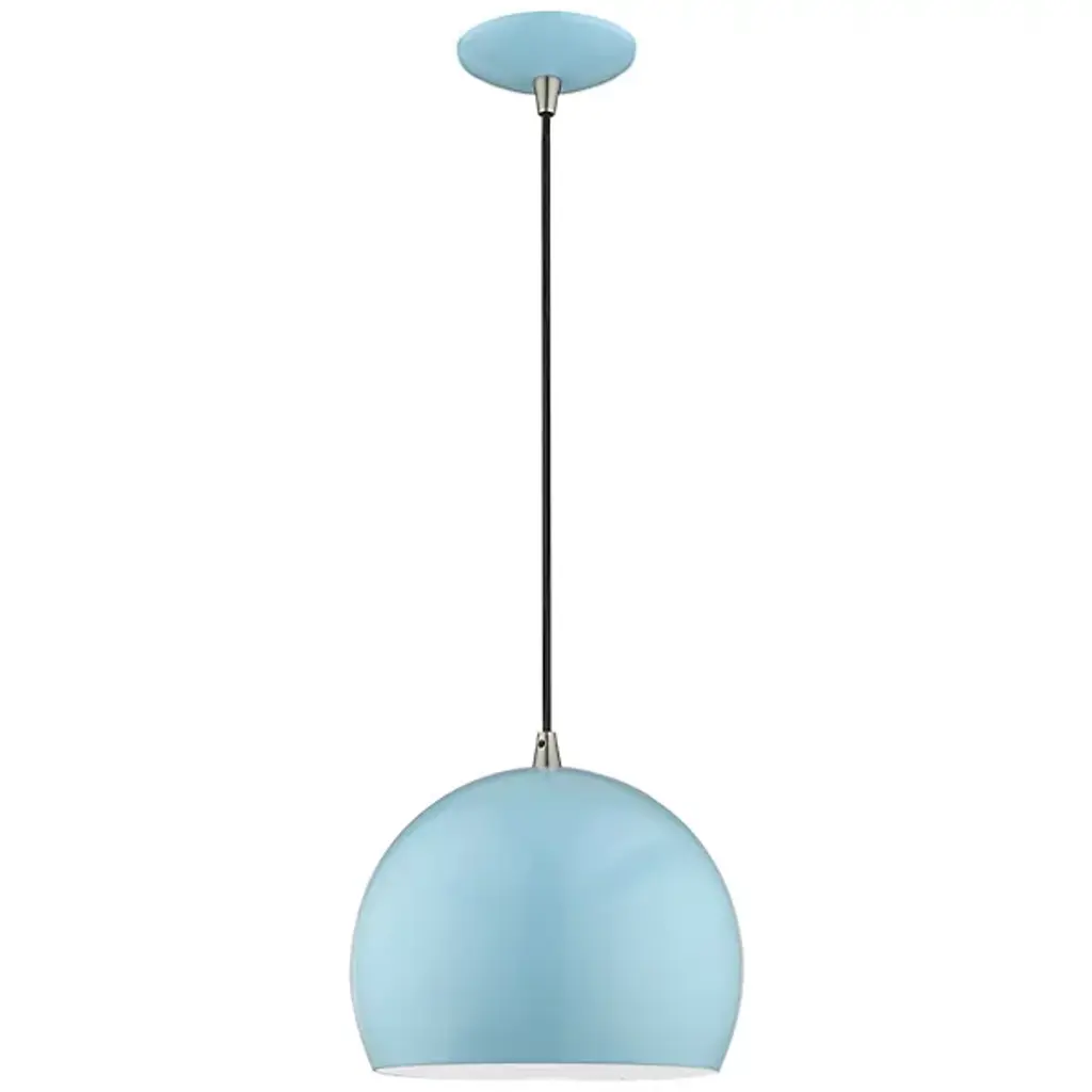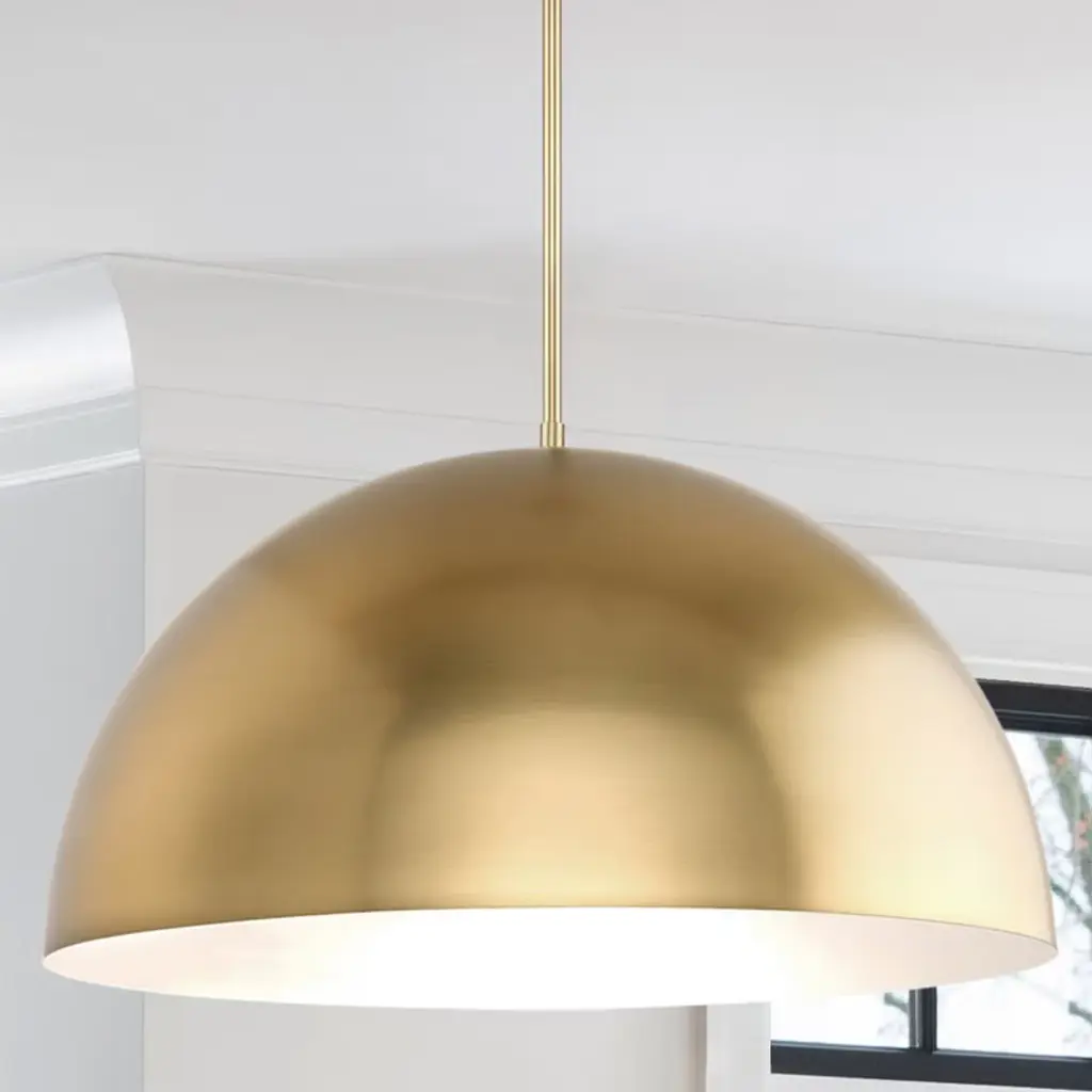 The Peterson Spherical Pendant from Alder & Ore adds a clean, modern presence to its surroundings, extending a single slender cable from a shallow canopy to a damp-listed lamp set inside a rounded dome shade fashioned from steel that curls down around it. The shade is open at its base, revealing a reflective interior that stands out from the matte-textured outer surface, and casts a memorable mix of bright downlight and warmly-reflected ambiance around the fixture.