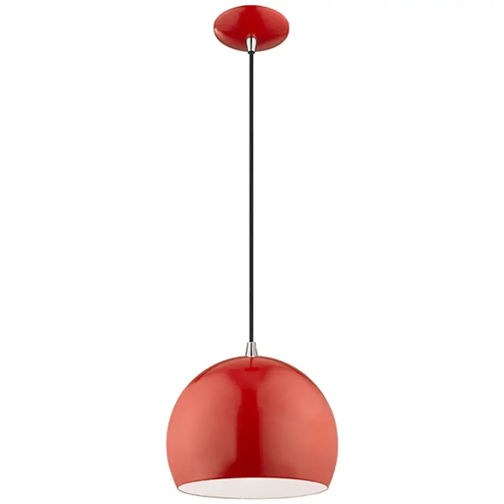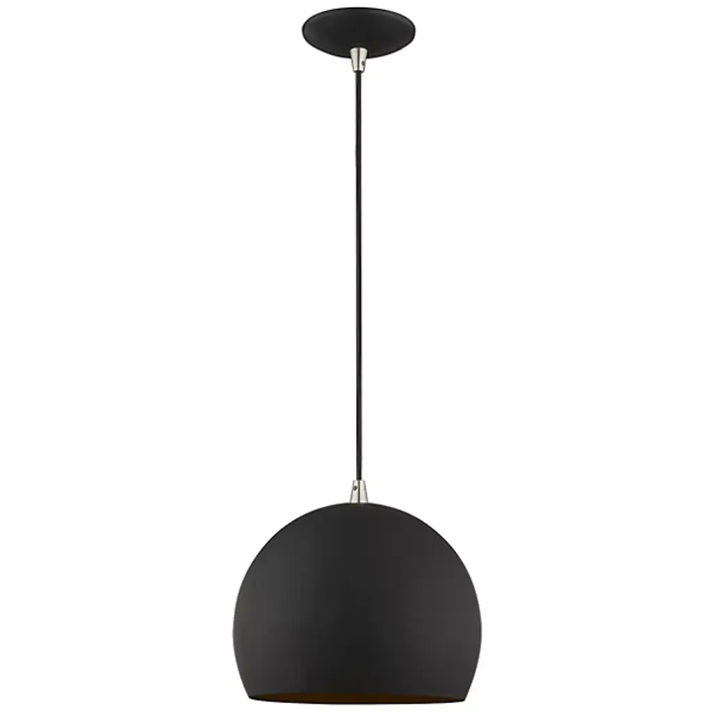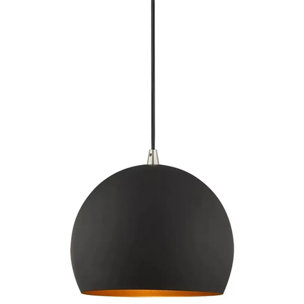 The Peterson Spherical Pendant from Alder & Ore adds a clean, modern presence to its surroundings, extending a single slender cable from a shallow canopy to a damp-listed lamp set inside a rounded dome shade fashioned from steel that curls down around it. The shade is open at its base, revealing a reflective interior that stands out from the matte-textured outer surface, and casts a memorable mix of bright downlight and warmly-reflected ambiance around the fixture.