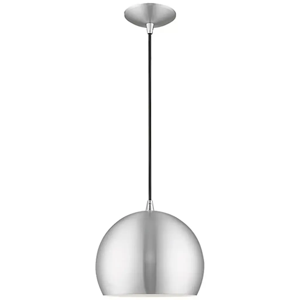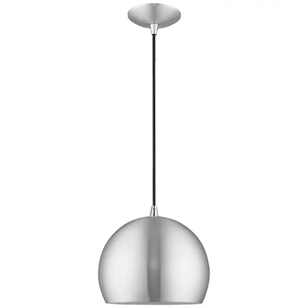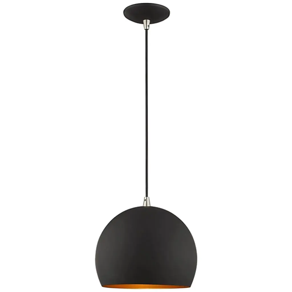 The Peterson Spherical Pendant from Alder & Ore adds a clean, modern presence to its surroundings, extending a single slender cable from a shallow canopy to a damp-listed lamp set inside a rounded dome shade fashioned from steel that curls down around it. The shade is open at its base, revealing a reflective interior that stands out from the matte-textured outer surface, and casts a memorable mix of bright downlight and warmly-reflected ambiance around the fixture.