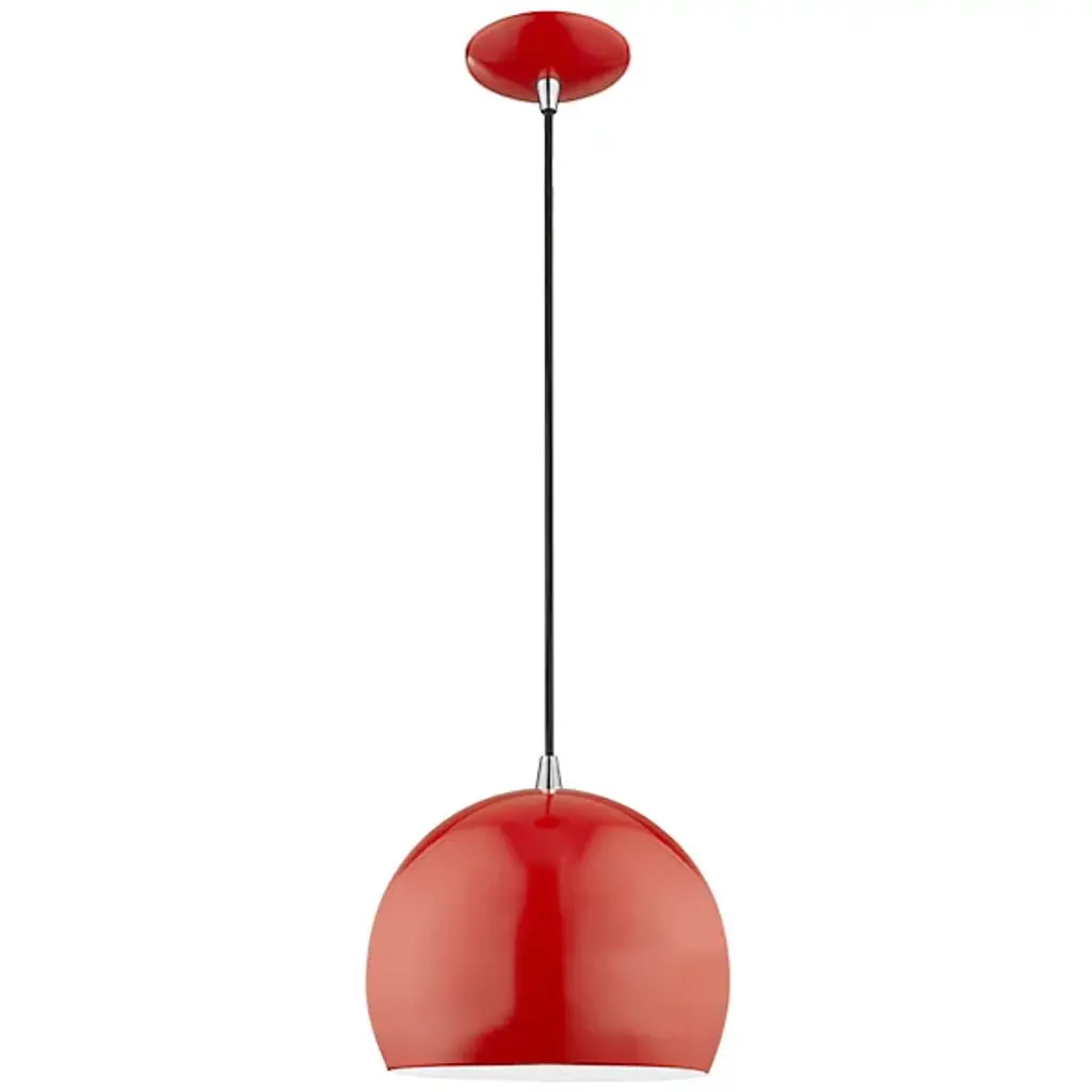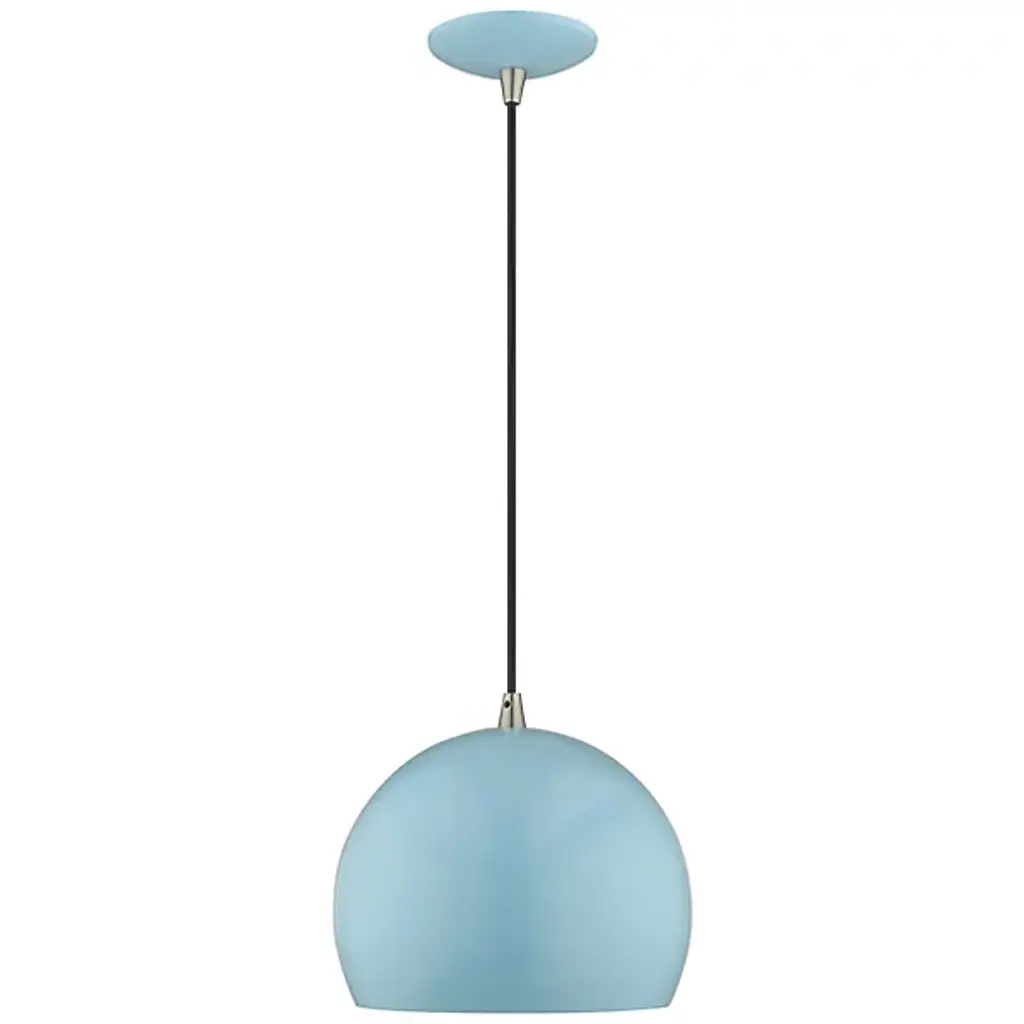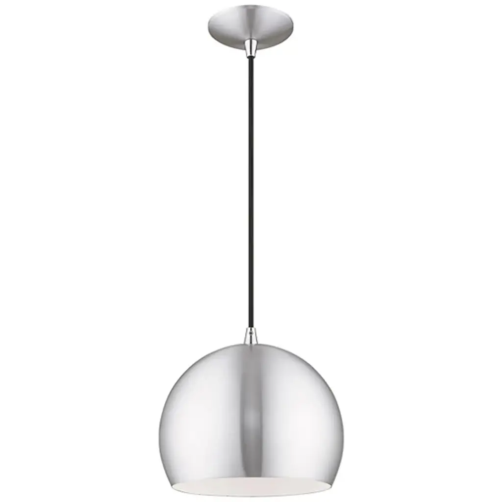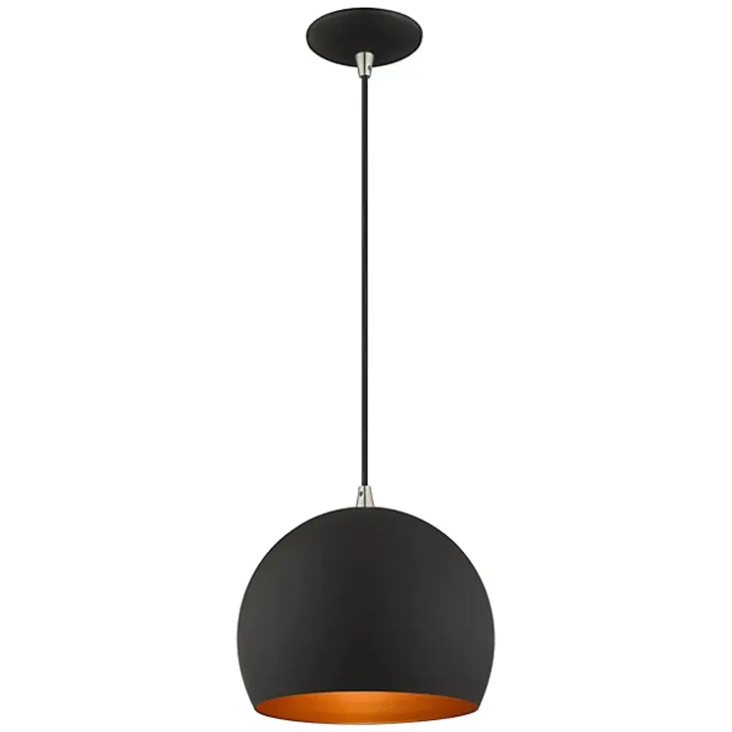 The Peterson Spherical Pendant from Alder & Ore adds a clean, modern presence to its surroundings, extending a single slender cable from a shallow canopy to a damp-listed lamp set inside a rounded dome shade fashioned from steel that curls down around it. The shade is open at its base, revealing a reflective interior that stands out from the matte-textured outer surface, and casts a memorable mix of bright downlight and warmly-reflected ambiance around the fixture.