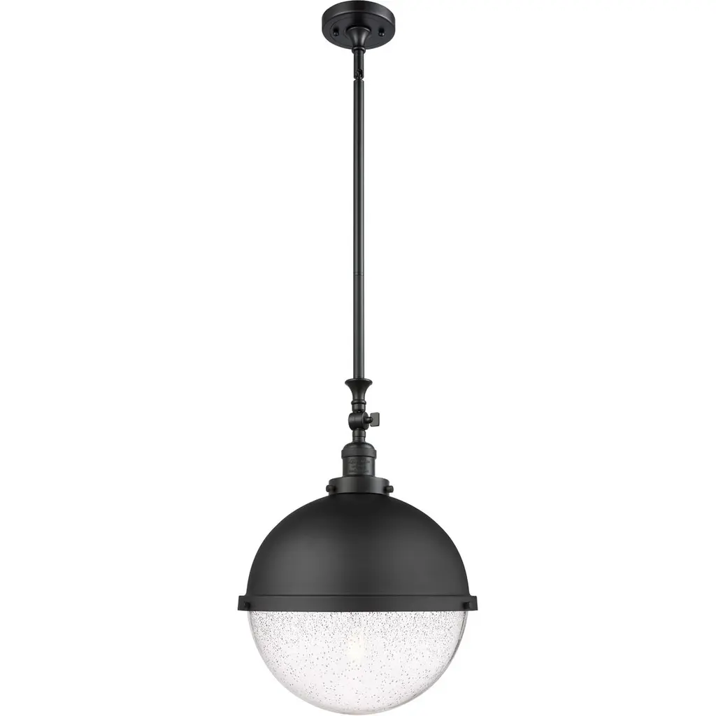 Retro influences present a timeless aesthetic to this restoration style two-light pendant, designed with an elegant grandly sized globe shape lantern. The large moon shape lantern offers extra dimension with its mesmerizing iron dome cover detailed with petite decorative rivets along the band that create a vintage-inspired industrial feel. The rustic matte black finish offers a rustic modern farmhouse touch to this charming traditional pendant, contrasted by a softly diffused illumination that shines from the rounded opal glass bottom shade.