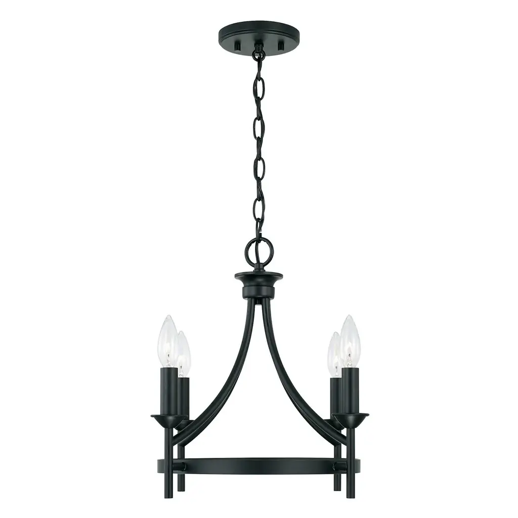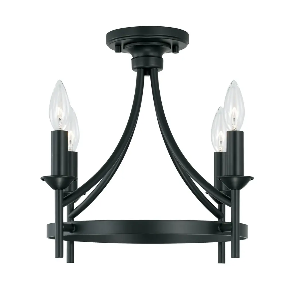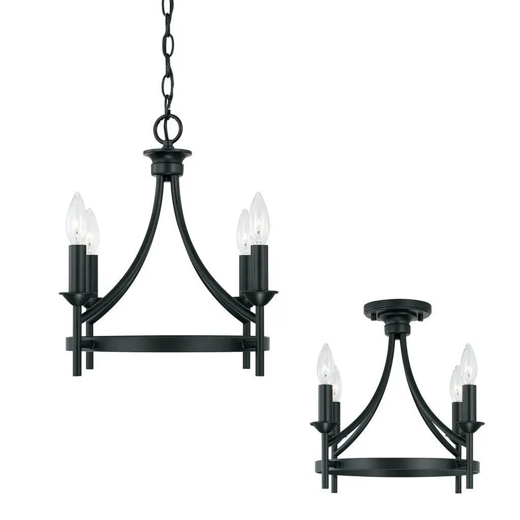 The sharp lines and artistic arches of the Peyton collection 4-light Dual Mount Semi-Flush Mount/ Pendant are timelessly transitional. The muted tone of the Matte Black finish allows the silhouette to take center stage. This fixture can be used as a Semi-Flush or as a Pendant. Applications: Perfect for use in foyer entryways, dining room, kitchens, stairways and offices. Reminiscent of large wagon wheel chandeliers, this matte black candle convertible piece add class to any décor. Convertible: May be mounted either as a pendant or as a semi-flush mount (All Hardware Included). Versatile: Dimmable and LED/CFL/Incandescent compatible, uses four (4) 60-Watt max E12 candelabra base bulbs (Not Included). Reliable: Includes 1-Year Full Manufacturer's Warranty. Adjustable Height: Includes 10' of chain and 15' of wire. Fixture Dimensions: 15.5 inches high x 16 inch diameter.