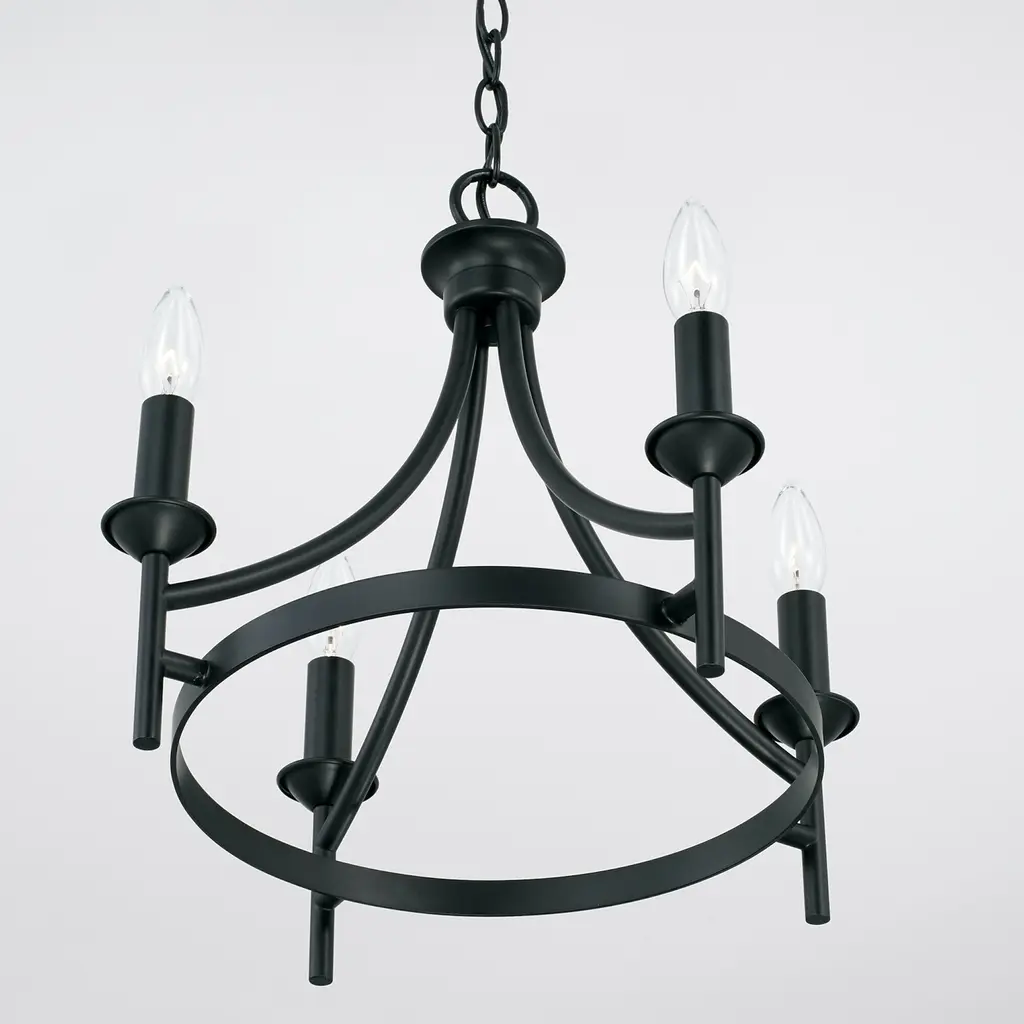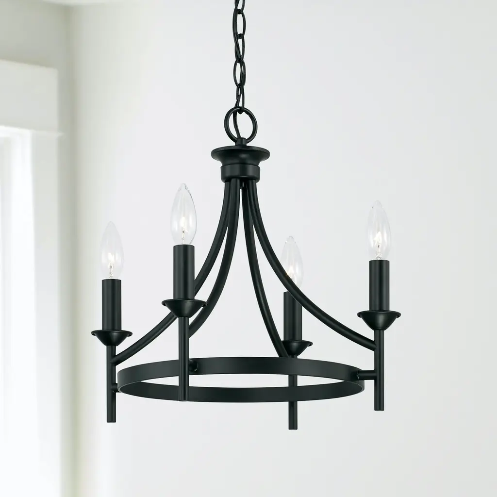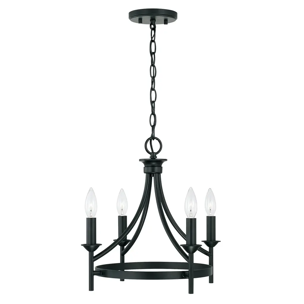 The sharp lines and artistic arches of the Peyton collection 4-light Dual Mount Semi-Flush Mount/ Pendant are timelessly transitional. The muted tone of the Matte Black finish allows the silhouette to take center stage. This fixture can be used as a Semi-Flush or as a Pendant. Applications: Perfect for use in foyer entryways, dining room, kitchens, stairways and offices. Reminiscent of large wagon wheel chandeliers, this matte black candle convertible piece add class to any décor. Convertible: May be mounted either as a pendant or as a semi-flush mount (All Hardware Included). Versatile: Dimmable and LED/CFL/Incandescent compatible, uses four (4) 60-Watt max E12 candelabra base bulbs (Not Included). Reliable: Includes 1-Year Full Manufacturer's Warranty. Adjustable Height: Includes 10' of chain and 15' of wire. Fixture Dimensions: 15.5 inches high x 16 inch diameter.