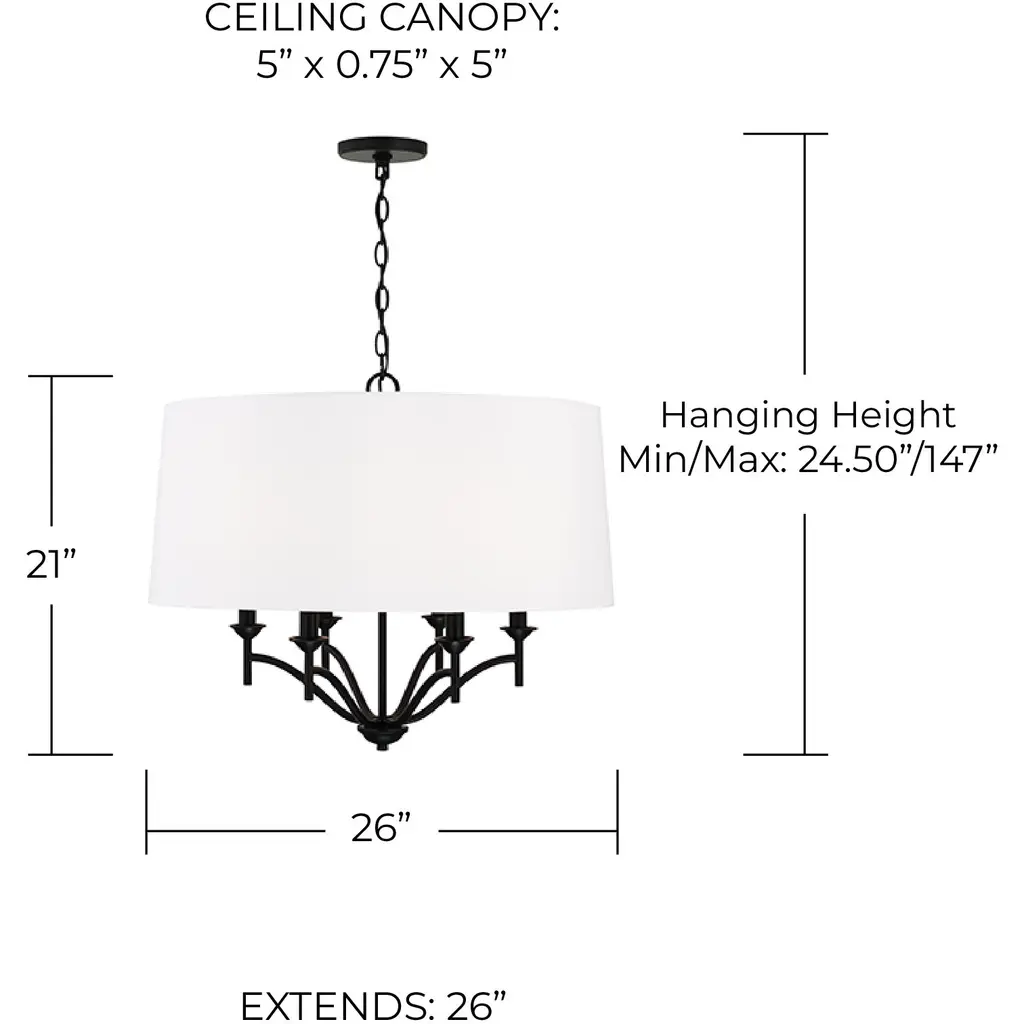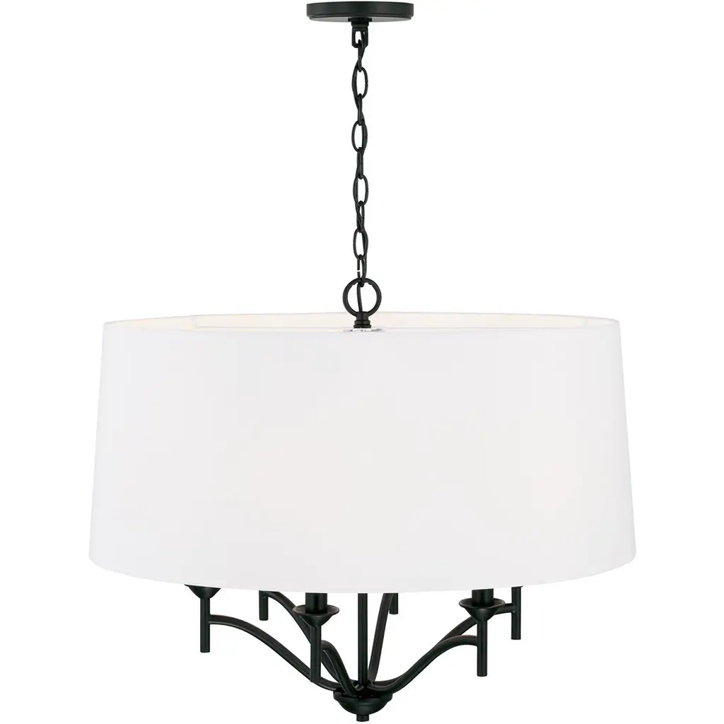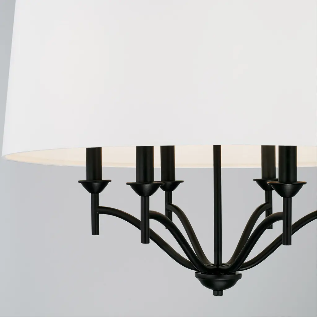 The contrast of the fabric drum shade and the muted tone of the Matte Black finish of the Peyton 6-Light Pendant put a tailored touch on the transitional look. The sharp lines and artistic arches create a timeless look.