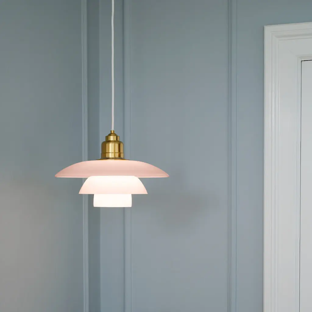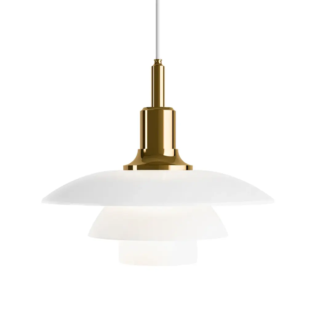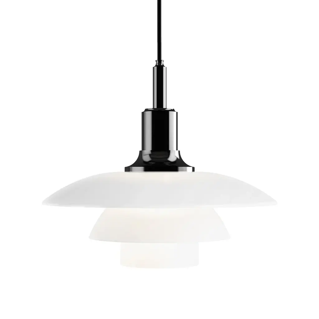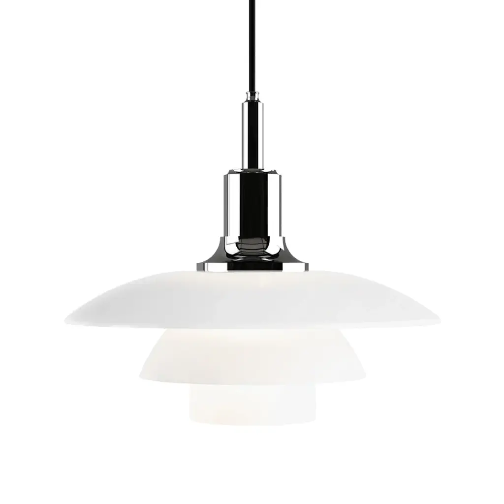 The PH 3 ½-3 Glass Pendant is one of many advanced projects undertaken by Poul Henningsen in the development of his world-famous three-shade system from 1926. Poul Henningsen devoted most of his life to taming electric light. He based his three-shade design on a logarithmic spiral to make optimum use of the light source. He was constantly doing calculations and tests. The form of the shades was determined by the way they were required to shape and reflect the light, and the lamp was designed to be glare-free. The white opal glass shades soften the overall look of the lamp and illuminate its surroundings with a perfect, harmonious and glare-free light that only the classic three-shade system is capable of emitting. The shades are mouth-blown three-layer opal glass, which is glossy on top and sandblasted matt underneath to provide soft and uniform light distribution.