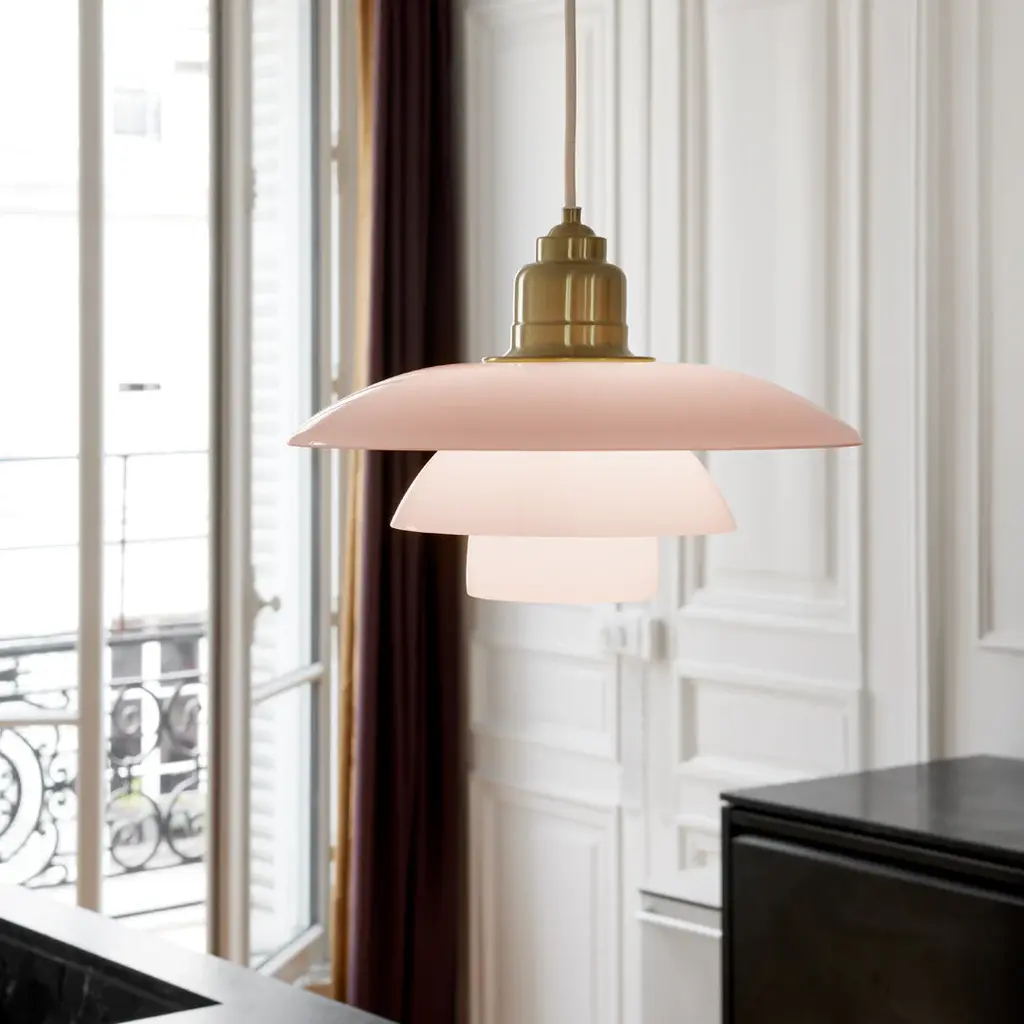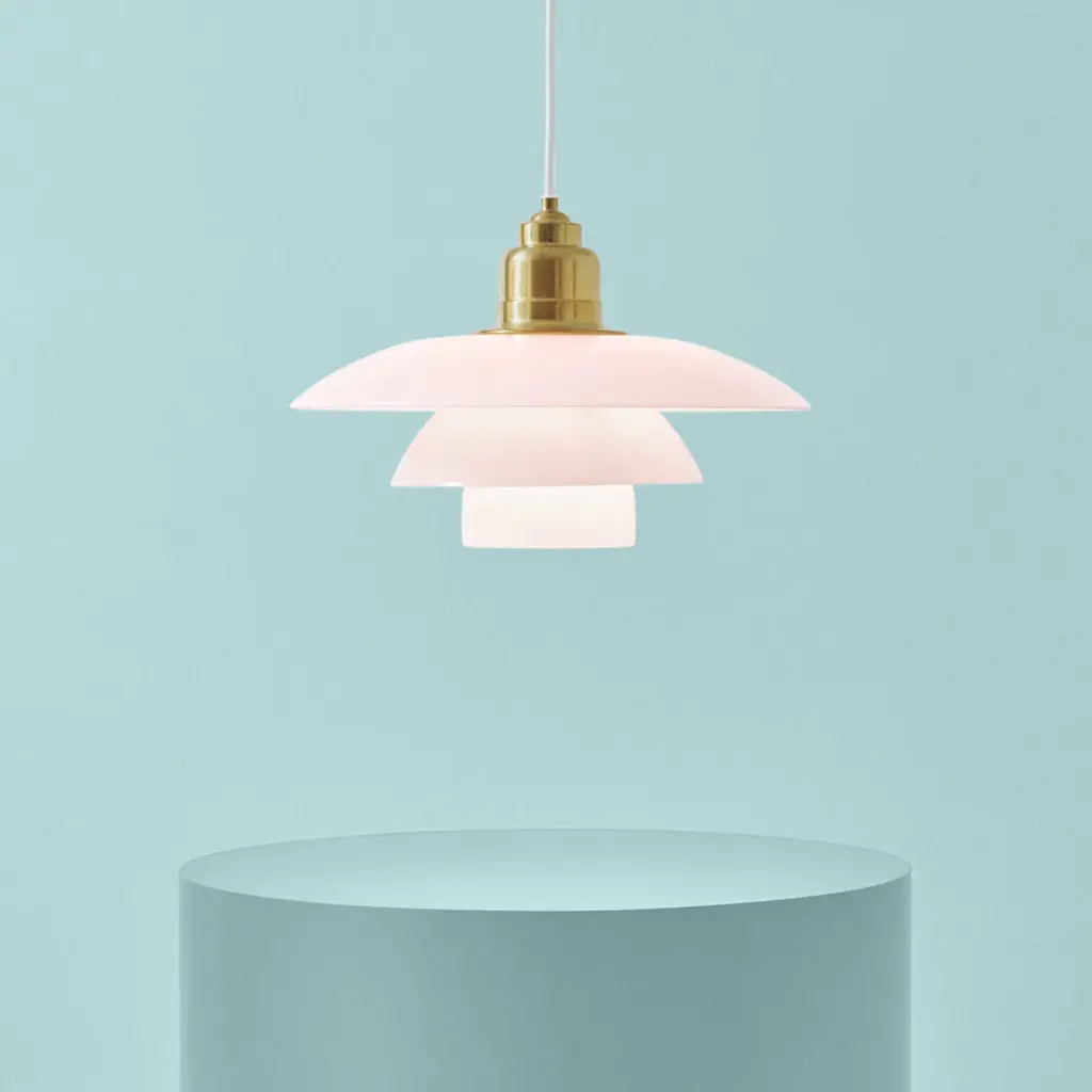 The PH 3 ½-3 Glass Pendant is one of many advanced projects undertaken by Poul Henningsen in the development of his world-famous three-shade system from 1926. Poul Henningsen devoted most of his life to taming electric light. He based his three-shade design on a logarithmic spiral to make optimum use of the light source. He was constantly doing calculations and tests. The form of the shades was determined by the way they were required to shape and reflect the light, and the lamp was designed to be glare-free. The white opal glass shades soften the overall look of the lamp and illuminate its surroundings with a perfect, harmonious and glare-free light that only the classic three-shade system is capable of emitting. The shades are mouth-blown three-layer opal glass, which is glossy on top and sandblasted matt underneath to provide soft and uniform light distribution.