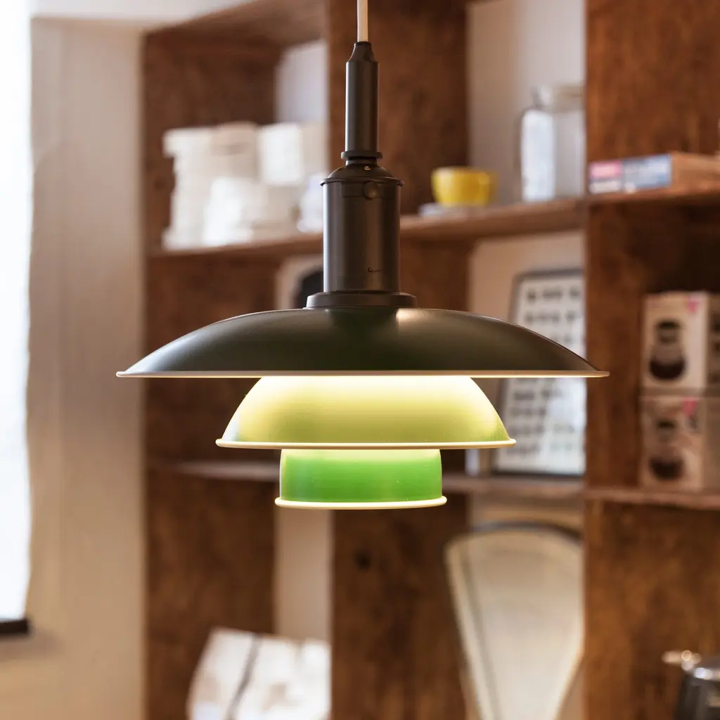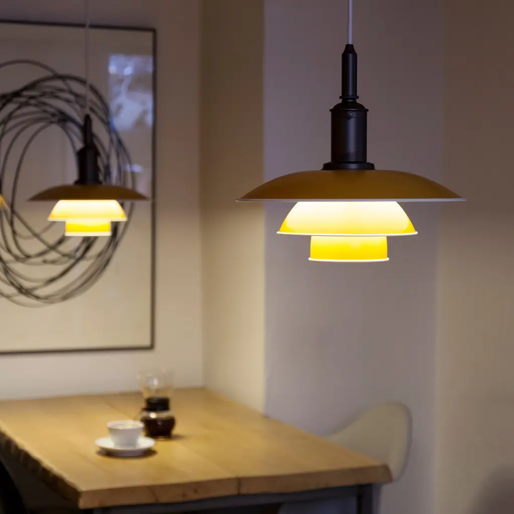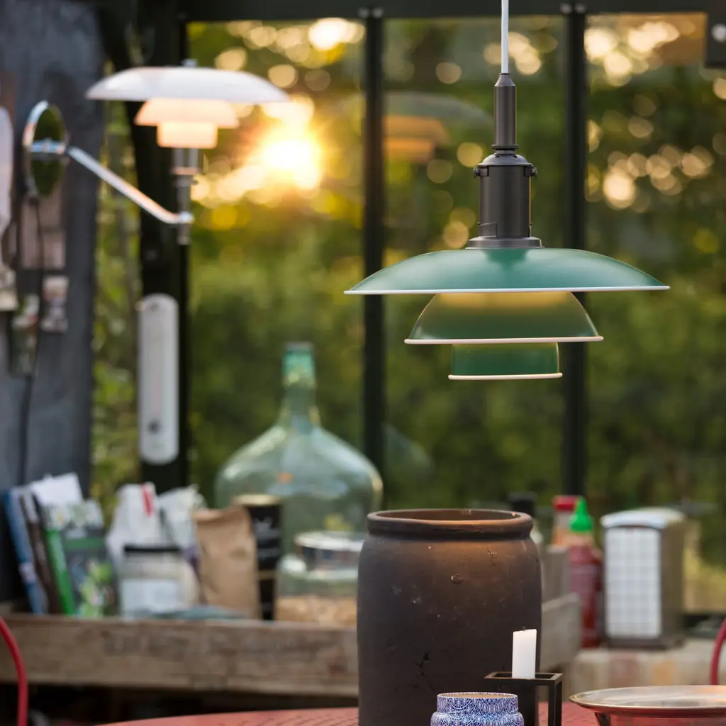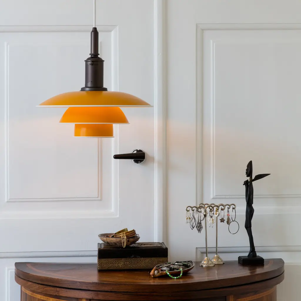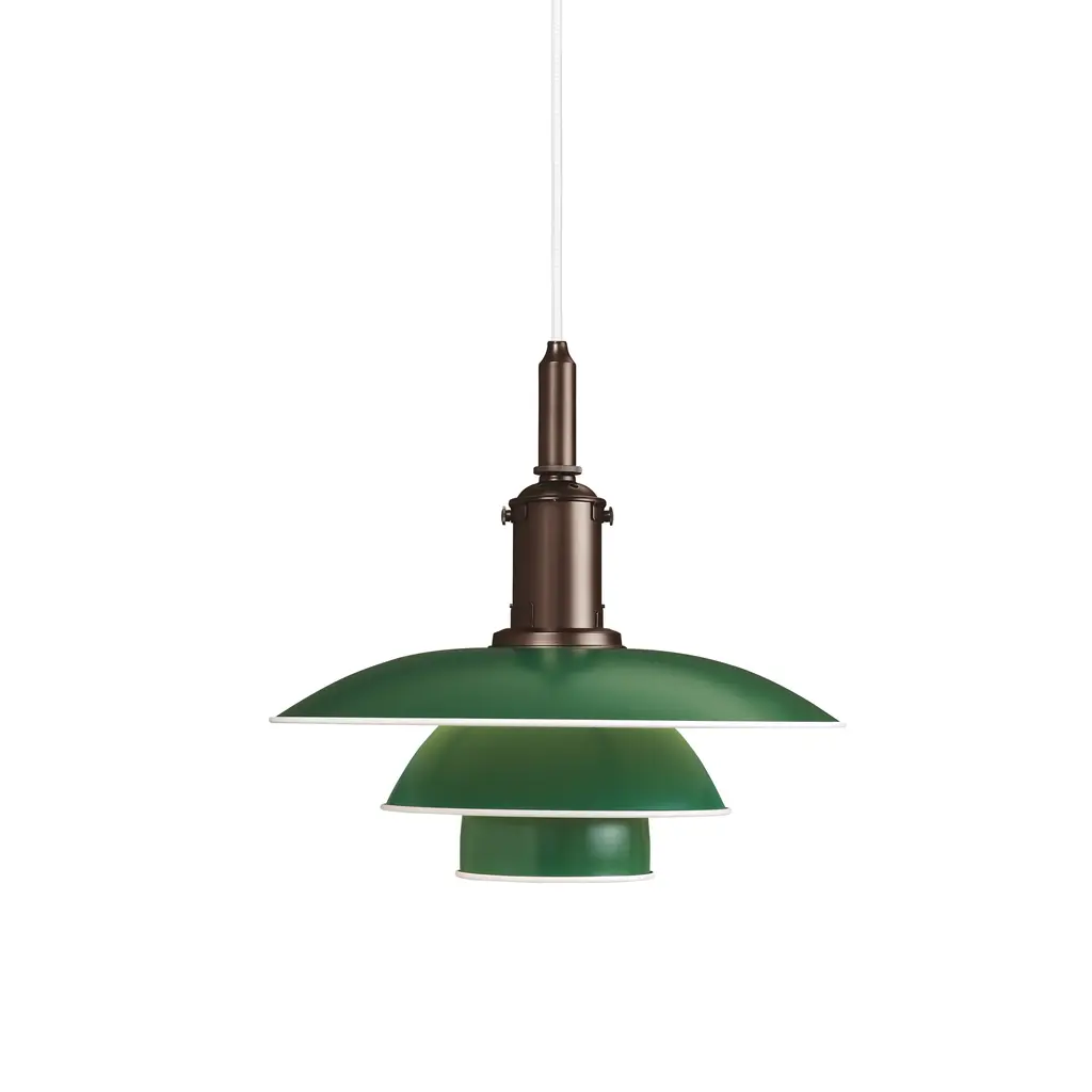 With a dash of bracing color or in clean white, Poul Henningsen's 3½-3 Pendant offers a striking update of his ingenious 3-shade lighting system developed a century ago. Each of the aluminum shades has a white-painted rolled edge, accentuating the familiar triple-level profile, and a reflective white interior that directs most of the illumination downwards in a gentle and glare-free light distribution.