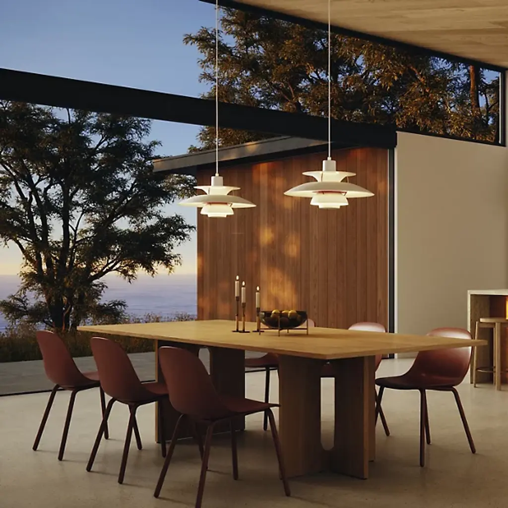 The PH 5 Pendant Light from Louis Poulsen represents Poul Henningsen's 1958 masterpiece that became synonymous with the PH brand. Henningsen developed his unique three-shade system to eliminate glare while providing comfortable light distribution directed mainly downward. The design emerged from his scientific approach to lighting, where each metal shade plays a specific role in light control. Part of the Museum of Modern Art collection, this pendant features a sandblasted glass diffuser and painted metal shades constructed from spun aluminum for uniform illumination.