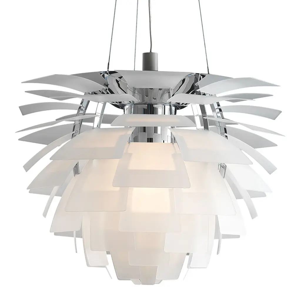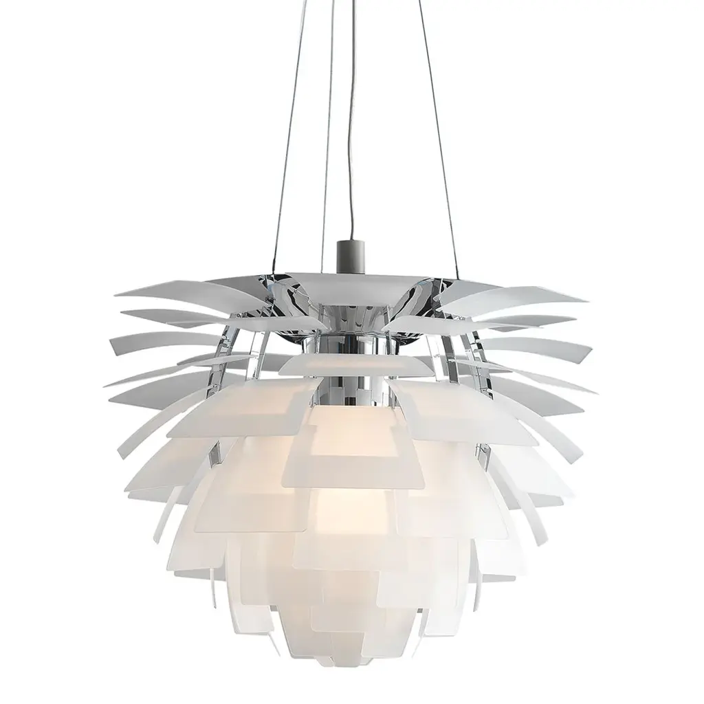 Poul Henningsen's iconic Artichoke is known worldwide. The 72 precisely positioned leaves form 12 unique rows of six leaves each. They illuminate the fixture, as well as emit diffused light with a unique pattern. Reflection from the light source is diffused in the sandblasted lower surfaces, and this light is reflected decoratively in the top surfaces, giving the fixture a unique glow. The surface treatment on the glass leaves eliminates direct glare. For the energy saving LED variant the quality of light and atmosphere surrounding the product is kept at the highest level.