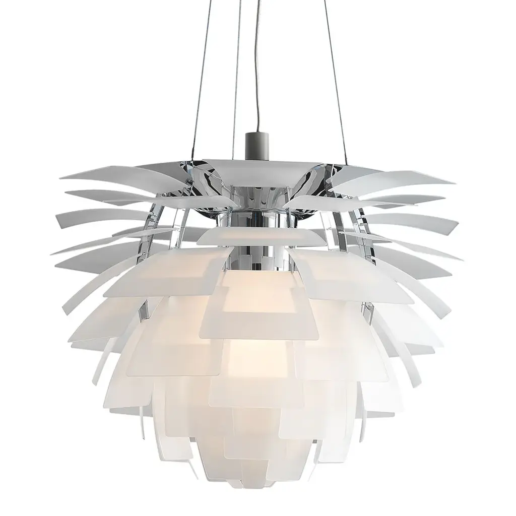 Poul Henningsen's iconic Artichoke is known worldwide. The 72 precisely positioned leaves form 12 unique rows of six leaves each. They illuminate the fixture, as well as emit diffused light with a unique pattern. Reflection from the light source is diffused in the sandblasted lower surfaces, and this light is reflected decoratively in the top surfaces, giving the fixture a unique glow. The surface treatment on the glass leaves eliminates direct glare. For the energy saving LED variant the quality of light and atmosphere surrounding the product is kept at the highest level.