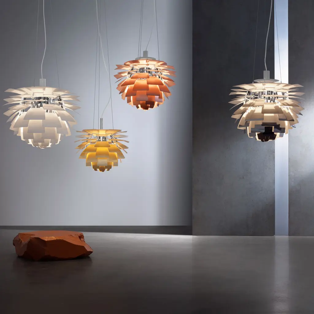 Designed by Poul Henningsen in 1958, the PH Artichoke Pendant Lamp, a design in MoMA’s collection, helped redefine modern illumination with a revolutionary form that mimics the leafy layers of an artichoke. The design was originally conceived for the Langelinie Pavilonen, a modernist restaurant in Copenhagen, where it still hangs today. Manufactured in Denmark by Louis Poulsen, the PH Artichoke Pendant Lamp features 72 precisely positioned “leaves”—made from laser-cut brushed stainless steel—that form 12 unique rows of six leaves each. The leaves illuminate the fixture as well as emitting 100% glare-free diffused light that casts unique patterns in your space. Small - 1/200W/A-23/CL Medium bulb, not included 12’-long white cord. Installation required. All Artichoke Pendants are delivered on a pallet.