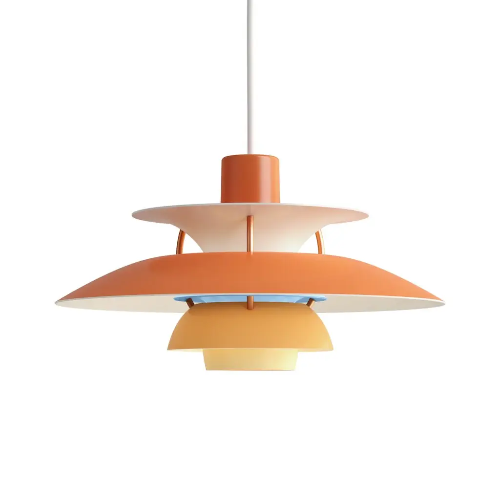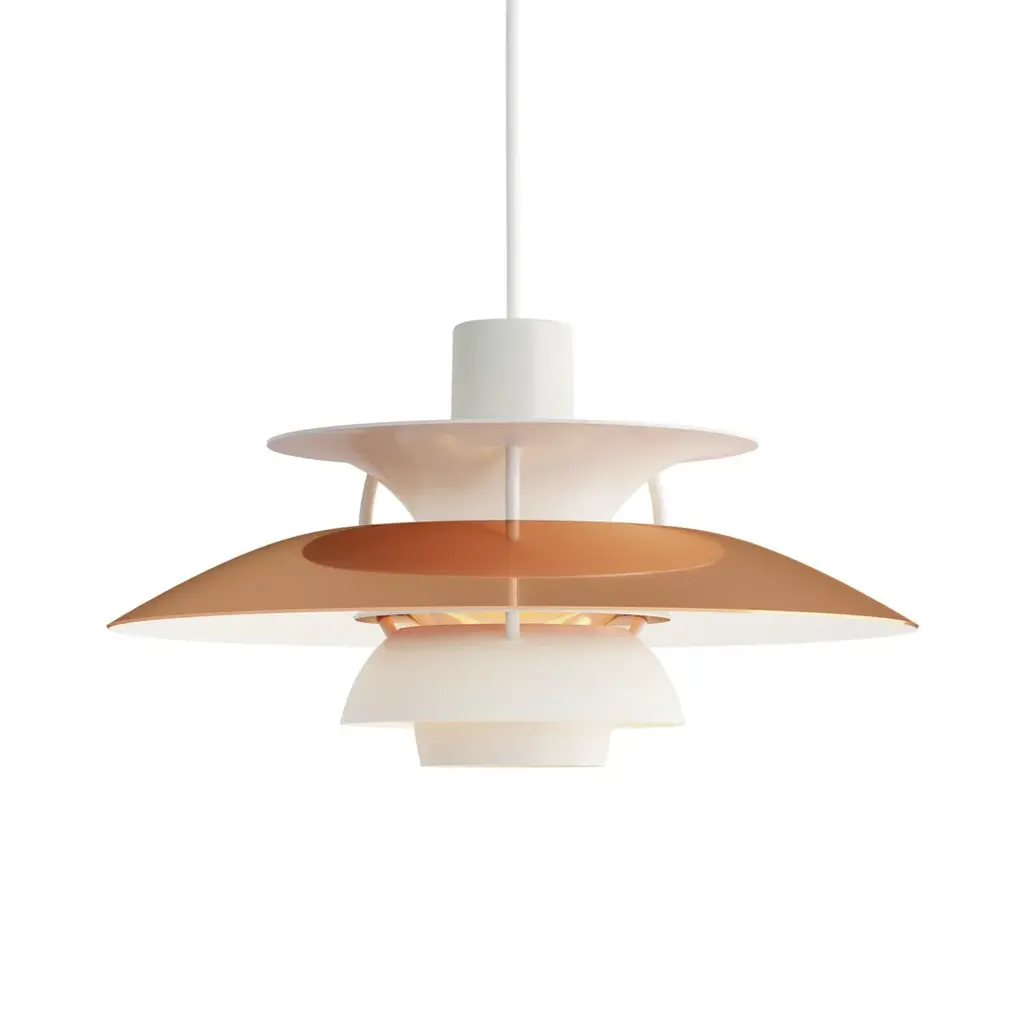 The PH 5 Mini, with a diameter of 30 cm, is a scaled down version of the iconic PH 5 (50 cm in diameter). Poul Henningsen developed the PH 5 in 1958 in response to constant changes to the shape and size of incandescent bulbs by bulb manufacturers. The PH 5 was introduced as a classic new product, and no one knew at the time that it would eventually become synonymous with the PH light. Irrespective of how the light is installed or the light source used, the PH 5 is and remains completely glare-free. The pendant was christened PH 5 due to the 50 cm diameter of the main shade. Poul Henningsen wanted to improve the colour reproduction characteristics of the light source in the PH 5. Small red and blue shades were therefore inserted to supplement the colour in the part of the spectrum where the eye is least sensitive – the red and blue areas – thereby subduing the light in the middle yellow-green region where the eye is most sensitive. The PH 5 design has been regularly updated as light sources have developed. Like the PH 5, the PH 5 Mini is available in the classic white version, a modern white model and in six colour versions, where the colour is darkest at the top and gradually lightens moving down from shade to shade. The struts are purple on the ‘classic' model and bronze-coloured on the other seven versions. The reflector ring colour contrasts with the other hues. To celebrate the 60th anniversary in 2018 of this beloved pendant, Louis Poulsen released the PH 5 and PH 5 Mini in an edition that pairs copper shades and white tiers – and in 2019 with brass shades. The new metallic-and-white combination highlights Henningsen's shade system design and adds new dynamism to one of his most recognised forms, with the mirror-like metal tiers reflecting their surroundings. The metal shades a untreated and will patinate over time.