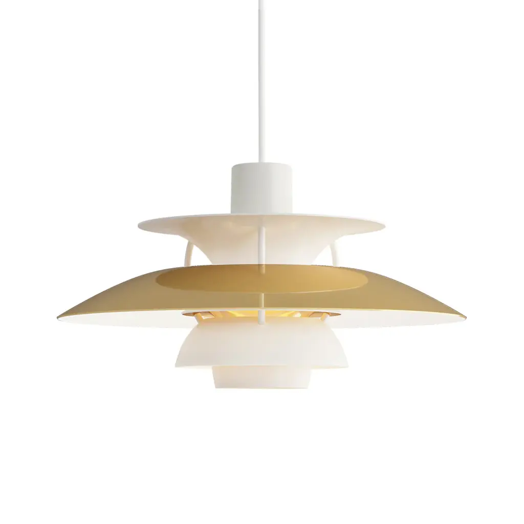 The PH 5 Mini, with a diameter of 30 cm, is a scaled down version of the iconic PH 5 (50 cm in diameter). Poul Henningsen developed the PH 5 in 1958 in response to constant changes to the shape and size of incandescent bulbs by bulb manufacturers. The PH 5 was introduced as a classic new product, and no one knew at the time that it would eventually become synonymous with the PH light. Irrespective of how the light is installed or the light source used, the PH 5 is and remains completely glare-free. The pendant was christened PH 5 due to the 50 cm diameter of the main shade. Poul Henningsen wanted to improve the colour reproduction characteristics of the light source in the PH 5. Small red and blue shades were therefore inserted to supplement the colour in the part of the spectrum where the eye is least sensitive – the red and blue areas – thereby subduing the light in the middle yellow-green region where the eye is most sensitive. The PH 5 design has been regularly updated as light sources have developed. Like the PH 5, the PH 5 Mini is available in the classic white version, a modern white model and in six colour versions, where the colour is darkest at the top and gradually lightens moving down from shade to shade. The struts are purple on the ‘classic’ model and bronze-coloured on the other seven versions. The reflector ring colour contrasts with the other hues. To celebrate the 60th anniversary in 2018 of this beloved pendant, Louis Poulsen released the PH 5 and PH 5 Mini in an edition that pairs copper shades and white tiers – and in 2019 with brass shades. The new metallic-and-white combination highlights Henningsen’s shade system design and adds new dynamism to one of his most recognised forms, with the mirror-like metal tiers reflecting their surroundings. The metal shades a untreated and will patinate over time.