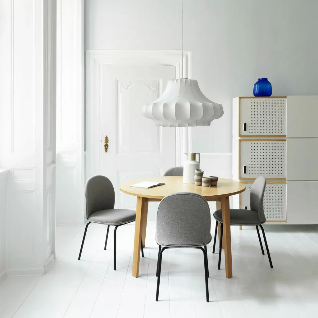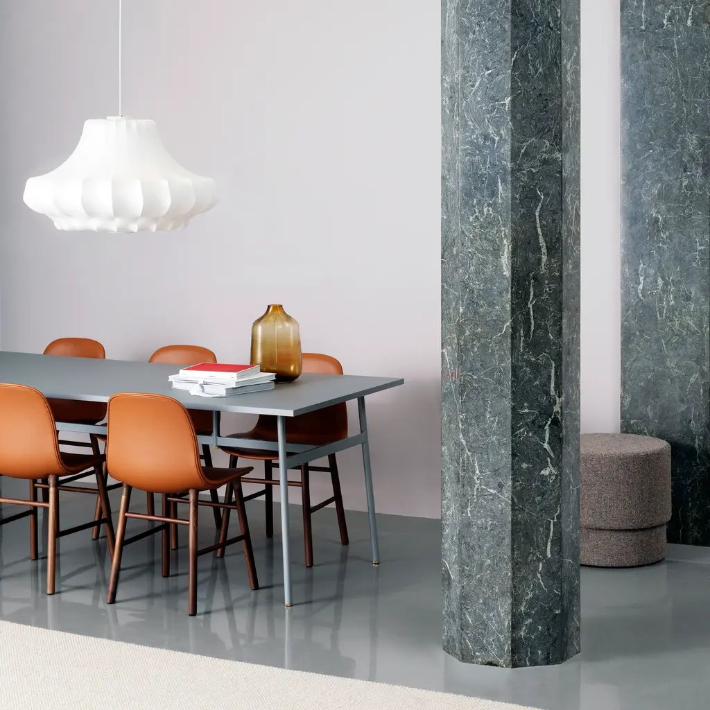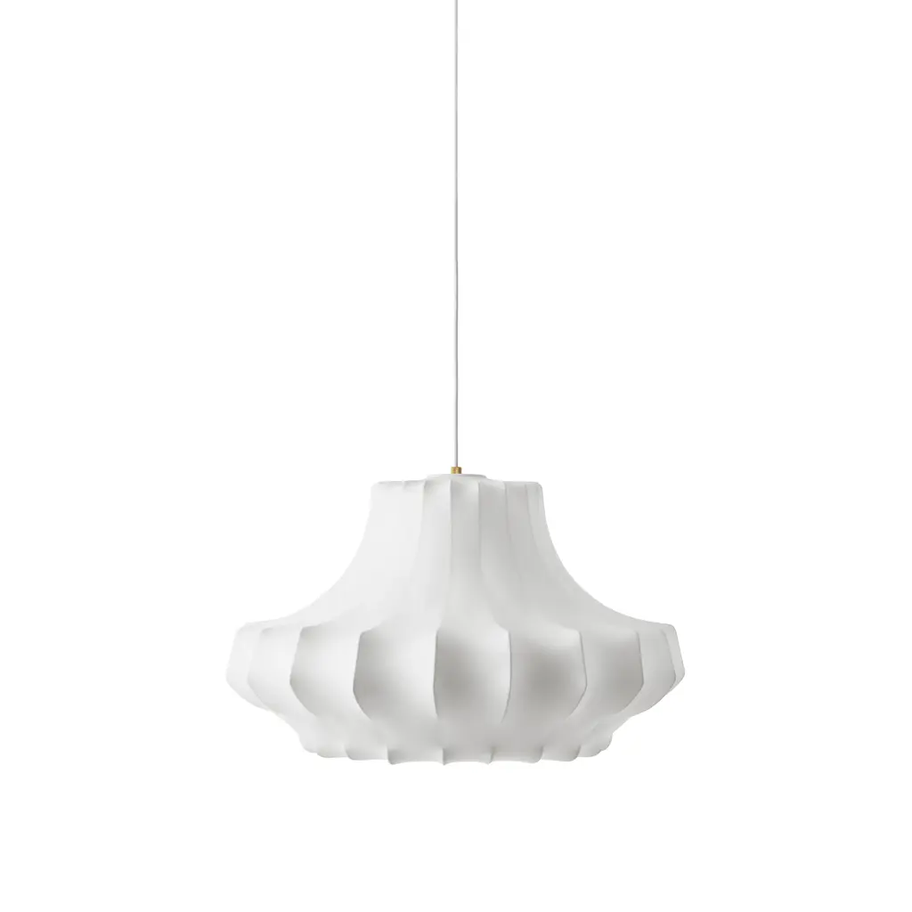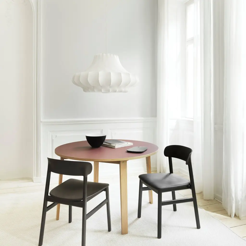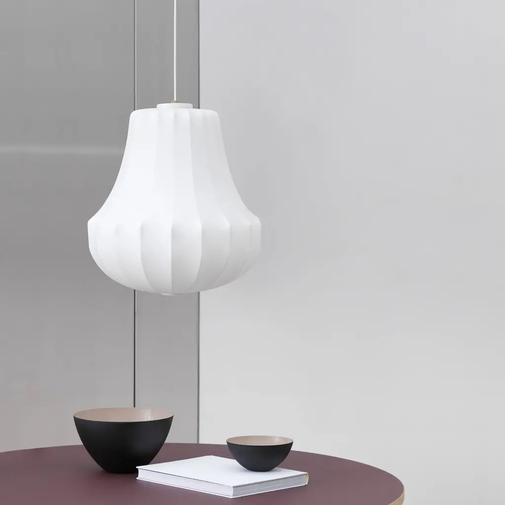 In a series of 3 sizes each with its own distinctive shape, Phantom starts with a steel skeleton, around which elastic resin is sprayed in closely-spaced threads, much like a silkworm forms its cocoon. Simon Legald’s voluminous pendant is tightly wrapped in the special semi-transparent material, yielding a dramatic silhouette inspired by an iconic chandelier of the past. Veiled in ivory as an echo of the original shape, Normann Copenhagen’s fixture emits an indirect, diffuse light that creates warm and atmospheric illumination.