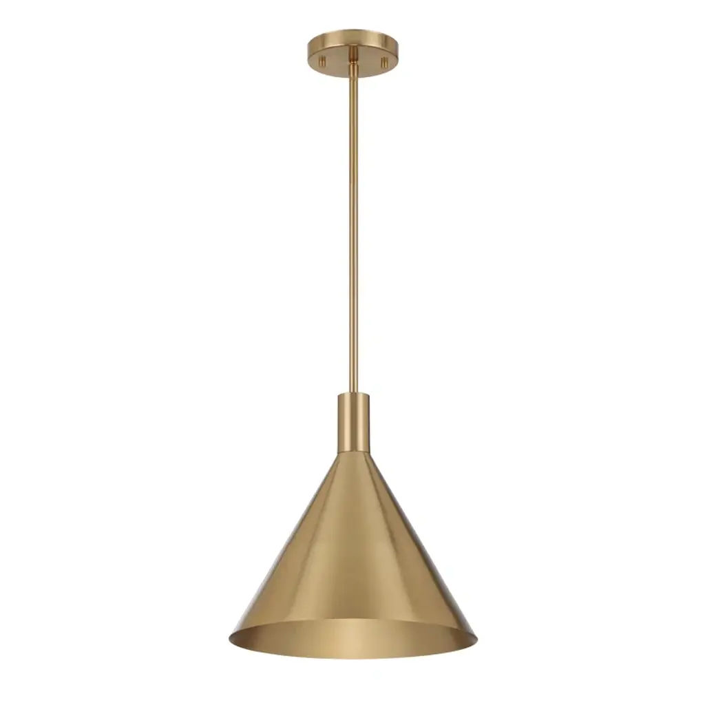 The Savoy House Pharos 1-light pendant is part of Moderne by Breegan Jane, bringing her signature approachable modern luxury style to your home. Breegan loves how metallics elevate a design, as exemplified by this opaque metal shade finished entirely in champagne-toned Noble Brass. Try using a grouping of Pharos pendants to really turn up the style. Pharos is 13" in width and has an adjustable height ranging from 13.25" to 67.25". Comes with four 12" downrods and one 6" downrod. Uses one standard size bulb of up to 60 watts. The bulb is not included.