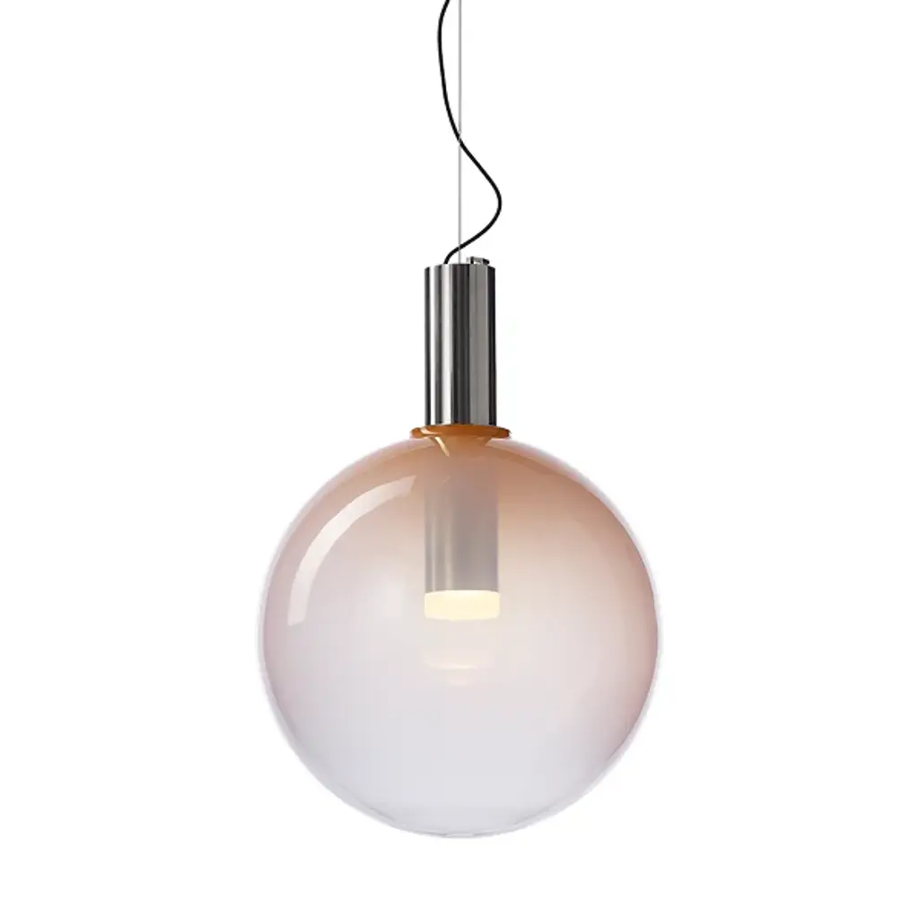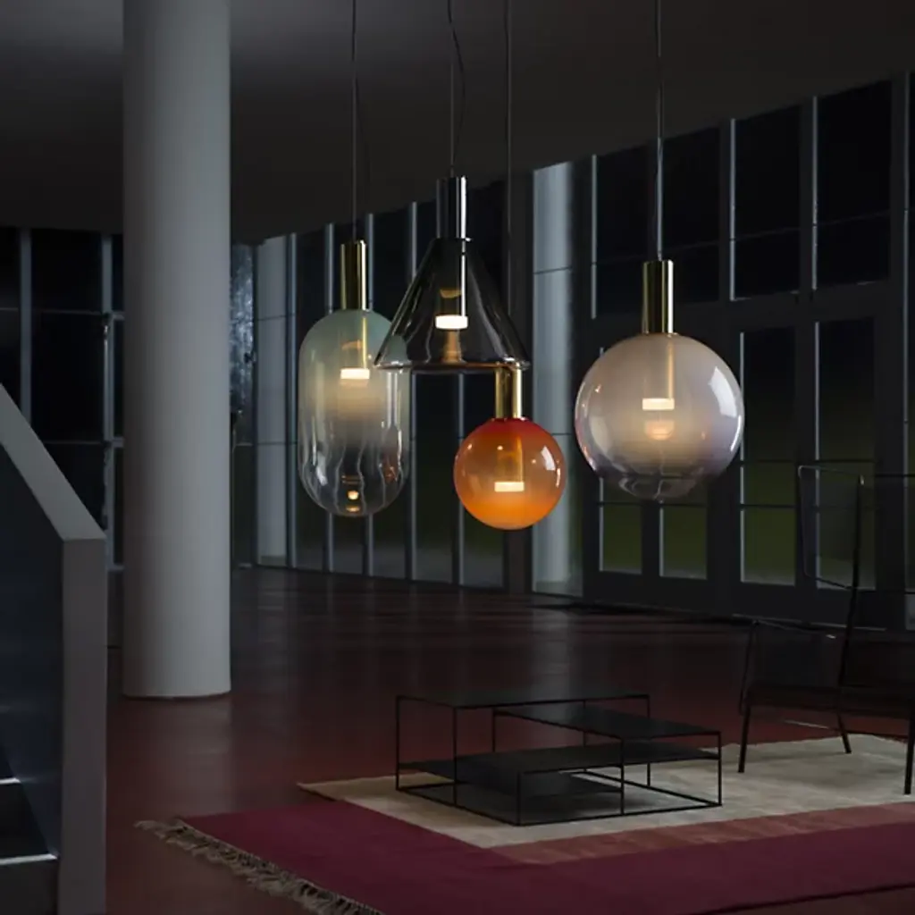 The Phenomena Globe Pendant name was chosen for this piece by Bomma and was inspired by basic geometric shapes, coming from the Greek word for ‘appearances.’ These lighting fixtures are hand-blown into a custom-made form. The color gradient is created by being gradually blown into the molten mass, as if breathing life into it. The flawlessly smooth shape of the crystal light is accented by a sophisticated, polished mounting, highlighting a perfect blend of materials and aesthetics.