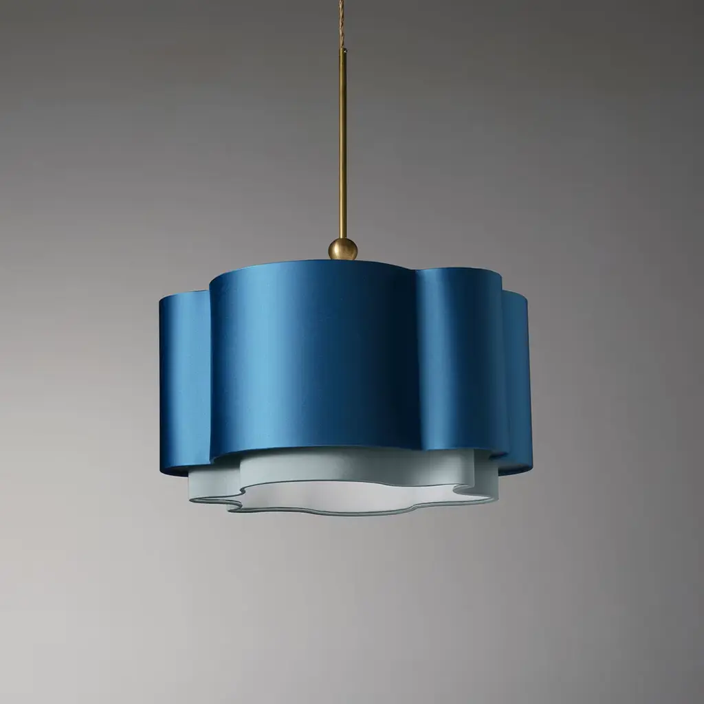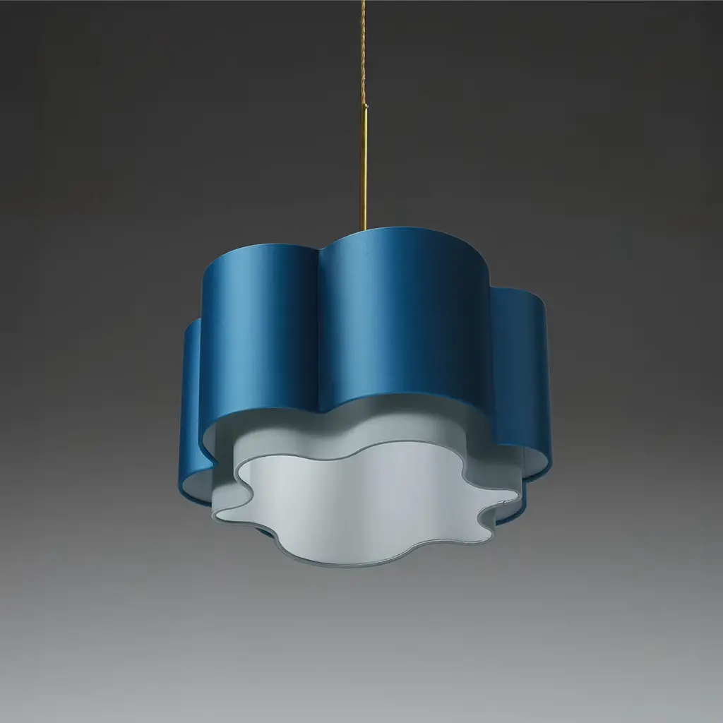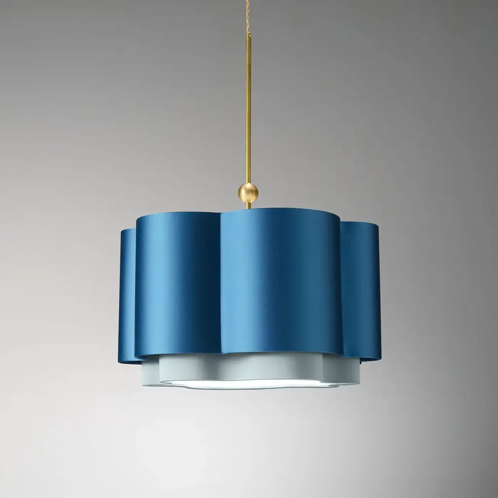 Distinguished by its sculptural elegance, the Phlox pendant lamp by Marta Laudani features two perfectly concentric lampshades that cast a dynamic interplay of light and shadow. Its soft, asymmetrical geometry adds a sense of movement, while the satin fabric allows for customizable color combinations. Suspended from a braided cord and supported by a handcrafted natural brass stem, this refined lamp seamlessly blends form and function, making it a striking modern centerpiece.