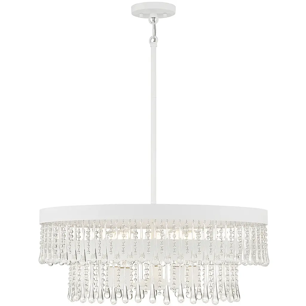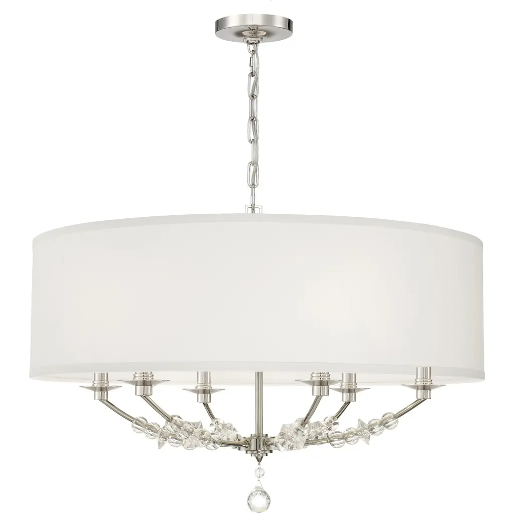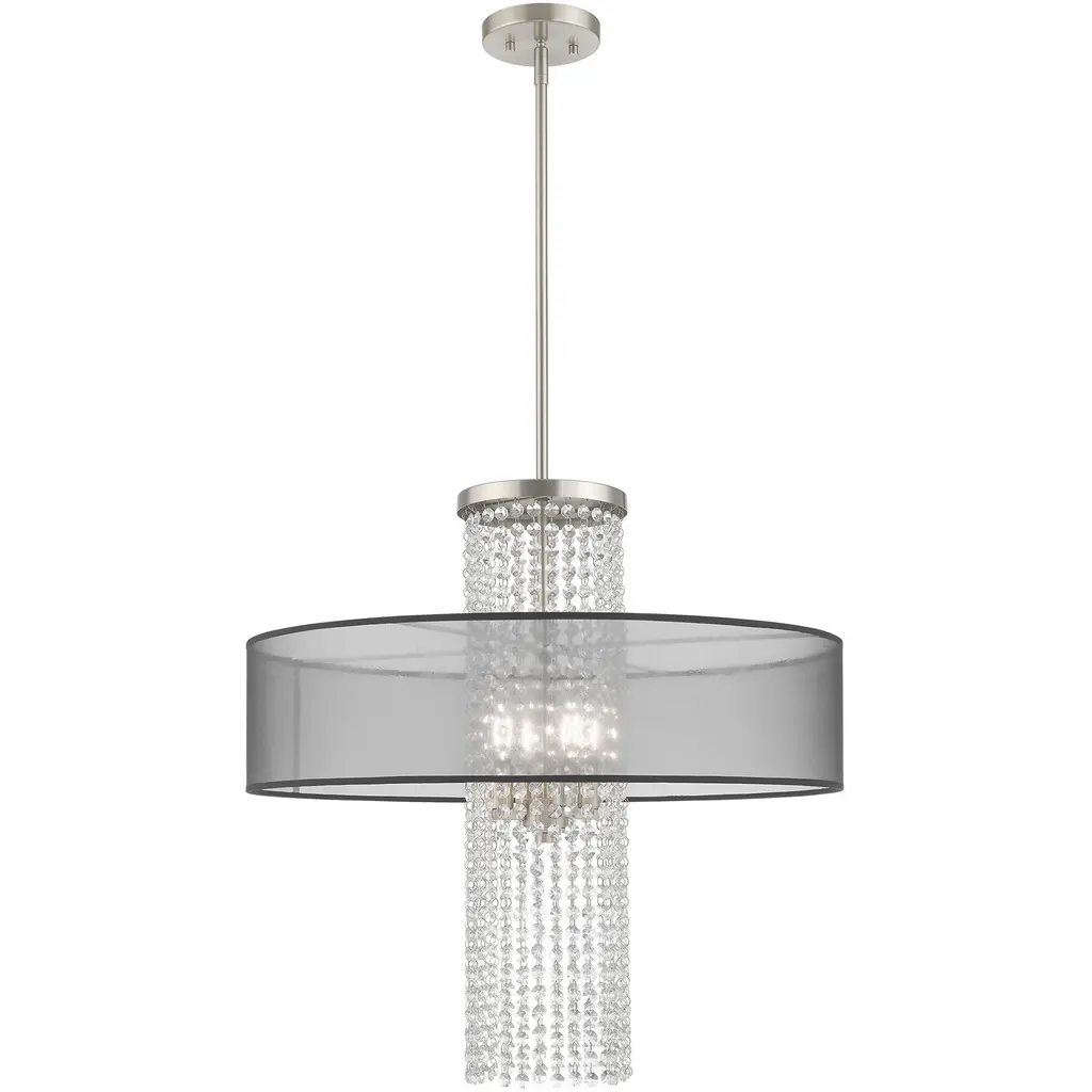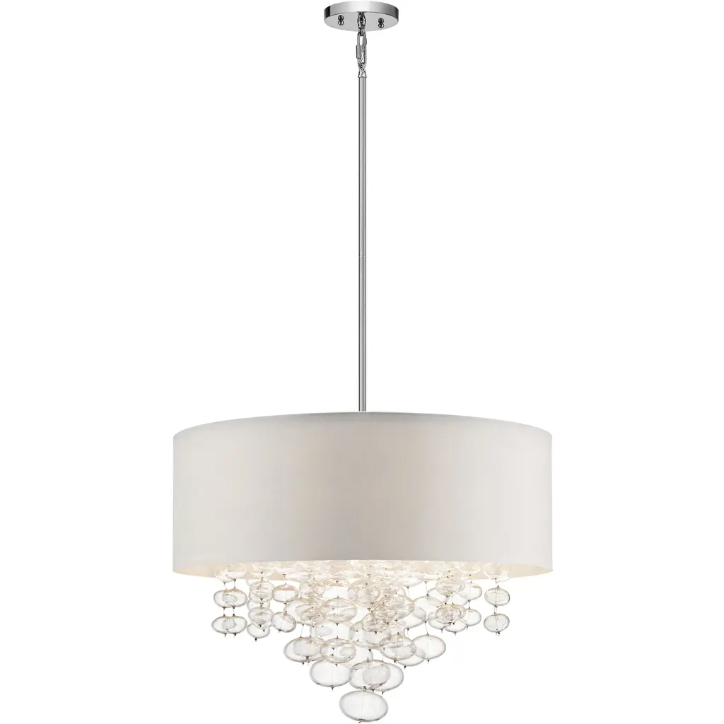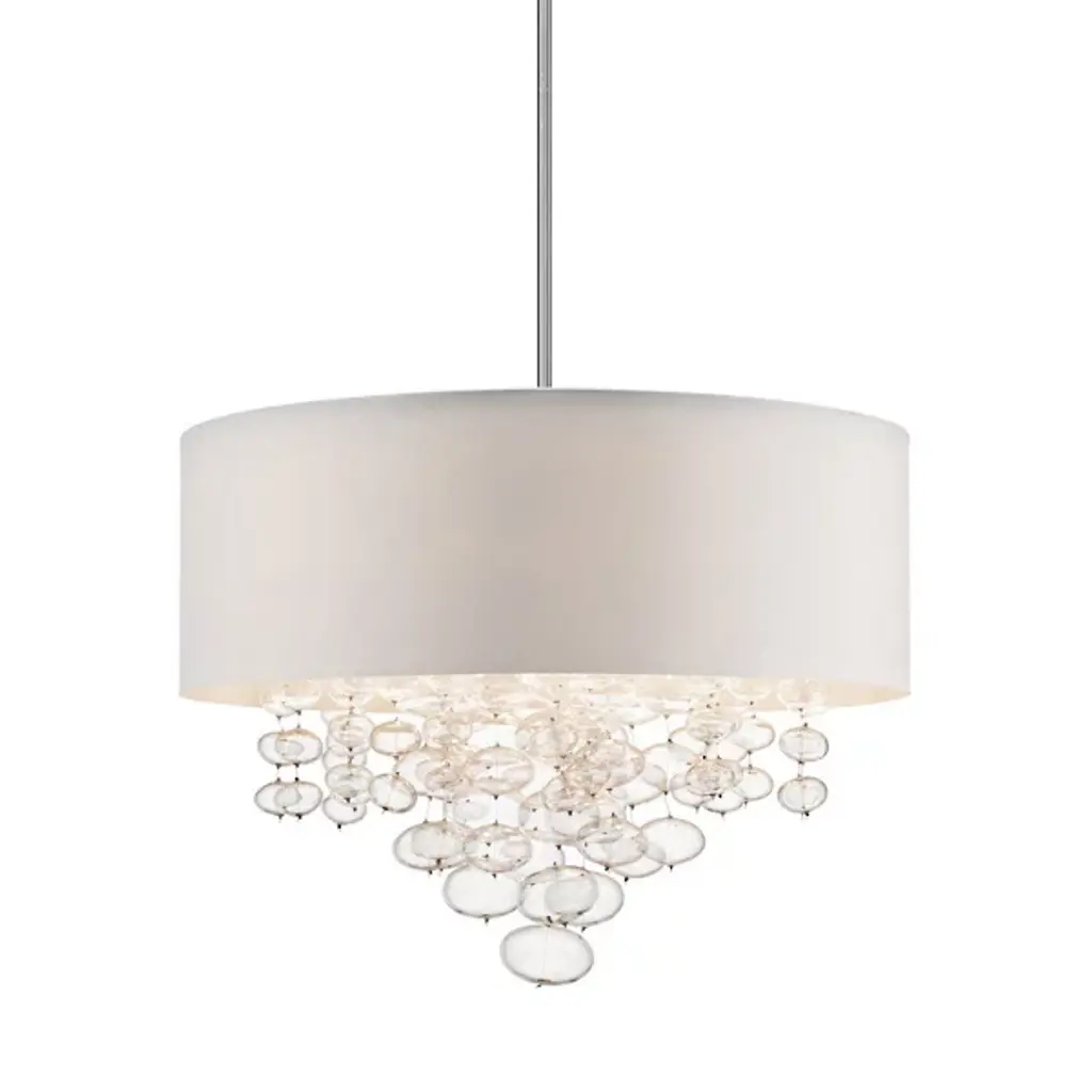 A clean and elegant demonstration of modern design, the Piatt Pendant from Elan elevates the décor of your home with ease. Descending from the ceiling with a long and thin downrod made of smooth metal, this piece consists of a wide hardback shade that contains a set of five crisp bulbs. A cluster of blown glass bubbles hangs below for additional visual appeal that comes to life as the light passes through.