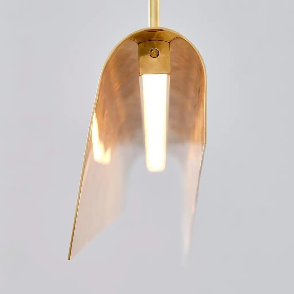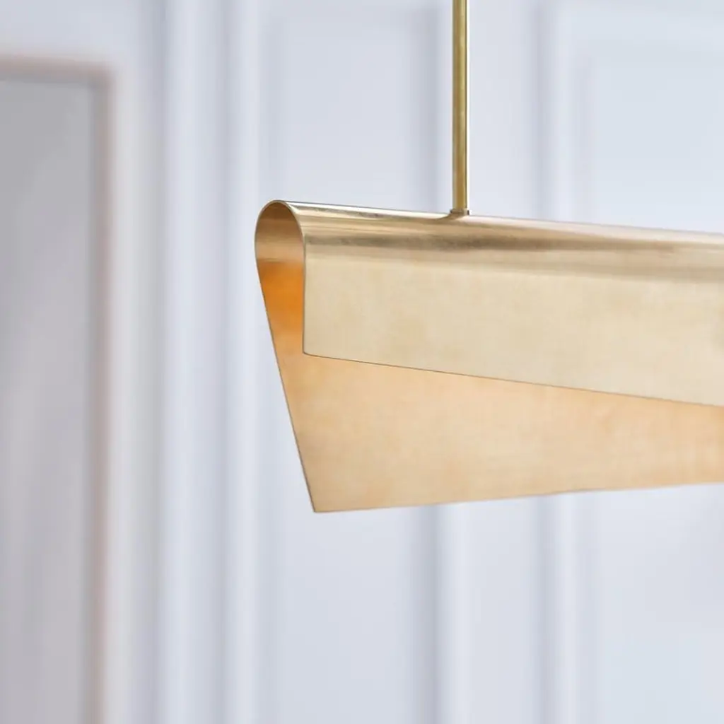 The Piel 48" Linear Pendant is a bold study in light, form, and material nuance. Harnessing the pliability of delicate metal sheeting, the fixture features a long, folded shade that appears to float midair—its curved profile sculpted with a sense of rhythm and quiet drama. The minimalist silhouette is animated by the tension between structure and softness: the fluid bends of the metal seem weightless, yet grounded in precision. A concealed light source casts a warm, downward glow that reflects off the interior curvature, creating a sense of ambient radiance and tonal depth. Perfectly scaled for kitchen islands, dining tables, and linear architectural spaces, the Piel Linear Pendant is both utilitarian and expressive—a sculptural form that elevates the surrounding space through its subtle interplay of light, shadow, and surface.