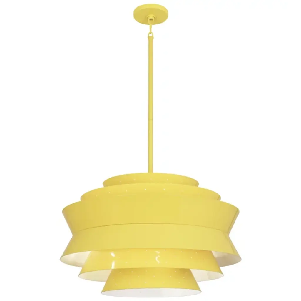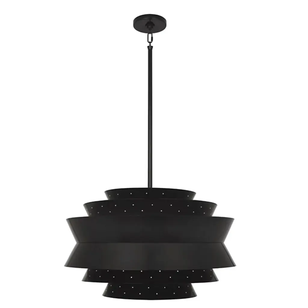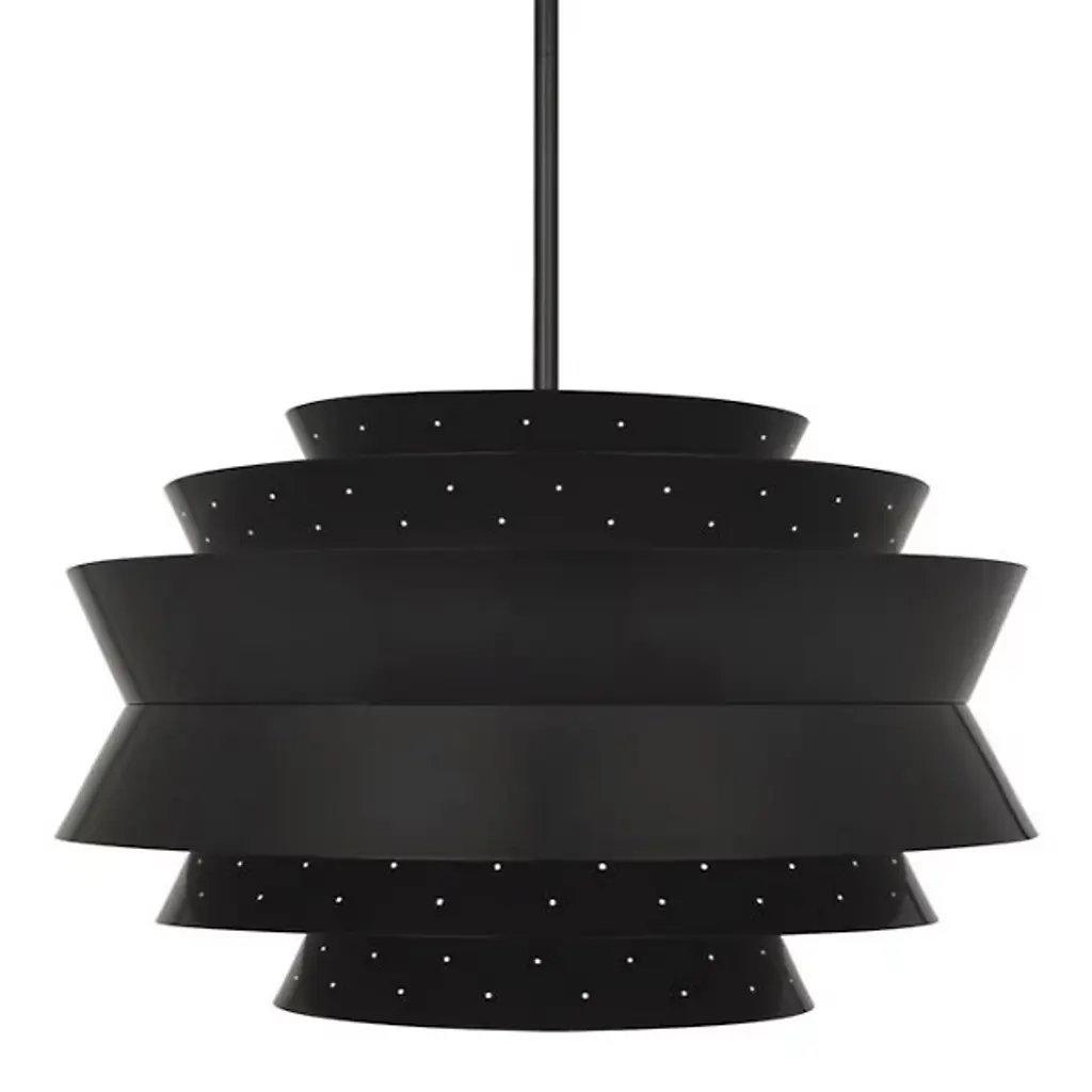 The stylish Pierce Pendant by Robert Abbey is a structural fixture with mass appeal. Its perforated steel shade is formed from a series of cylinders that convene in a tapered shape for a striking design. The perforated metal allows its warm light to permeate the shade, creating a dazzling effect that is subtle but inciting. Mounted by a rounded canopy and hung by a single sleek stem, this pendant will add a contemporary touch with retro flair.