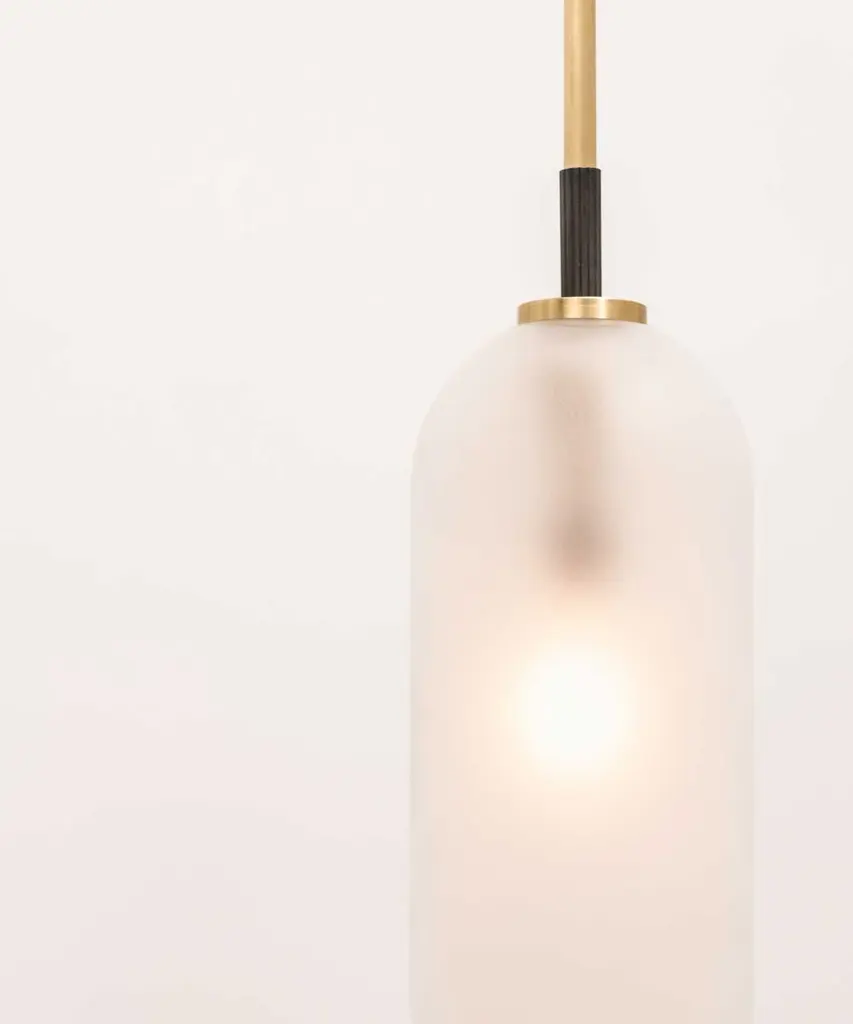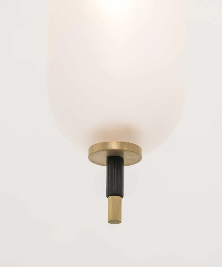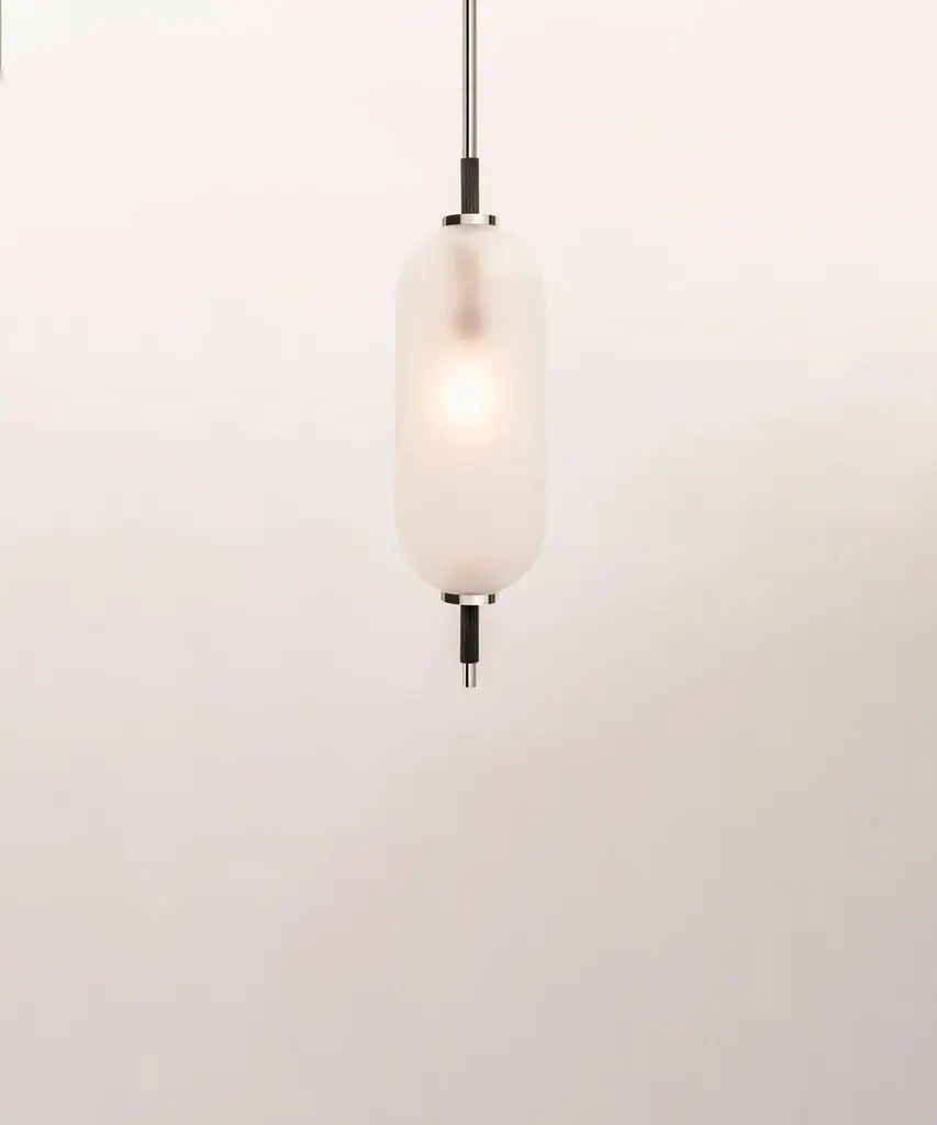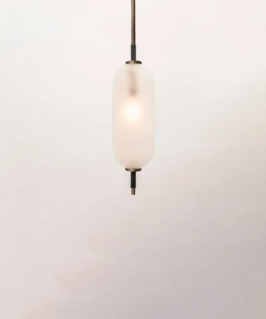 A jewel-inspired lighting series, composed of delicate metal stems and handblown, sandblasted glass orbs. The bulb inside the orb emits a diffused glow from the center of its core, for a warm, atmospheric setting. The collection is made-to-order and is available in a range of finish options. Please note, that the chandelier assumes a 25" rod length, however, it is easily customizable upon request (please email us at help@trnk-nyc.com with your specifications). Each piece is designed and hand-produced by Coil + Drift, a lauded New York's Catskill Mountains-based design studio known for its vividly three-dimensional and material-forward collections.