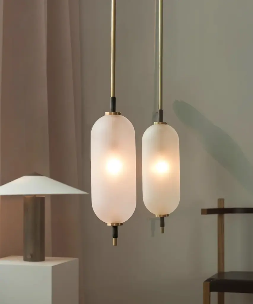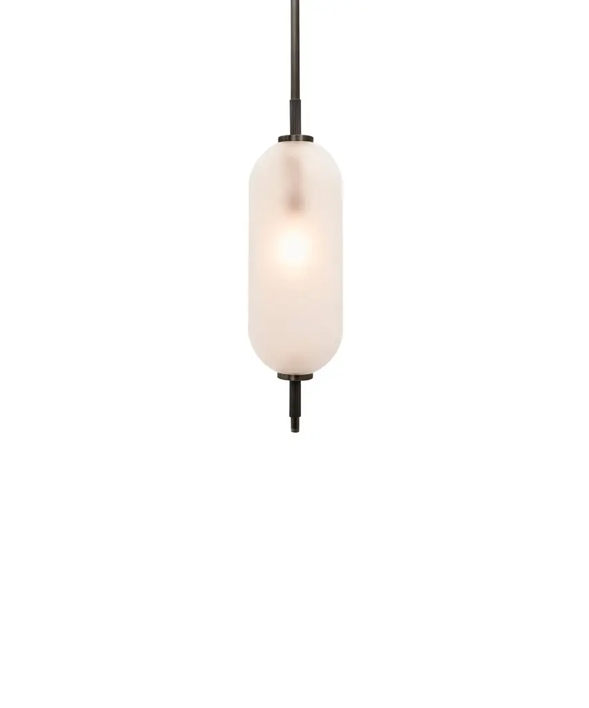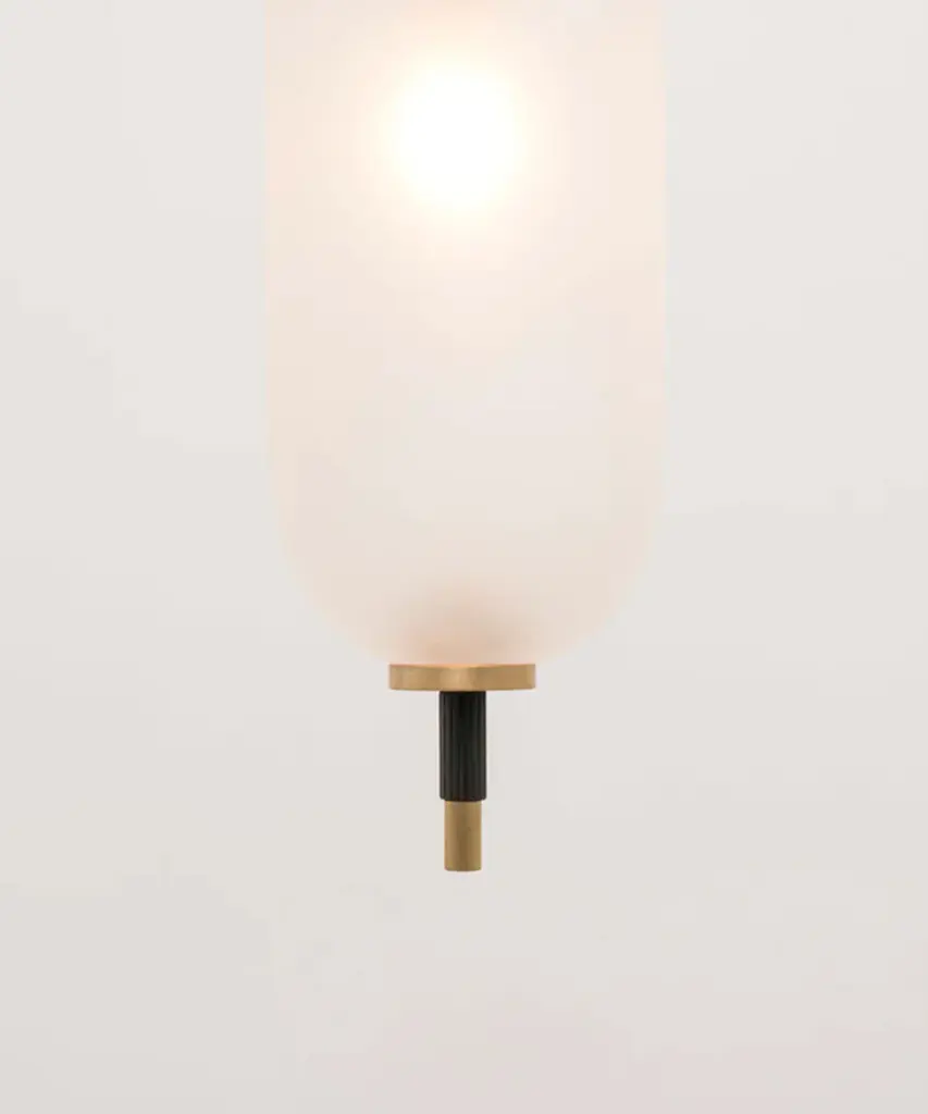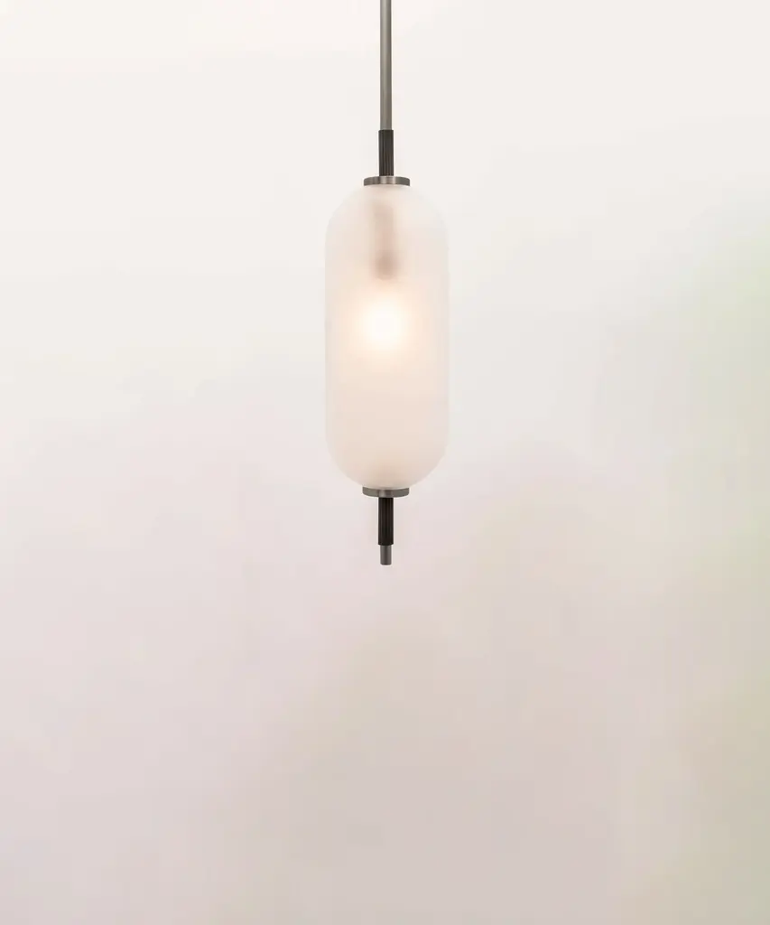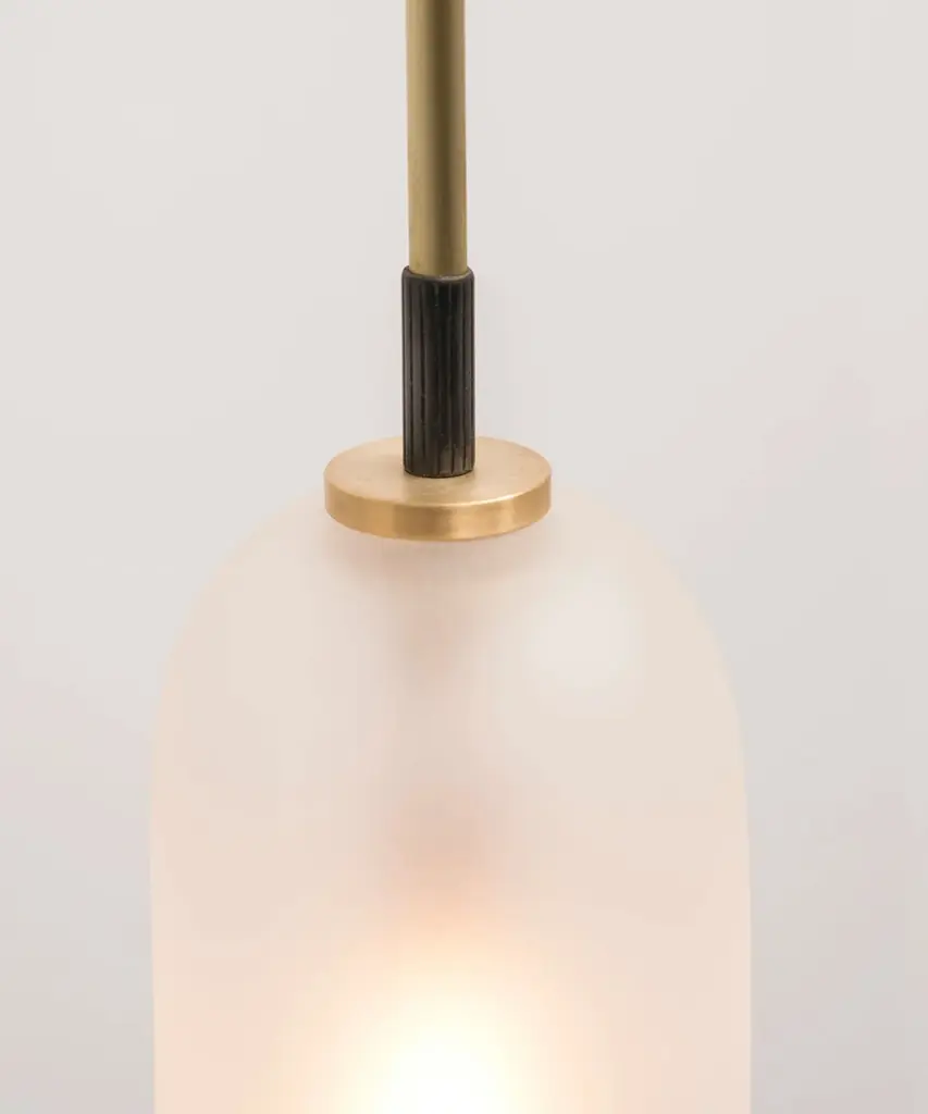 A jewel-inspired lighting series, composed of delicate metal stems and handblown, sandblasted glass orbs. The bulb inside the orb emits a diffused glow from the center of its core, for a warm, atmospheric setting. The collection is made-to-order and is available in a range of finish options. Please note, that the chandelier assumes a 25" rod length, however, it is easily customizable upon request (please email us at help@trnk-nyc.com with your specifications). Each piece is designed and hand-produced by Coil + Drift, a lauded New York's Catskill Mountains-based design studio known for its vividly three-dimensional and material-forward collections.
