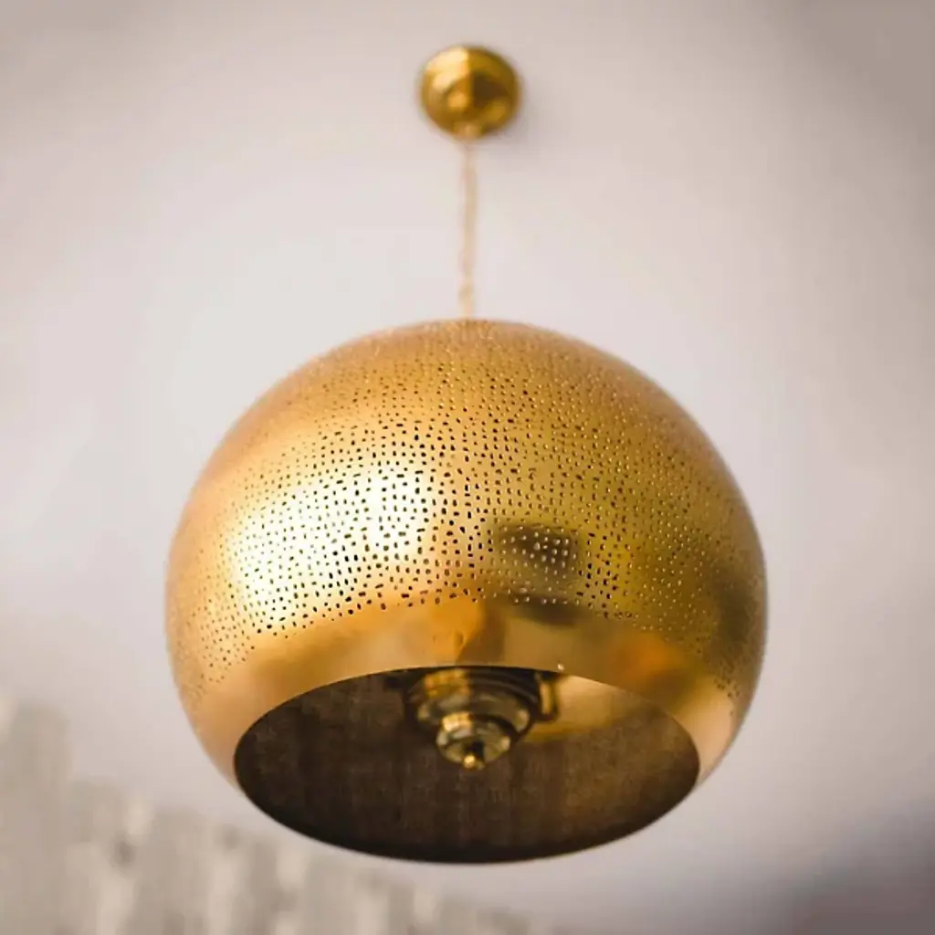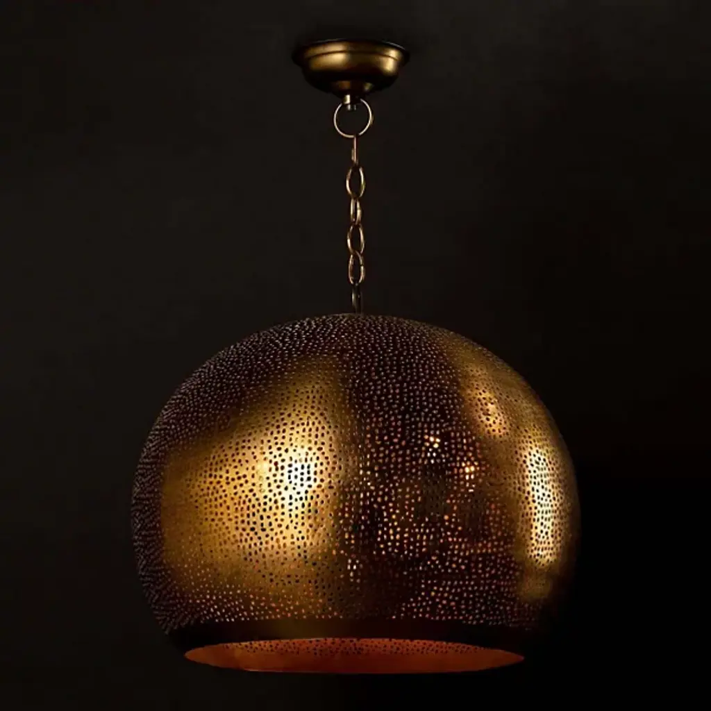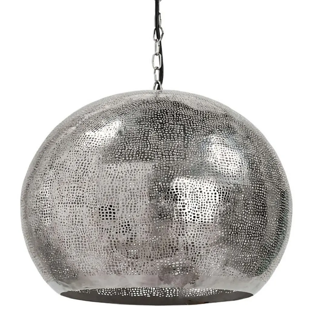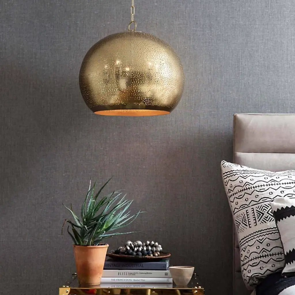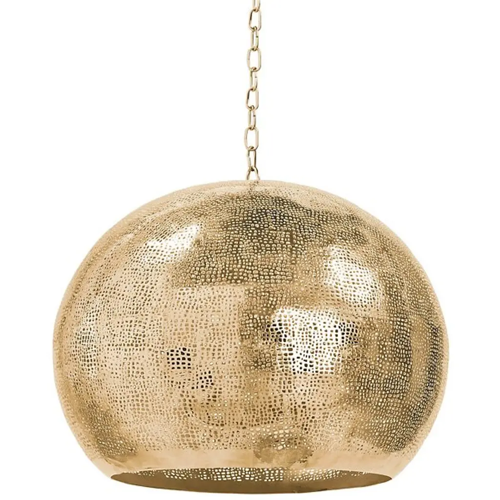 Perf-ection. The Pierced Metal Sphere Pendant by Regina Andrew is the perfect choice when layering multiple light sources throughout an interior. Its perforated metal globe shade creates an atmospheric effect when illumination shines through the small punched-out holes as well as the bottom. Suspended from a chain and cord, this contemporary ceiling fixture looks striking hanging individually in a cozy conversation corner or among a group of pendant lights above a dining area.