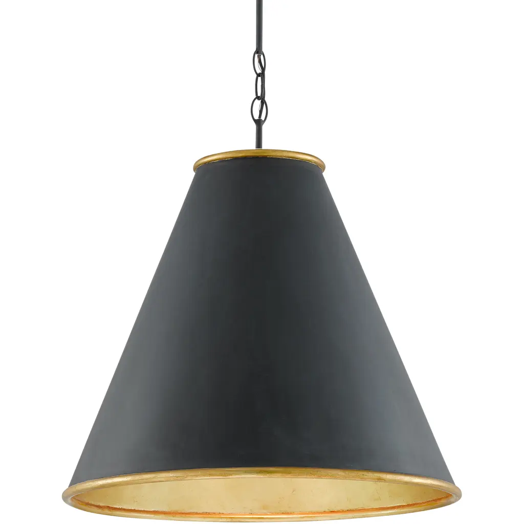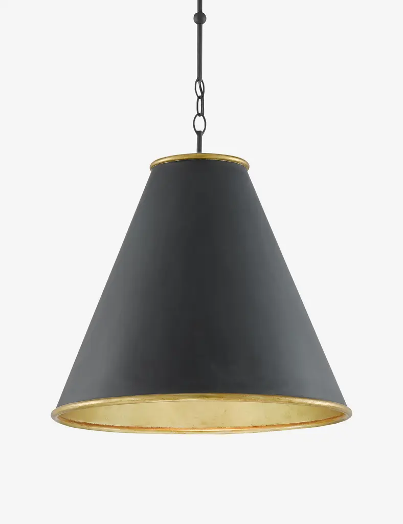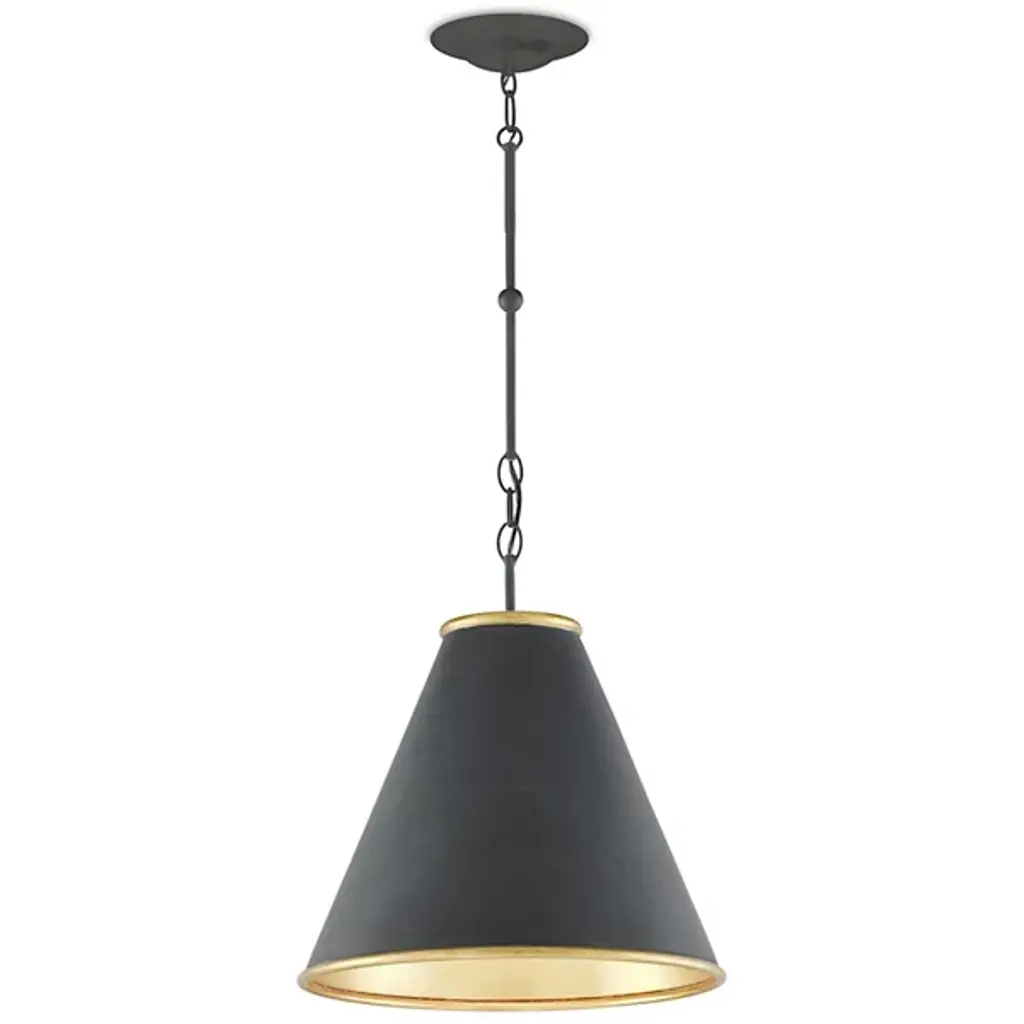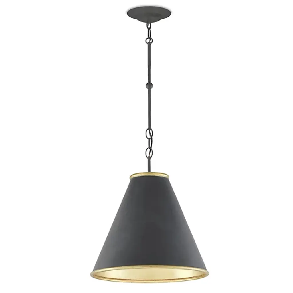 Place a powerful statement in your space with the simple build and striking lines of the Pierrepont Pendant from Currey & Company. A clean canopy sends down a slender metal stem accented by a single small sphere, connecting to the top of a downward-facing, wrought iron conical with a smoothly-surfaced interior that amplifies the lamping set within. Its exterior is accented with clean-textured rings that shine with reflected light, contrasting with the matte body that appears to absorb any excess glare.