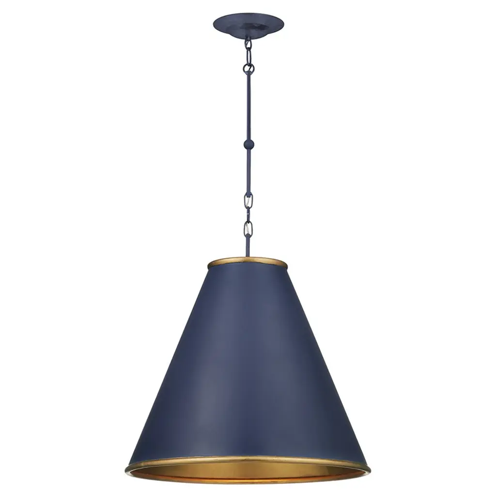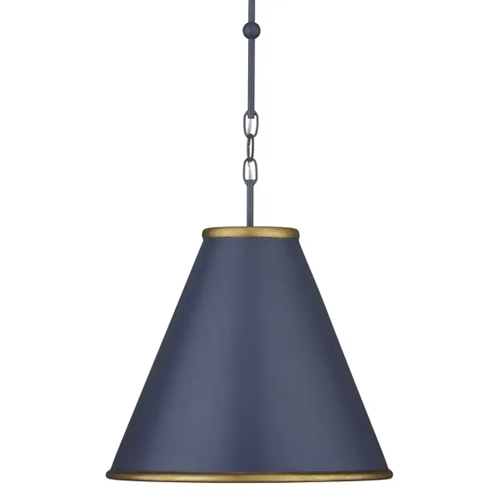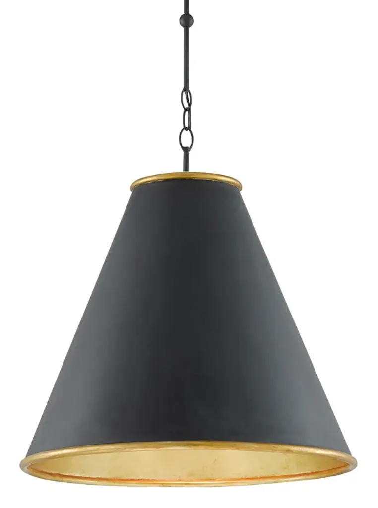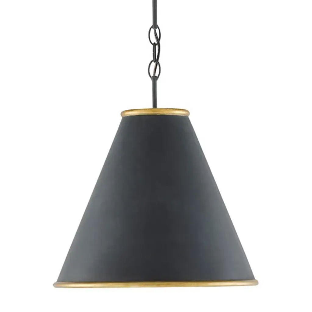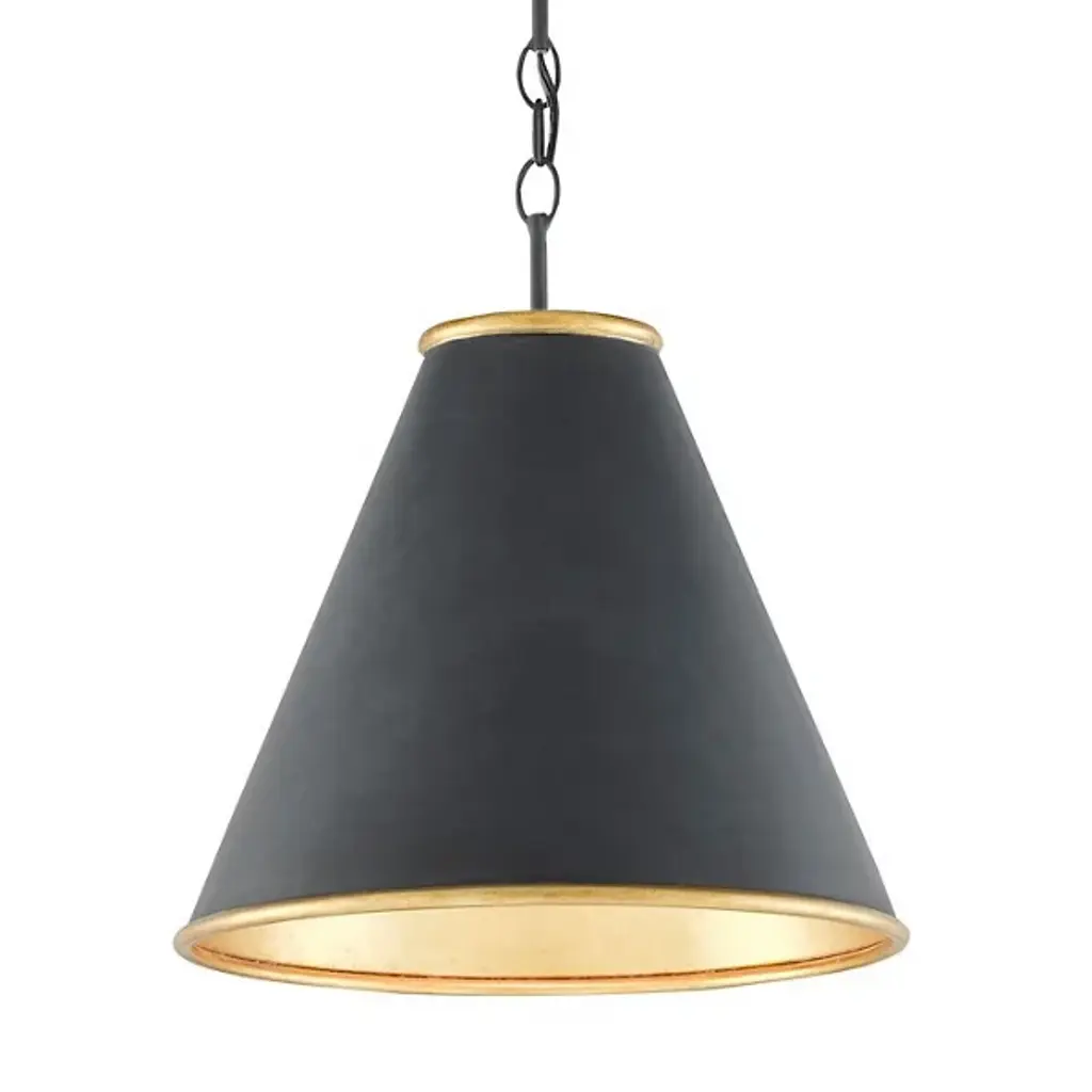 Place a powerful statement in your space with the simple build and striking lines of the Pierrepont Pendant from Currey & Company. A clean canopy sends down a slender metal stem accented by a single small sphere, connecting to the top of a downward-facing, wrought iron conical with a smoothly-surfaced interior that amplifies the lamping set within. Its exterior is accented with clean-textured rings that shine with reflected light, contrasting with the matte body that appears to absorb any excess glare.