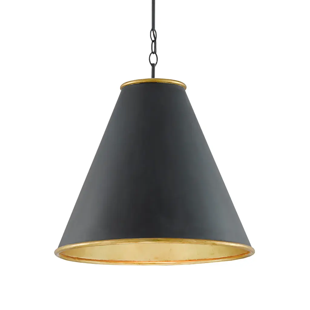 Proving that straightforward profiles can pack a punch, the Pierrepont Pendant has a sophistication to its design that eclipses its simple megaphone shape. Made of wrought iron, the exterior of the shade has been treated to an antique black or Gesso white finish. The interior is finished in a contemporary gold leaf, and the rings edging the exterior of the shade at the top and bottom gleam in a painted gold finish. There are a number of other sizes and finishes in the Pierrepont family of fixtures that make it perfect for hanging in groups or rows. Features