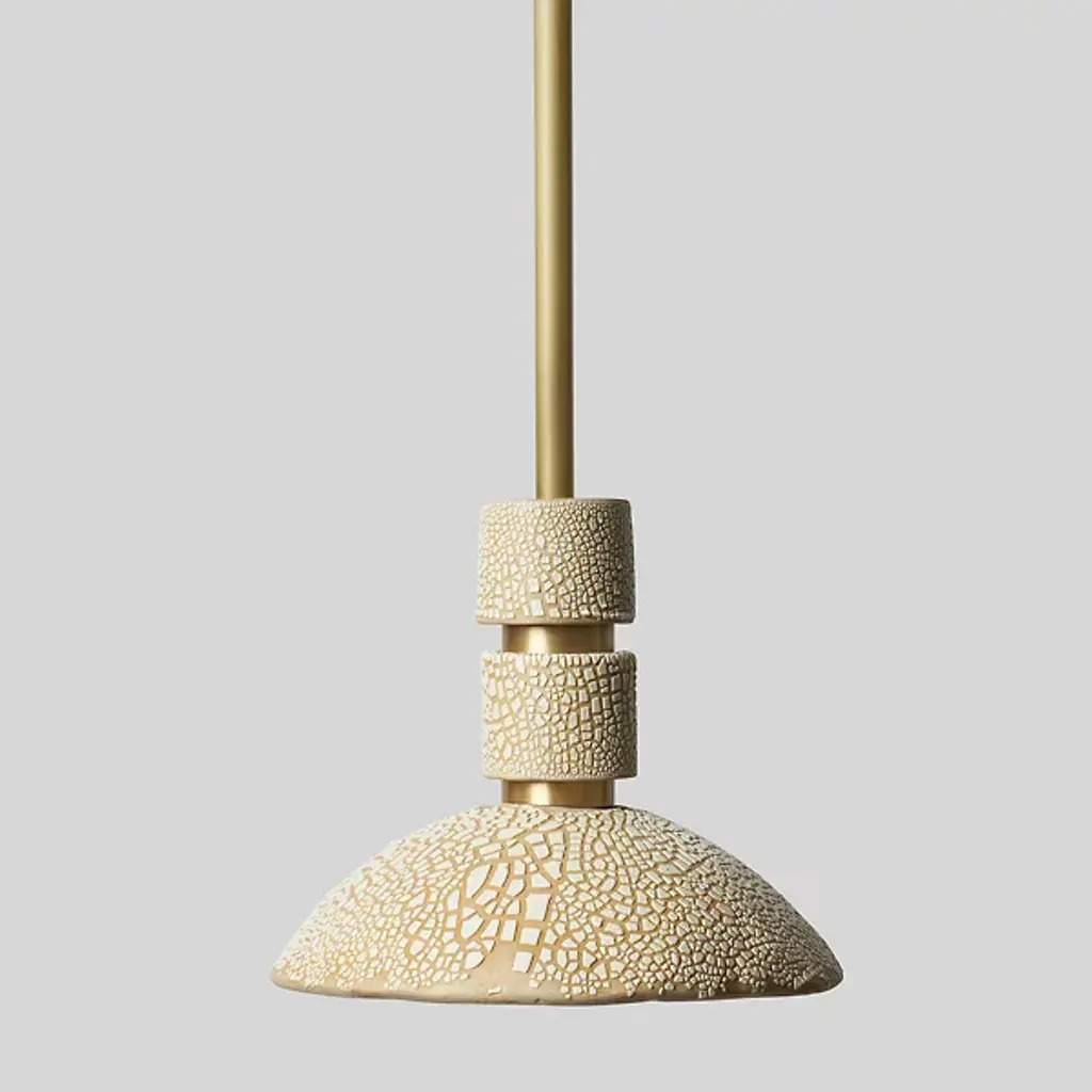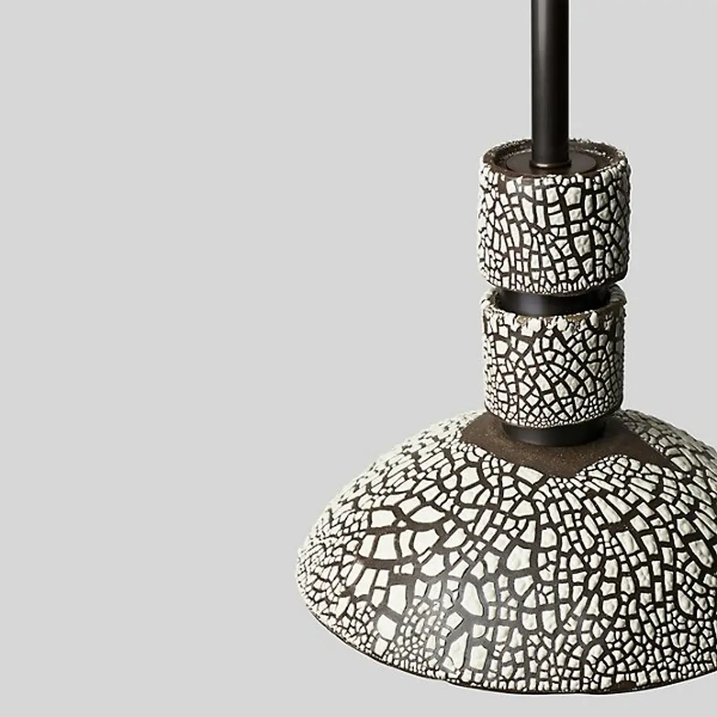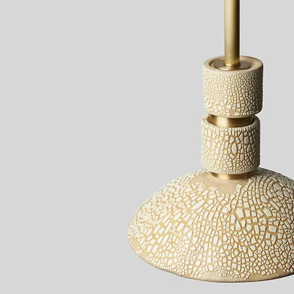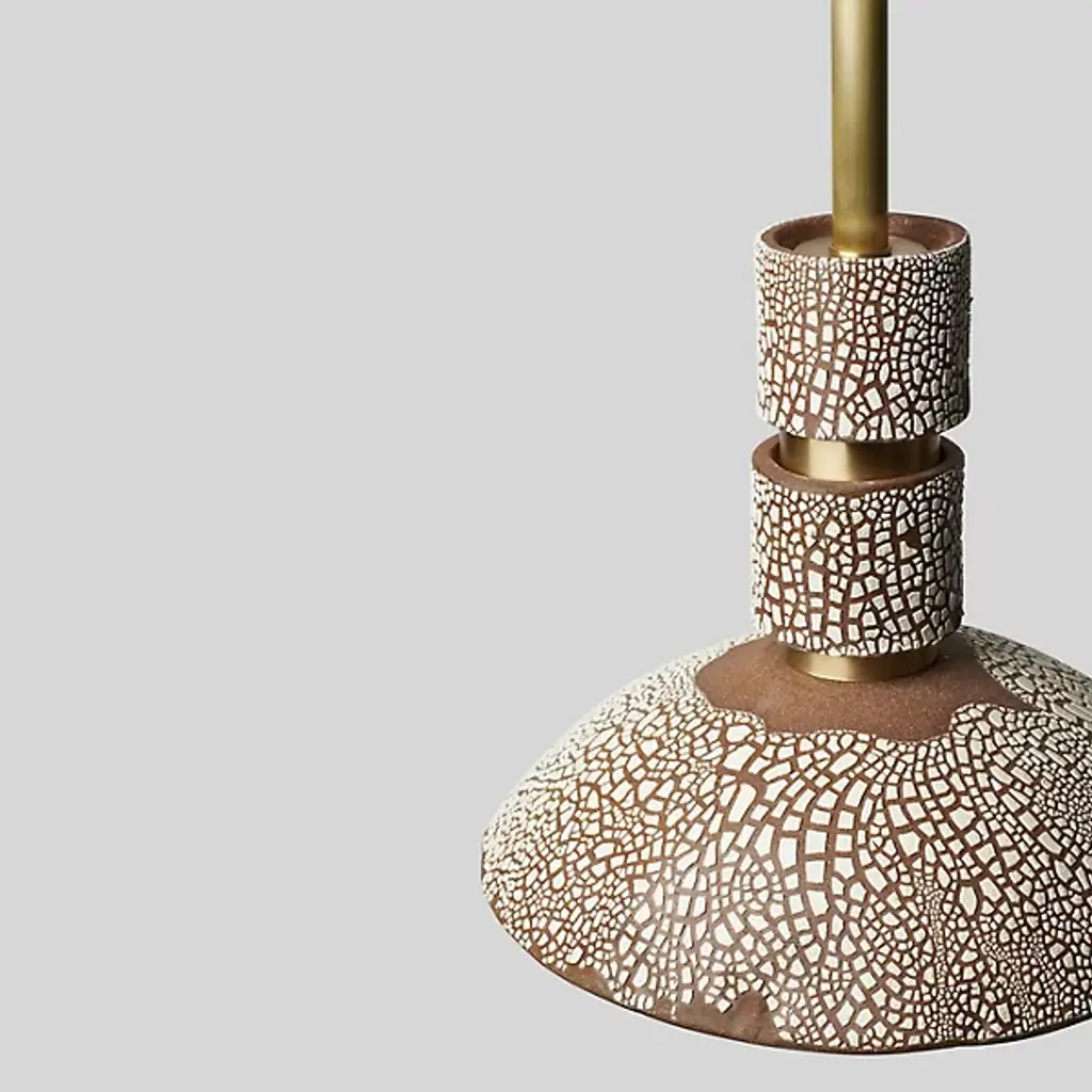 The Pilar Round Pendant from Rosie Li Studio pays homage to the tall, gripping metalwork of Brancusi’s Endless Columns with a ceramic piece heightened by a cozy light beam. This one-of-a-kind collaboration between Rosie Li Studio and Mondays Studio puts primitive, pared-down shapes in the forefront. A slender metal downrod and body unite this piece with a tidy finish. Artisans apply handmade ceramic shapes to the body, like a grand column. These shapes mesmerize up close as an earthen glaze defines their distinct texture. The evocative silhouette stands out as a warm down glow softly scatters below with minimal glare.