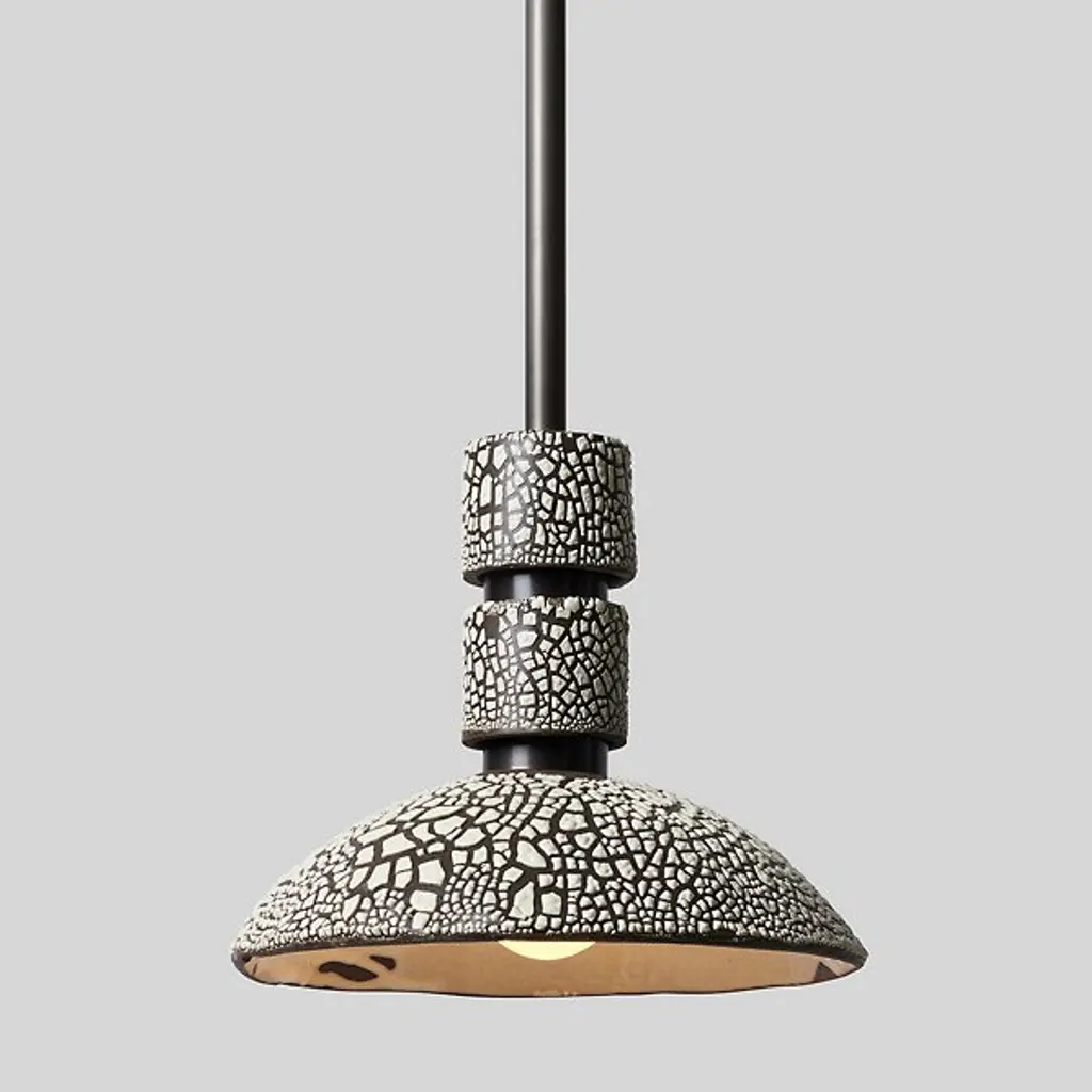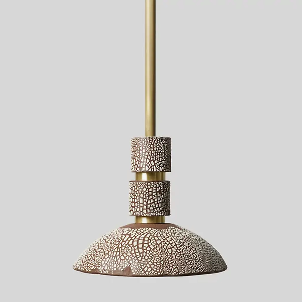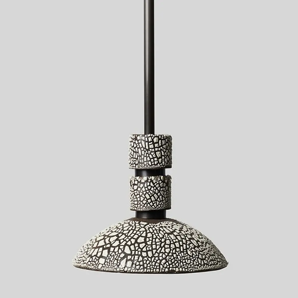 The Pilar Round Pendant from Rosie Li Studio pays homage to the tall, gripping metalwork of Brancusi’s Endless Columns with a ceramic piece heightened by a cozy light beam. This one-of-a-kind collaboration between Rosie Li Studio and Mondays Studio puts primitive, pared-down shapes in the forefront. A slender metal downrod and body unite this piece with a tidy finish. Artisans apply handmade ceramic shapes to the body, like a grand column. These shapes mesmerize up close as an earthen glaze defines their distinct texture. The evocative silhouette stands out as a warm down glow softly scatters below with minimal glare.