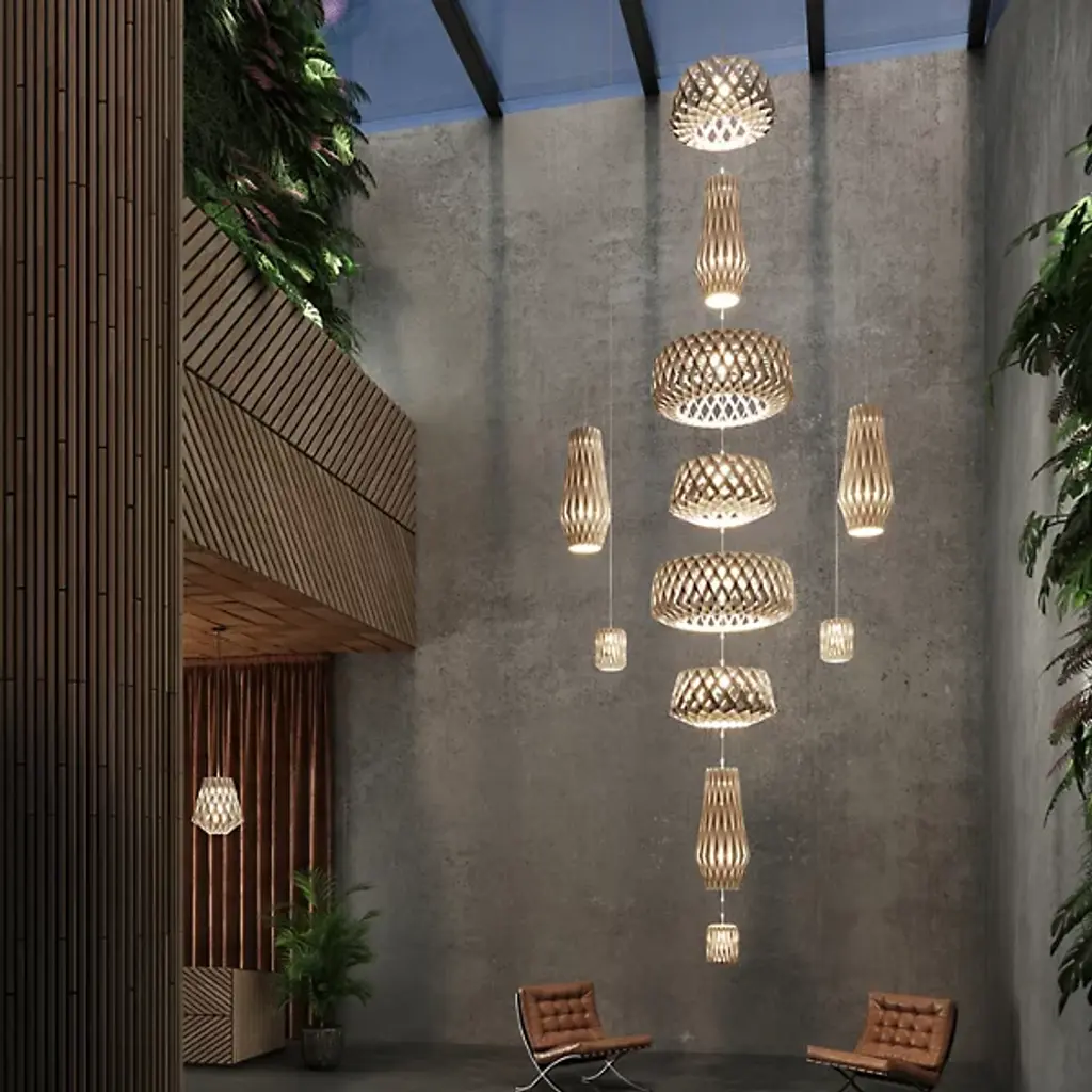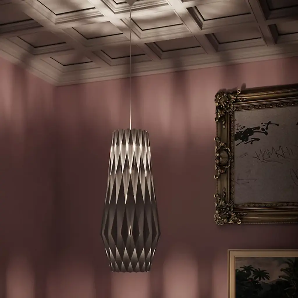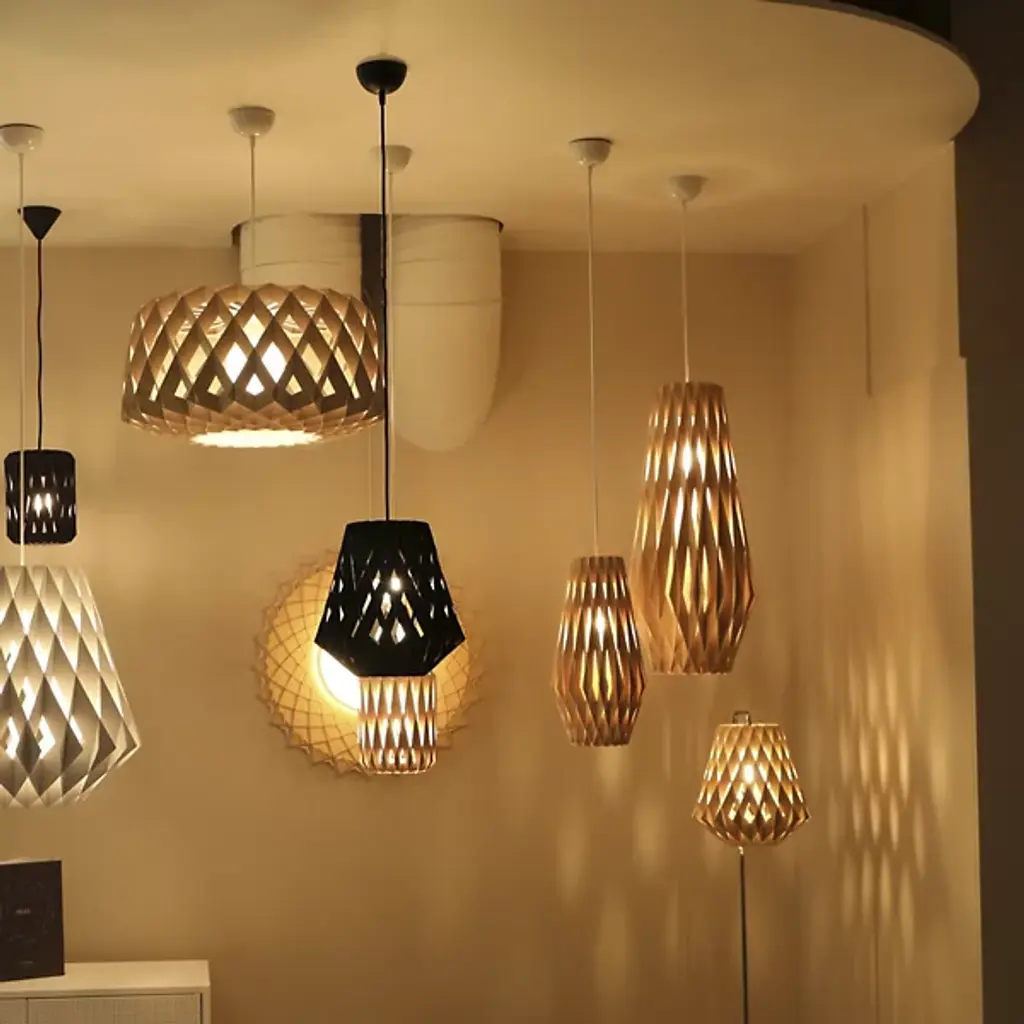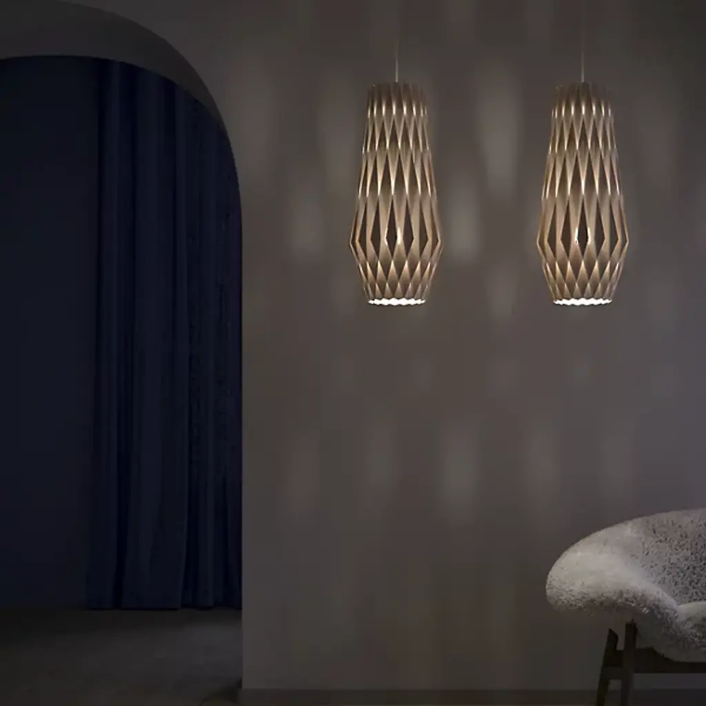 An expressive, enchanting piece, the Pilke Bell Pendant from Pilke Lights brings a simple, yet elegant form to contemporary spaces. Blending traditional Finnish handicraft style and ultramodern, computerized geometry, this fixture is made of numerous plywood slats, each smoothly interlocked to form a playful, eye-catching body. A single light within the slats illuminates the individual pieces, creating a unity of shadow and light as the clean, warm glow invites a relaxing atmosphere to your home.