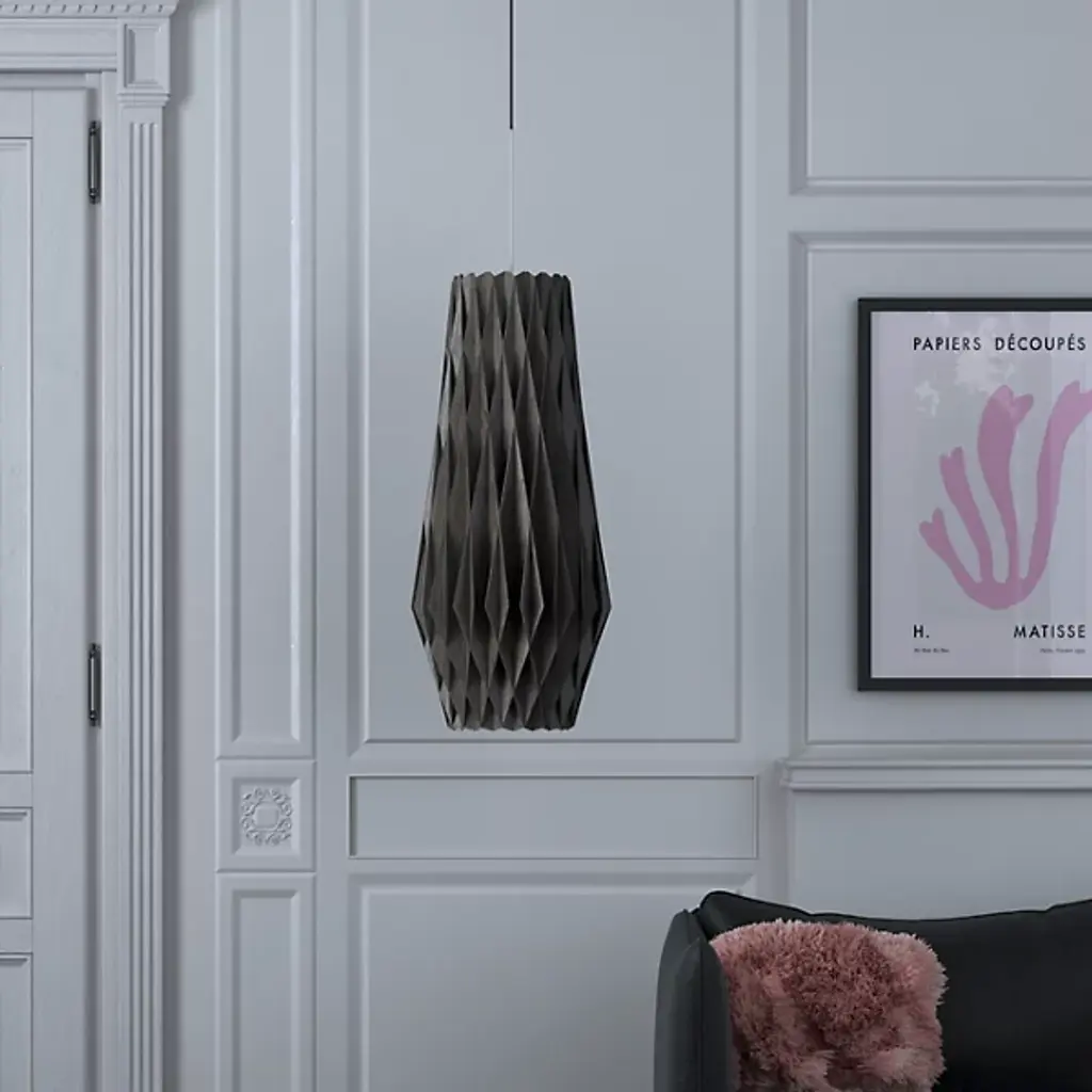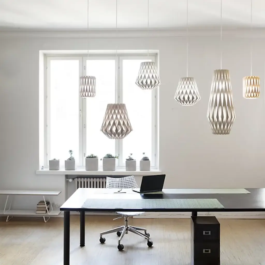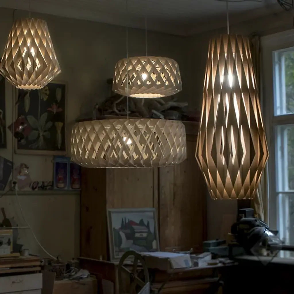An expressive, enchanting piece, the Pilke Bell Pendant from Pilke Lights brings a simple, yet elegant form to contemporary spaces. Blending traditional Finnish handicraft style and ultramodern, computerized geometry, this fixture is made of numerous plywood slats, each smoothly interlocked to form a playful, eye-catching body. A single light within the slats illuminates the individual pieces, creating a unity of shadow and light as the clean, warm glow invites a relaxing atmosphere to your home.